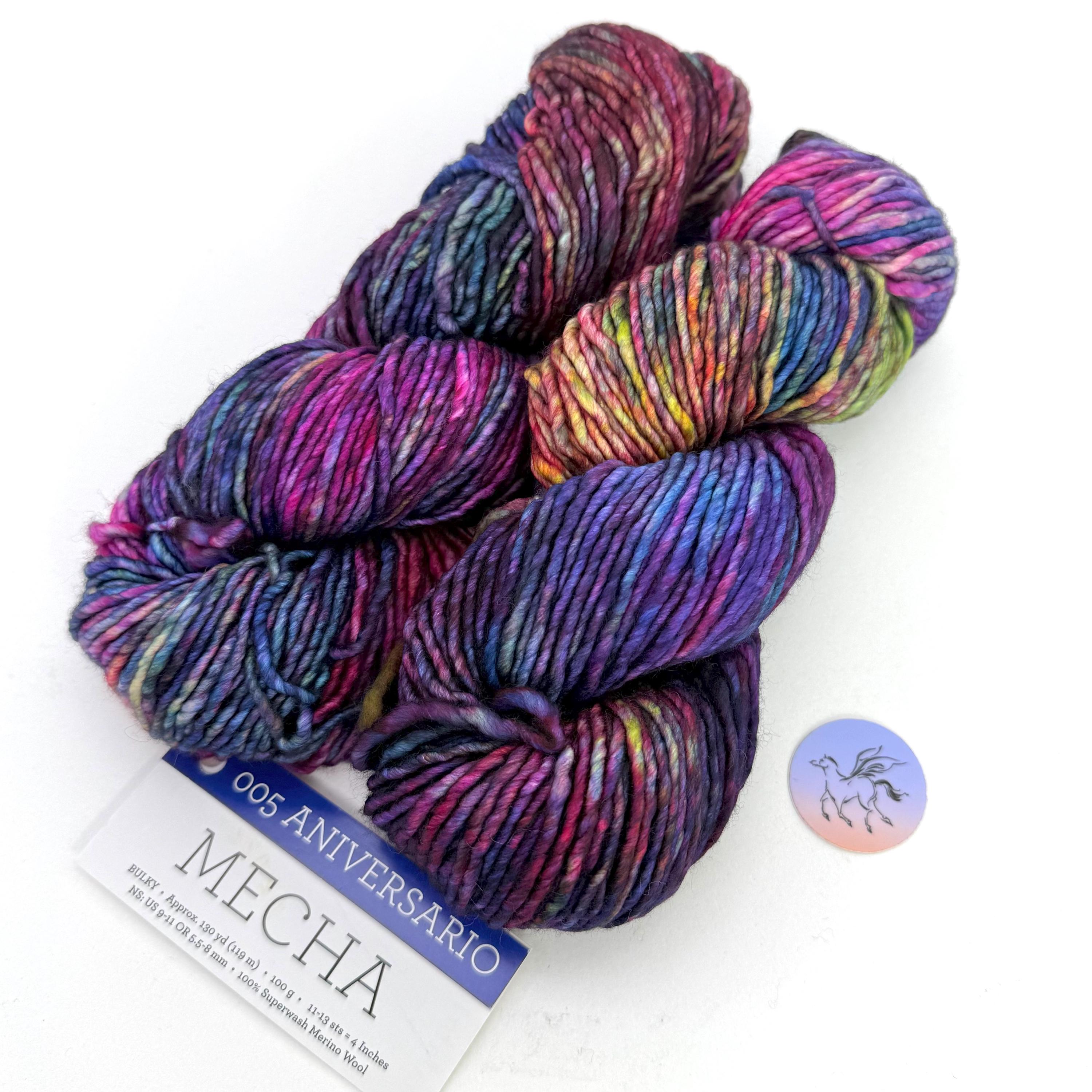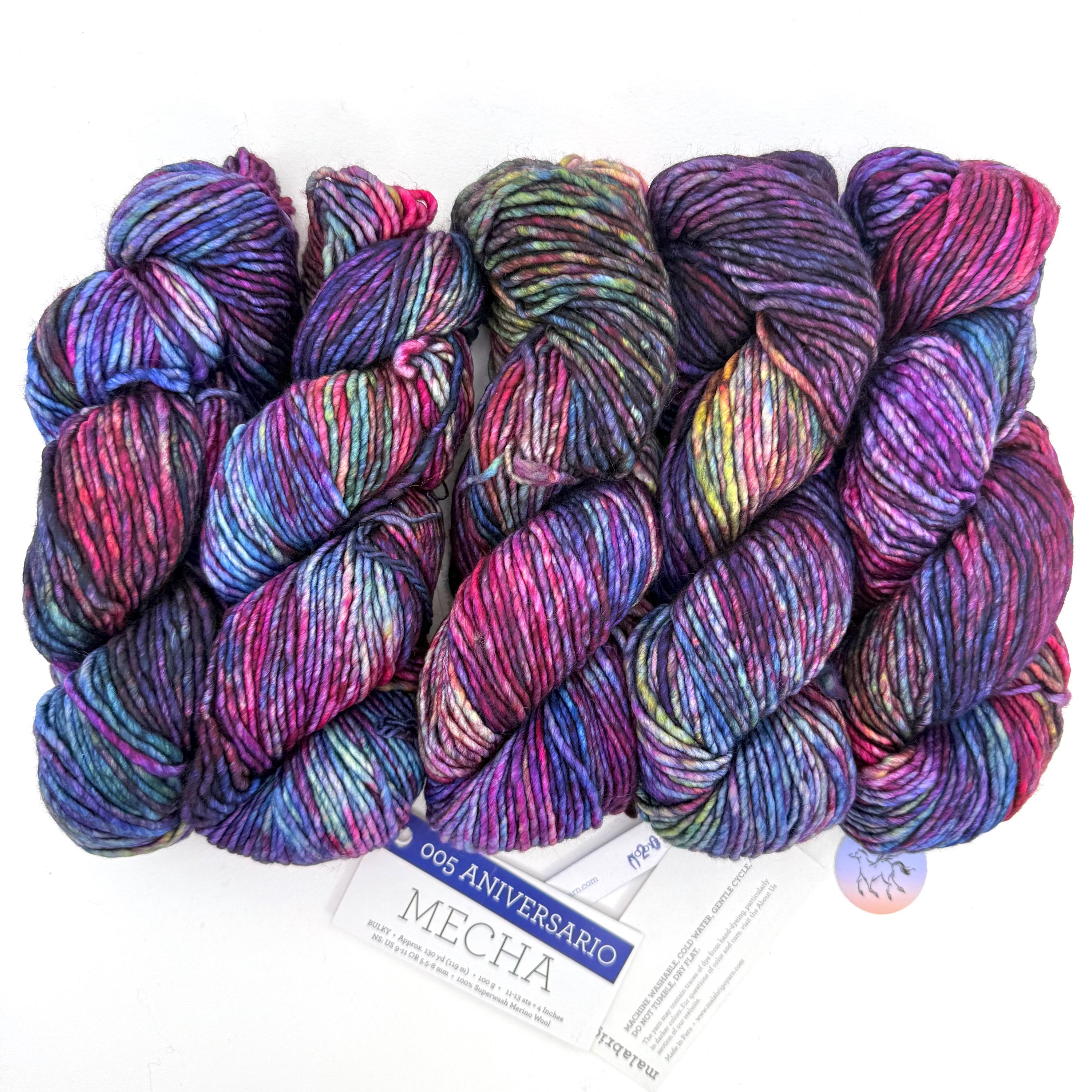 Malabrigo Mecha is a rare single-ply superwash yarn! This merino takes color in the most vivid, rich way-so apparent in the multi-layered hues of Mecha! Slightly thick-and-thin yarn, with a lovely loft, Mecha is the perfect choice for quick but not-too-heavy projects. A superwash yarn in single-ply is a rare find. Superwash means you can wash your garments in cold water, gently, and your items will not shrink or felt. The listing has 10 hanks from the same batch in Aniversario 005, Mecha yarn. Be sure to buy enough for your project.