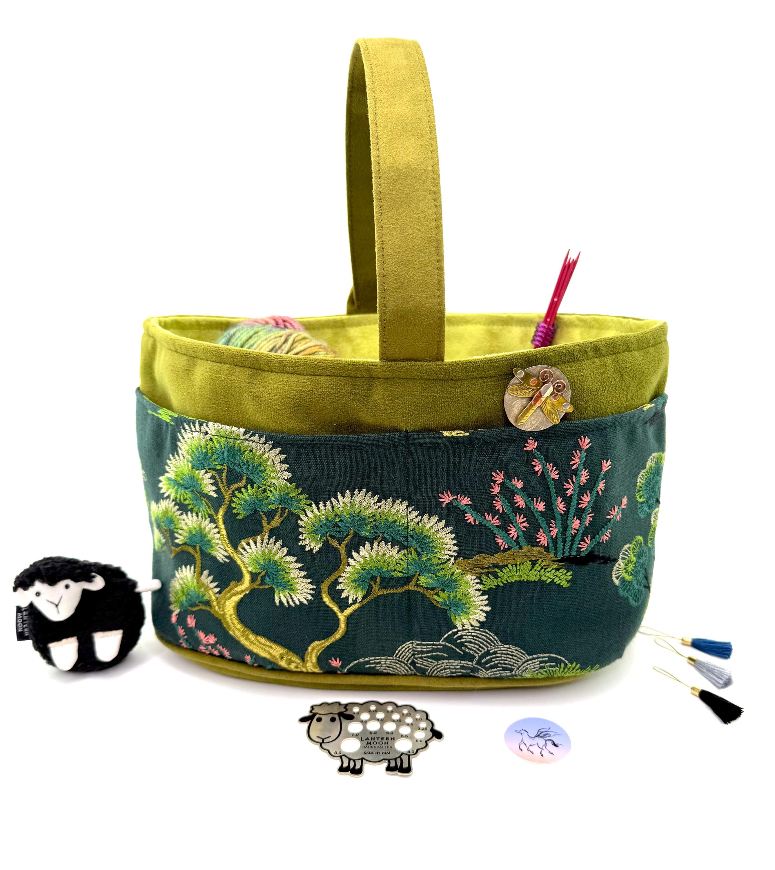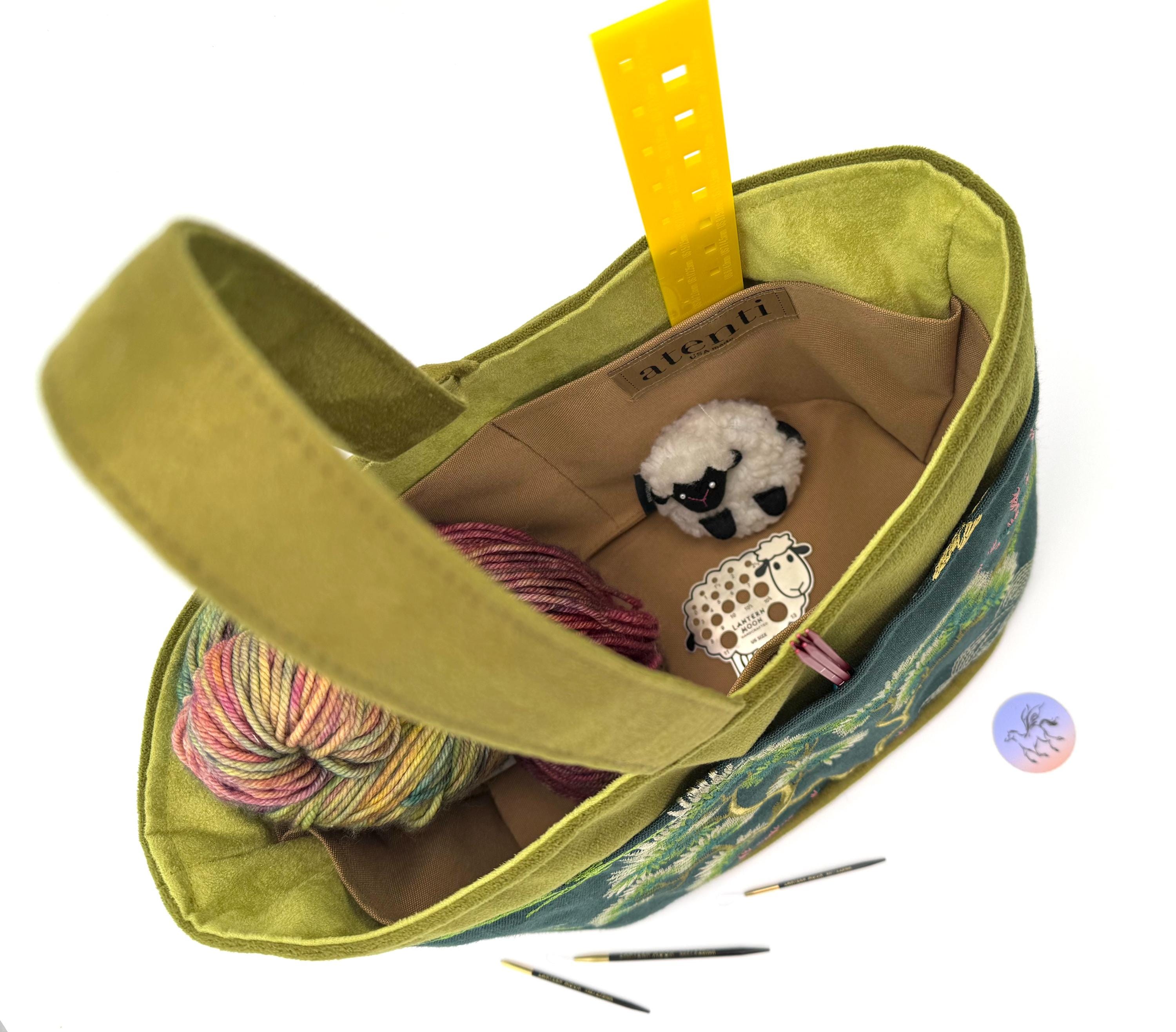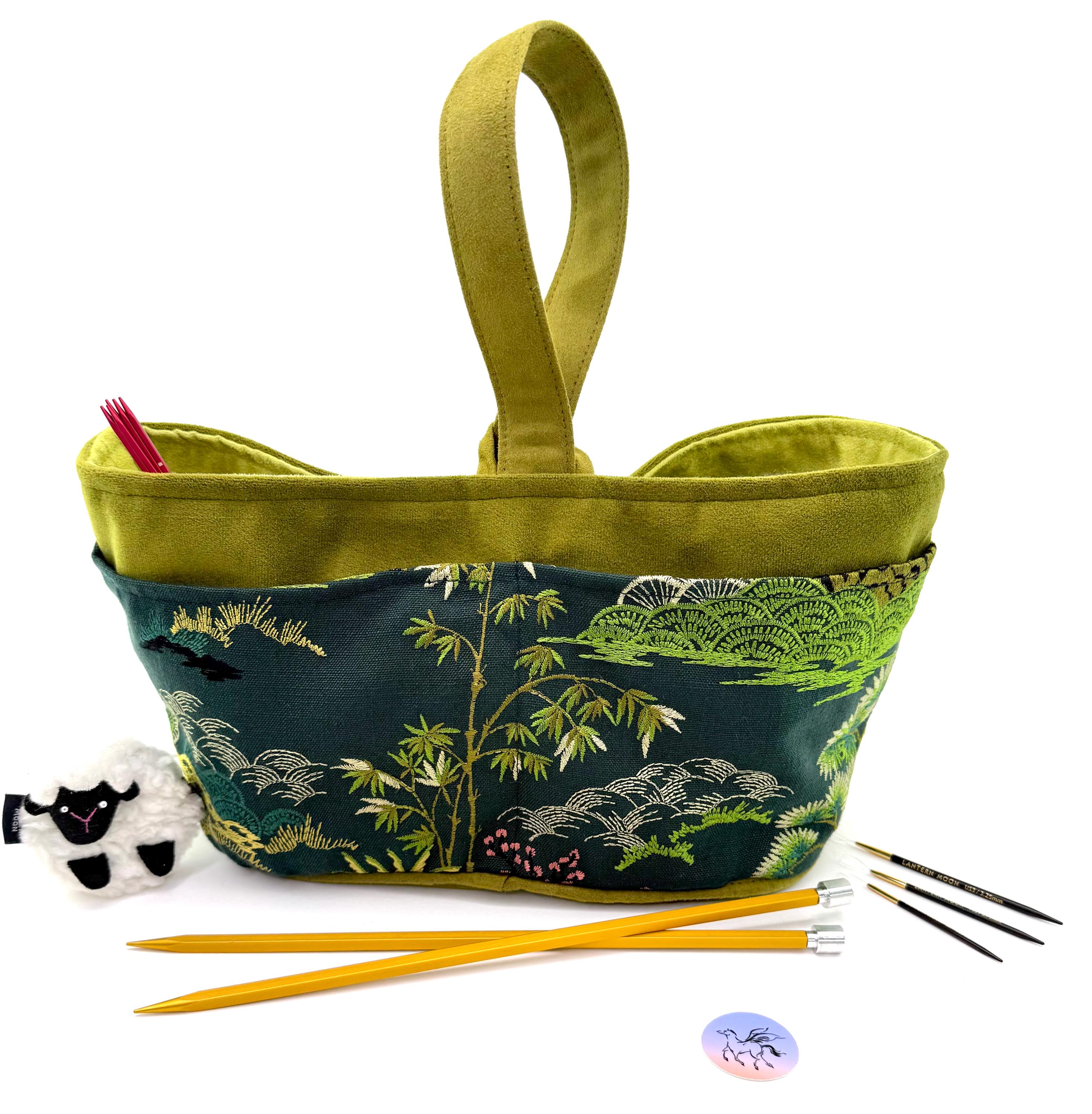 Indulge in elegance and serenity with the Atenti Zen Caddy. The intricate garden design evokes a sense of calm and sophistication. Experience a touch of art and culture with every stitch. This stand-alone, carry around organizer is perfect to store and keep handy all your tools and notions. It’s fully lined and has four outside and four inside pockets with an ample center well and an ultra suede handle. Designed for multiple yarn projects, beading, and crafting it has 8 pockets and plenty of room inside to hold a project.