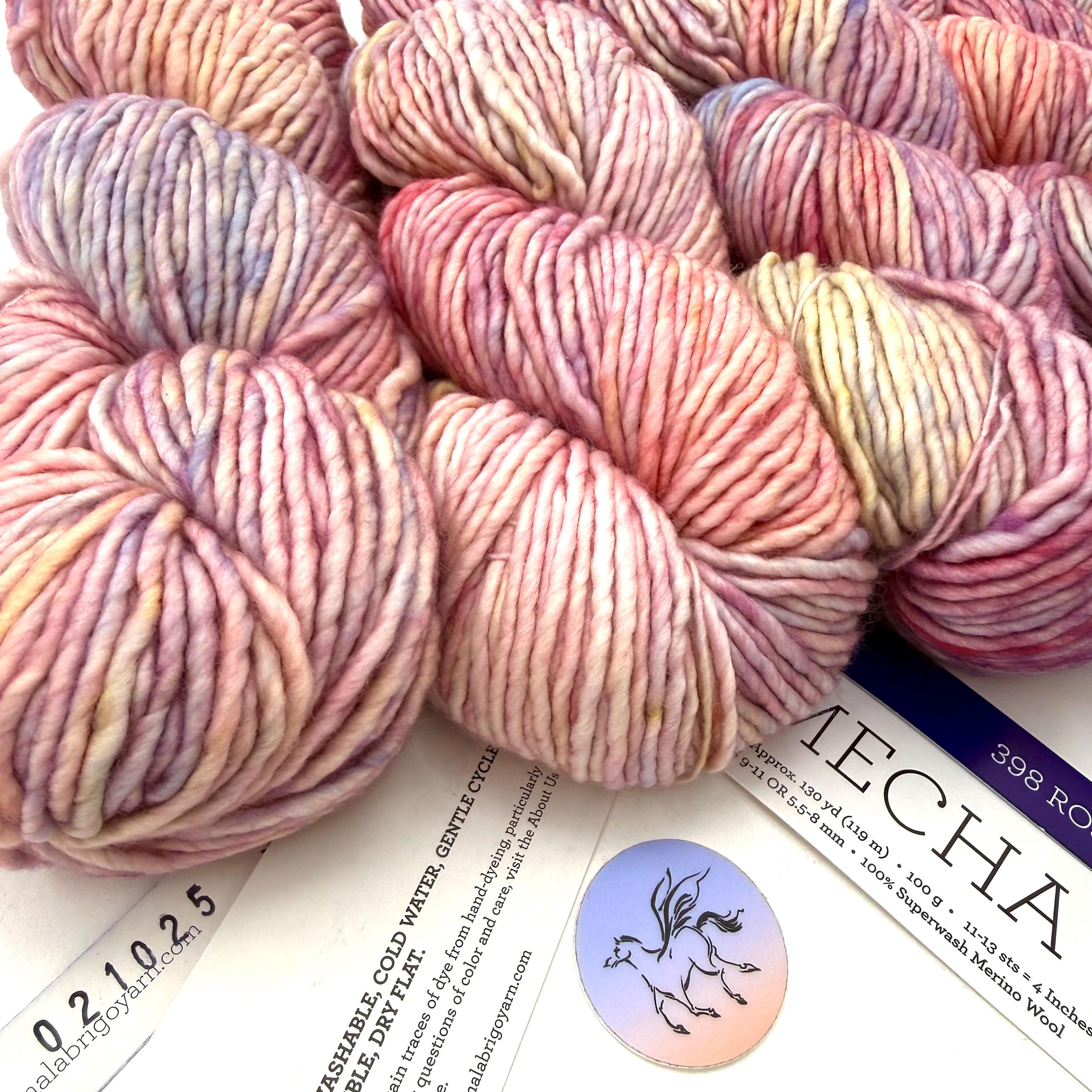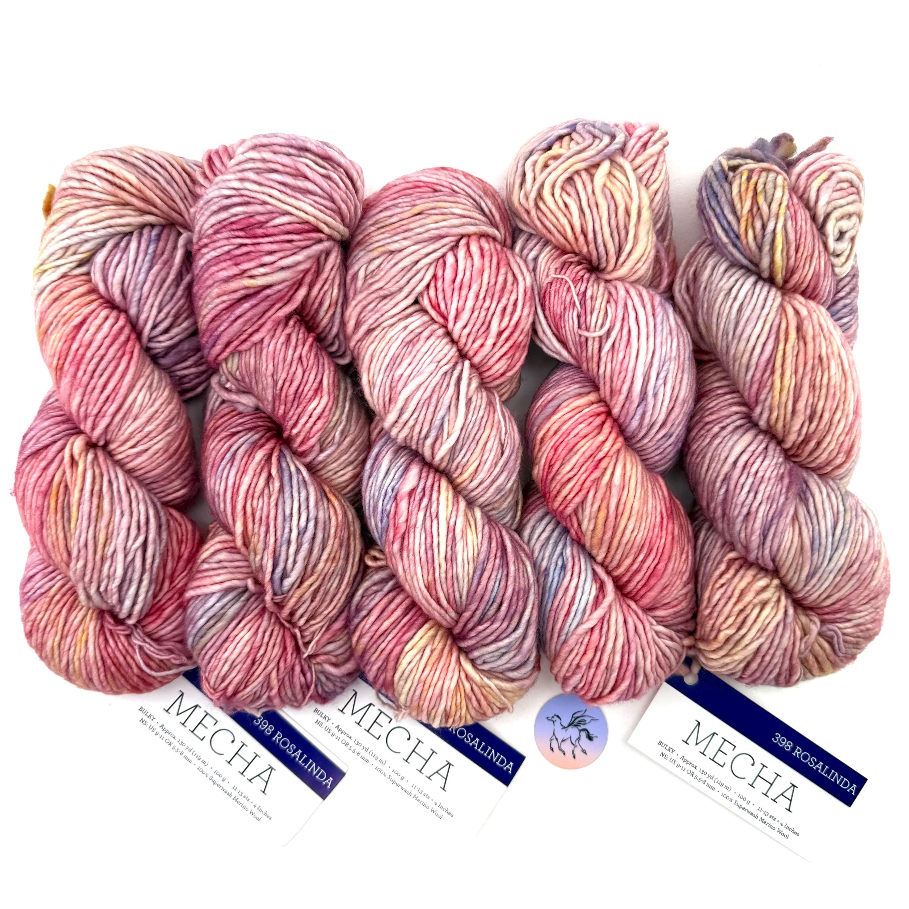 Malabrigo Mecha is a rare single-ply super-wash yarn! This merino takes color in the most vivid, rich way. Soft as always, Mecha Merino Wool is a slightly thick-and-thin yarn, with a lovely loft, and is the perfect choice for quick but not-too-heavy projects. Super-wash means you can wash your garments in cold water, gently, and your items will not shrink or felt. Malabrigo dyes in batches of 10. The listing for Rosalinda #398.