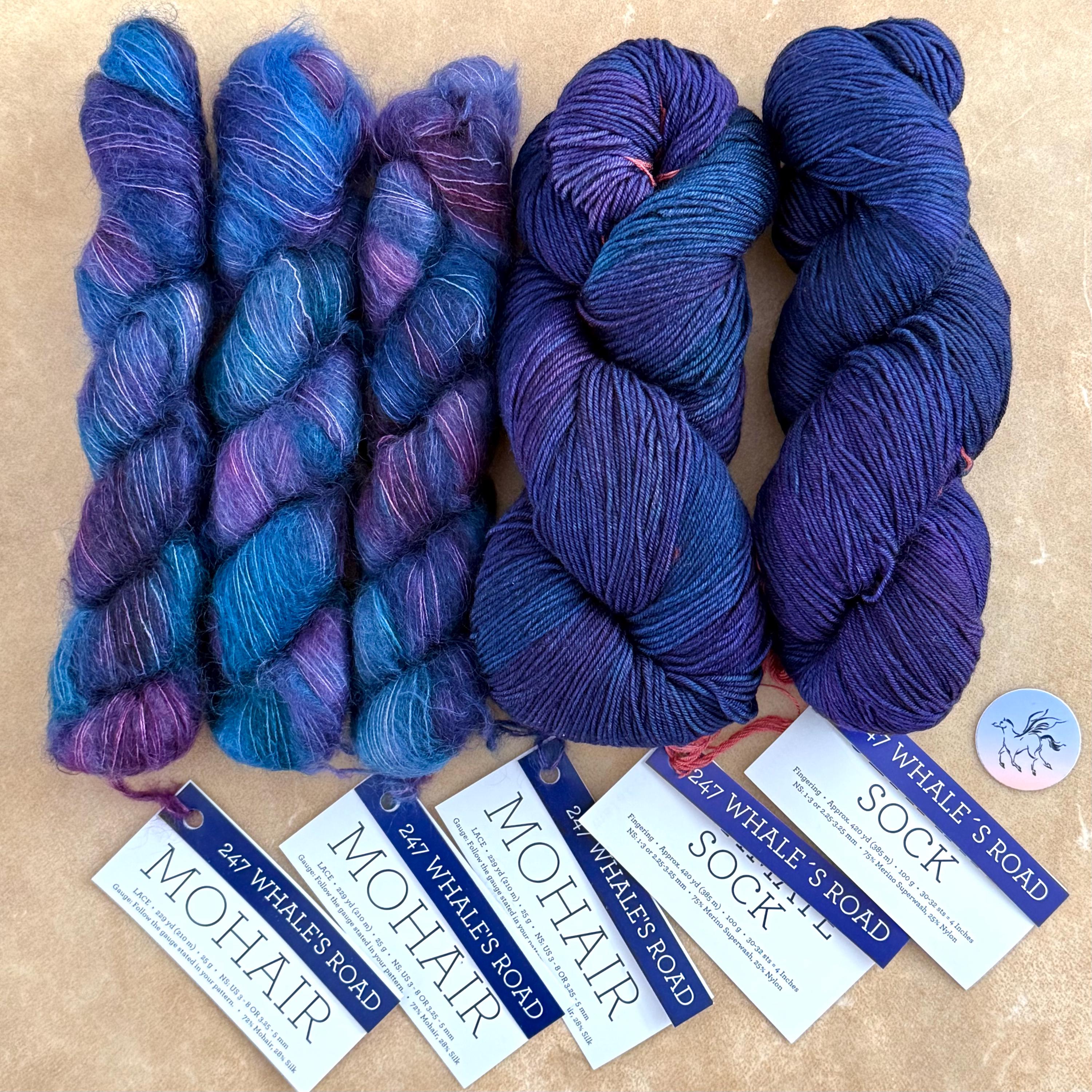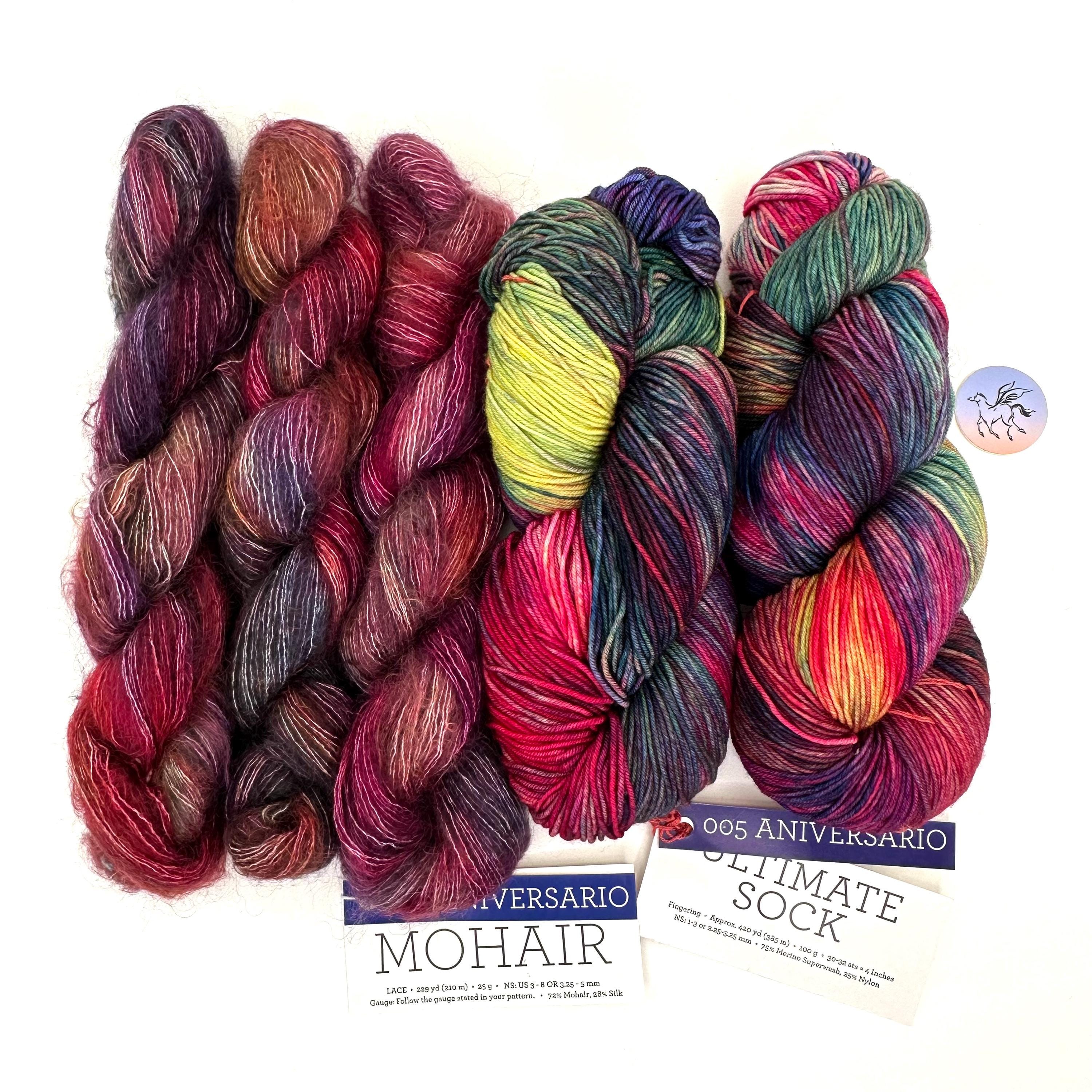 Malabrigo KAL Ultimate Mohair Kit in Whales Road is for the “Chevron Delight” shawl, designed by Lora Marin. Pattern in Ravelry. This kit contains 2 hanks of Ultimate Sock and 3 hanks of Mohair. See shawl pictured in the sample photos, 2, 3, & 4 which used Aniversario. Feel like being different, choose one of several color combo kits here in FlyYarns. This listing is for the lovely Whales Road colorway Ultimate Sock and Mohair. Kit comes bagged in a reusable organza bag.