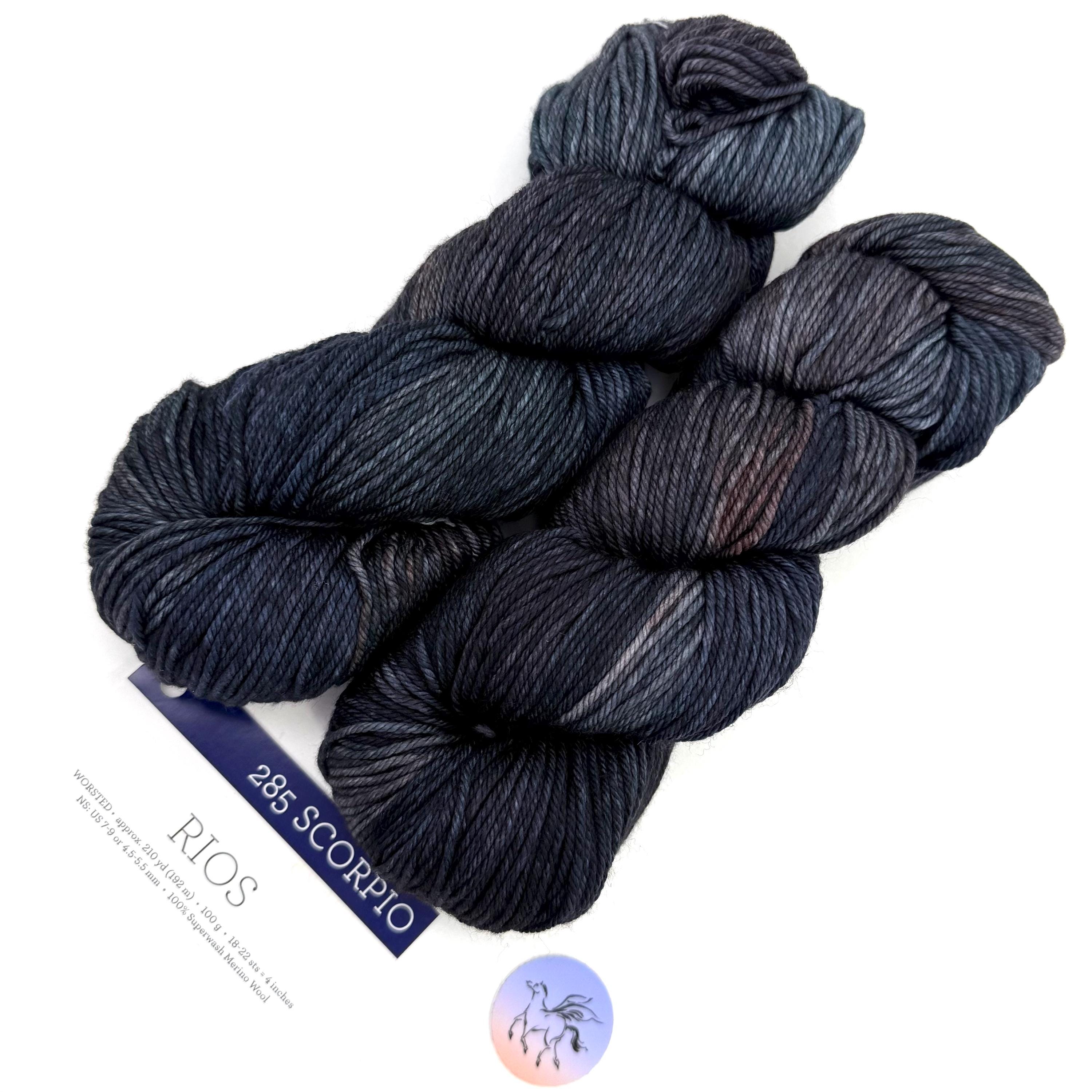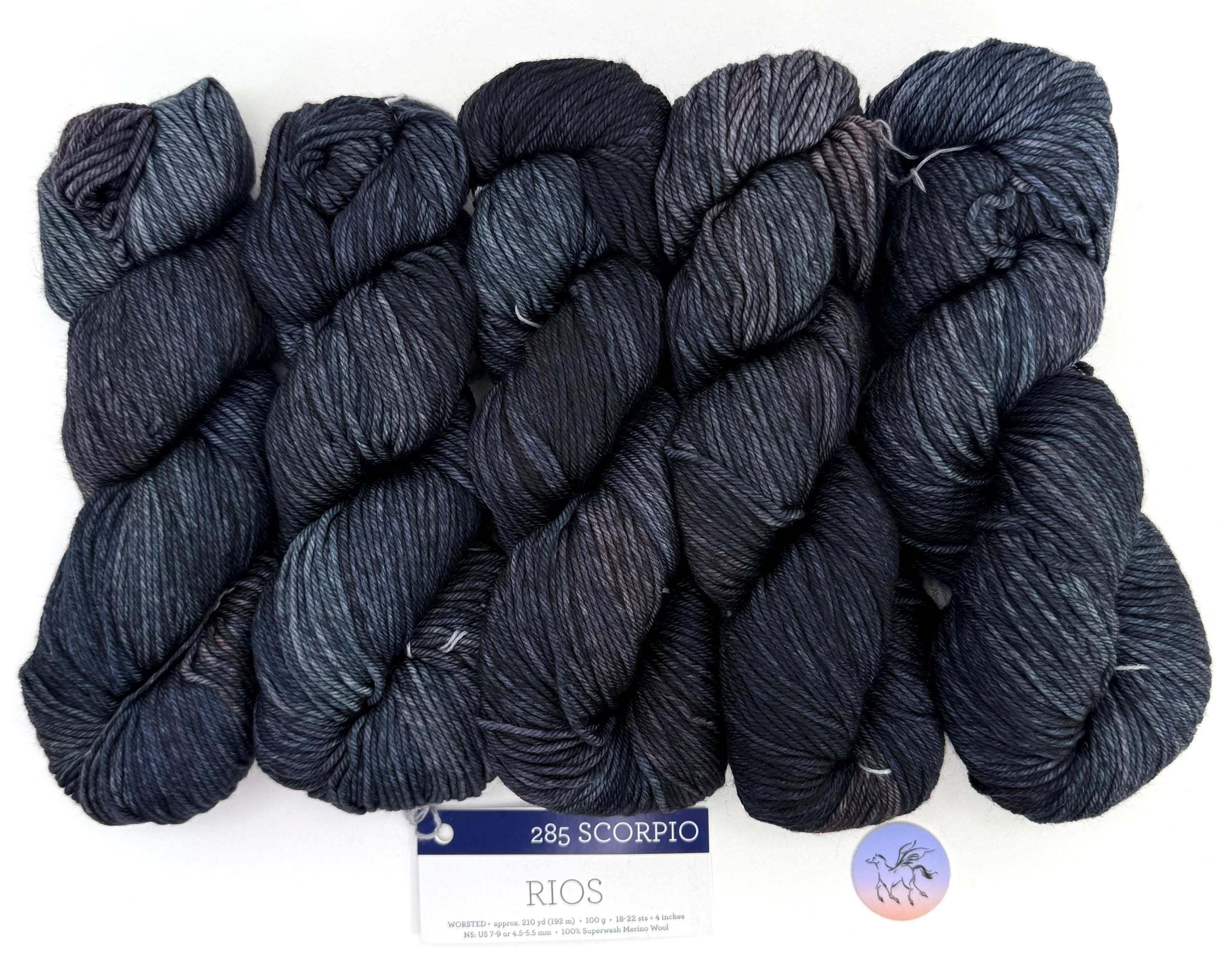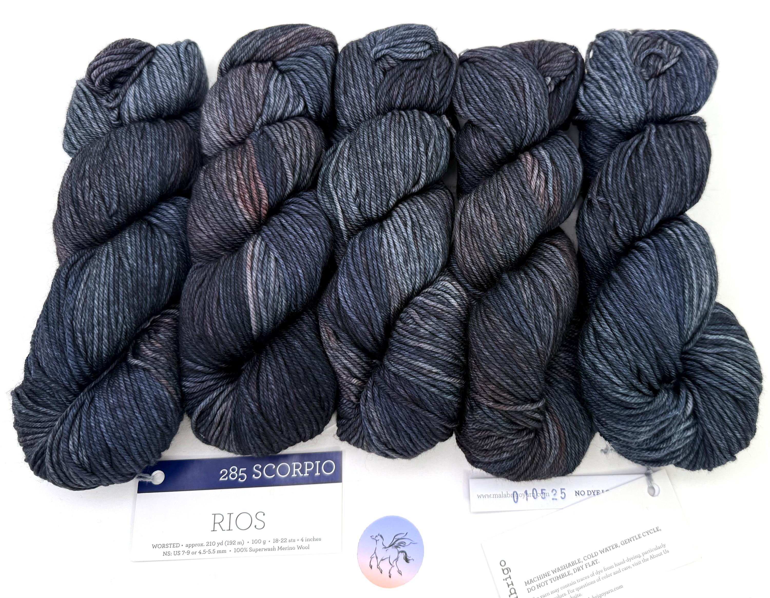 Malabrigo Rios Yarn is plied 100% pure Merino Superwash wool which is hand-dyed. This listing for the color "Scorpio" Rios 285, is a mulit-colored, worsted weight yarn, 10 ply wool. Malabrigo creates 10 hanks in a lot and all of these beautiful Rios Scorpio yarn hanks are the same bag. Dye lot 010525. Priced per hank.