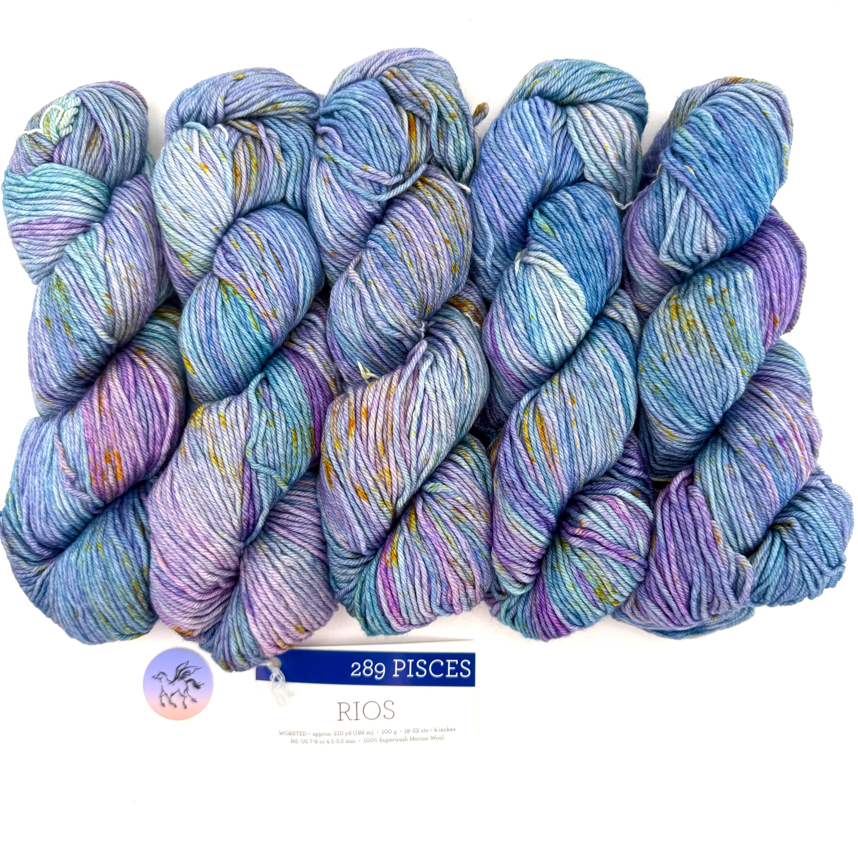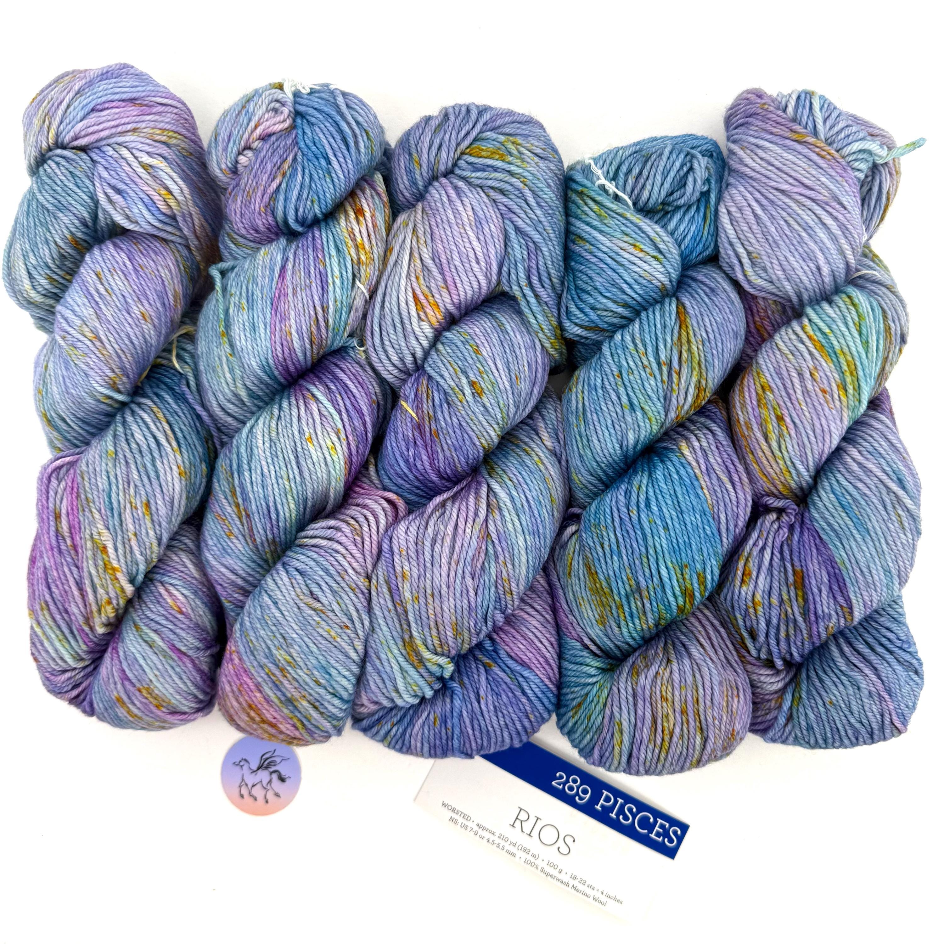 Malabrigo Rios Yarn is plied 100% pure Merino Superwash wool which is hand-dyed. This listing for the color PISCES Rios 289, is a mulit-colored, worsted weight yarn, 10 ply wool. Malabrigo creates 10 hanks in a dye lot.. A gorgeous hand-dyed Merino wool in a turquoise, rose and lavender is Malabrigo's unique Pisces. Priced per hank.