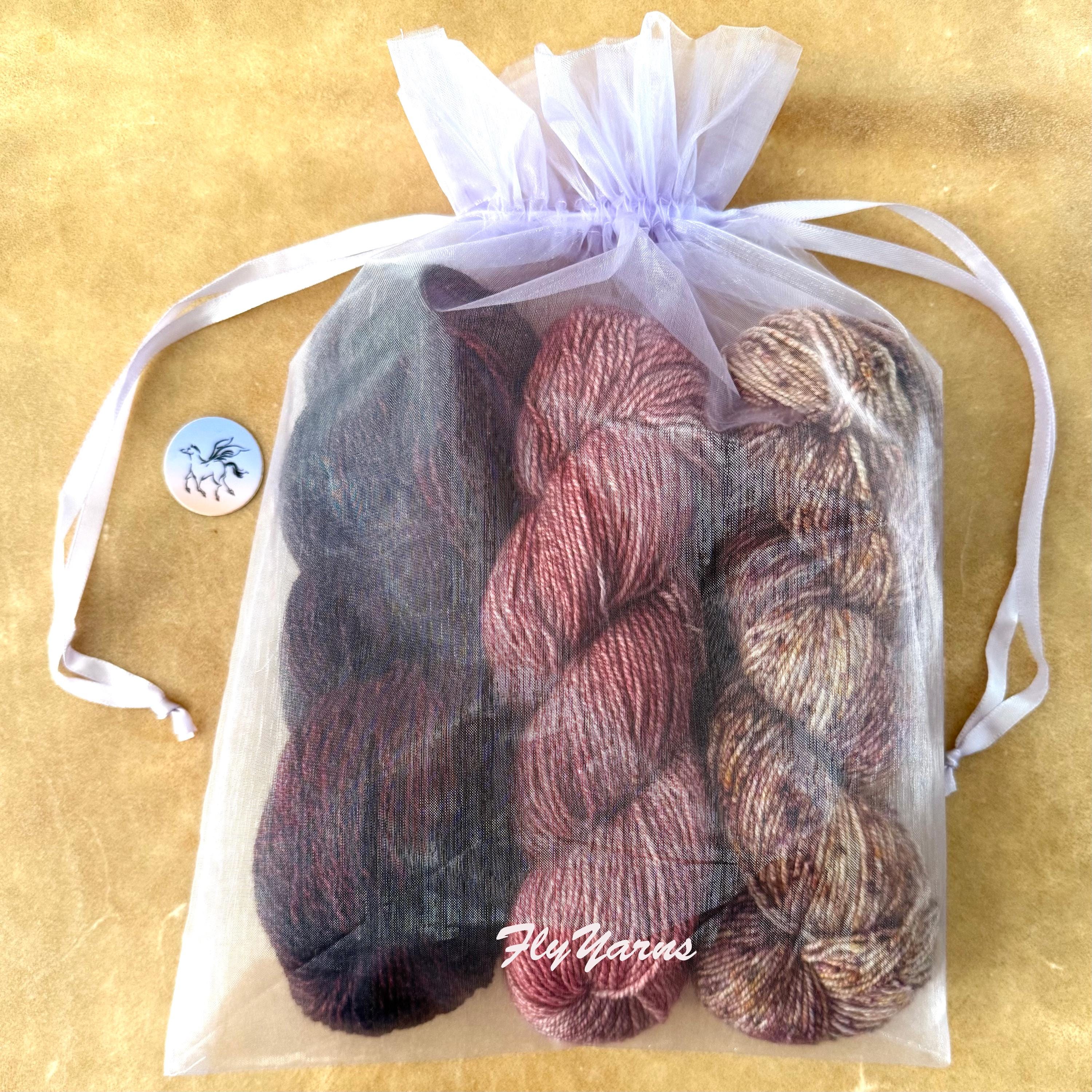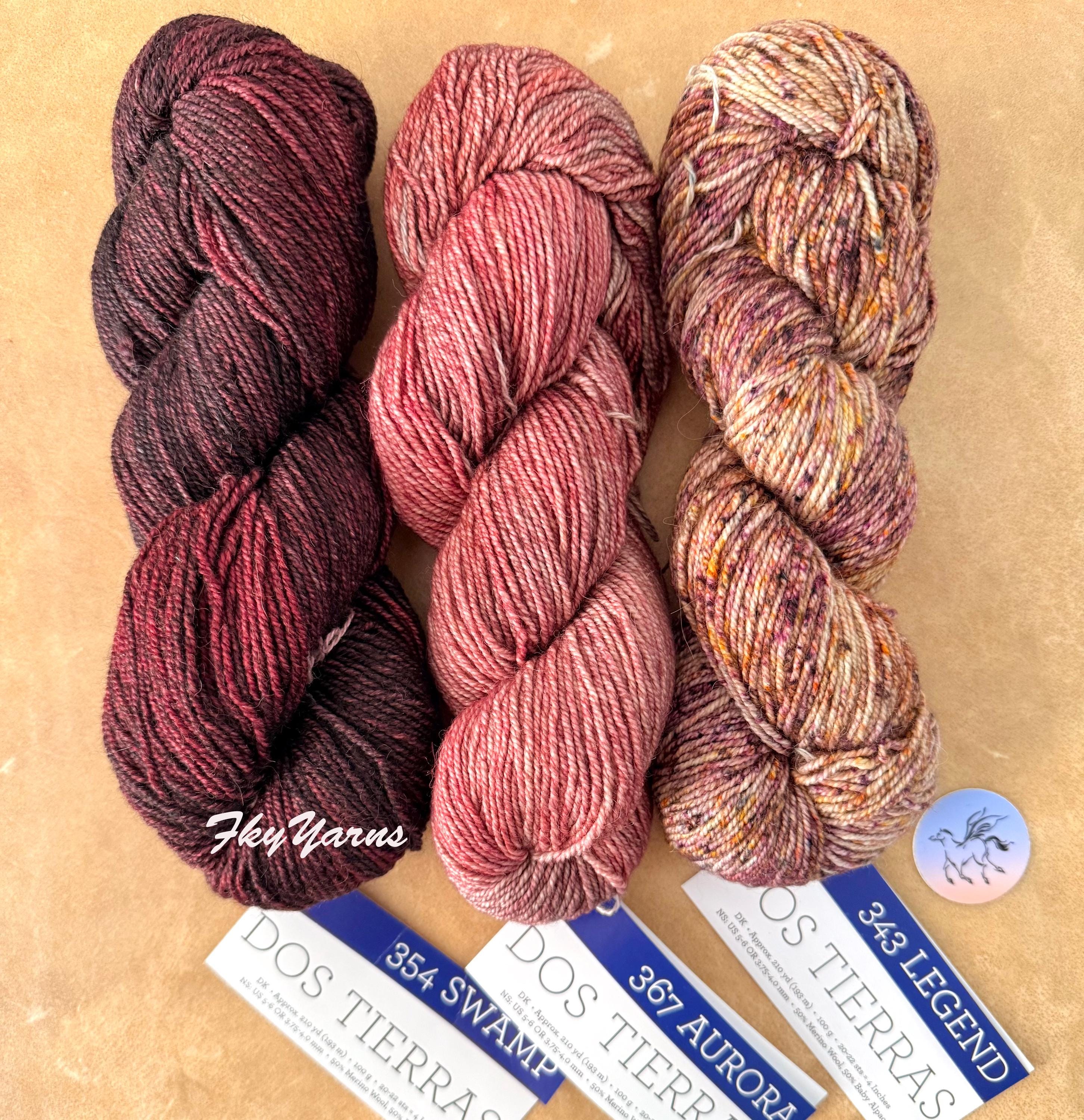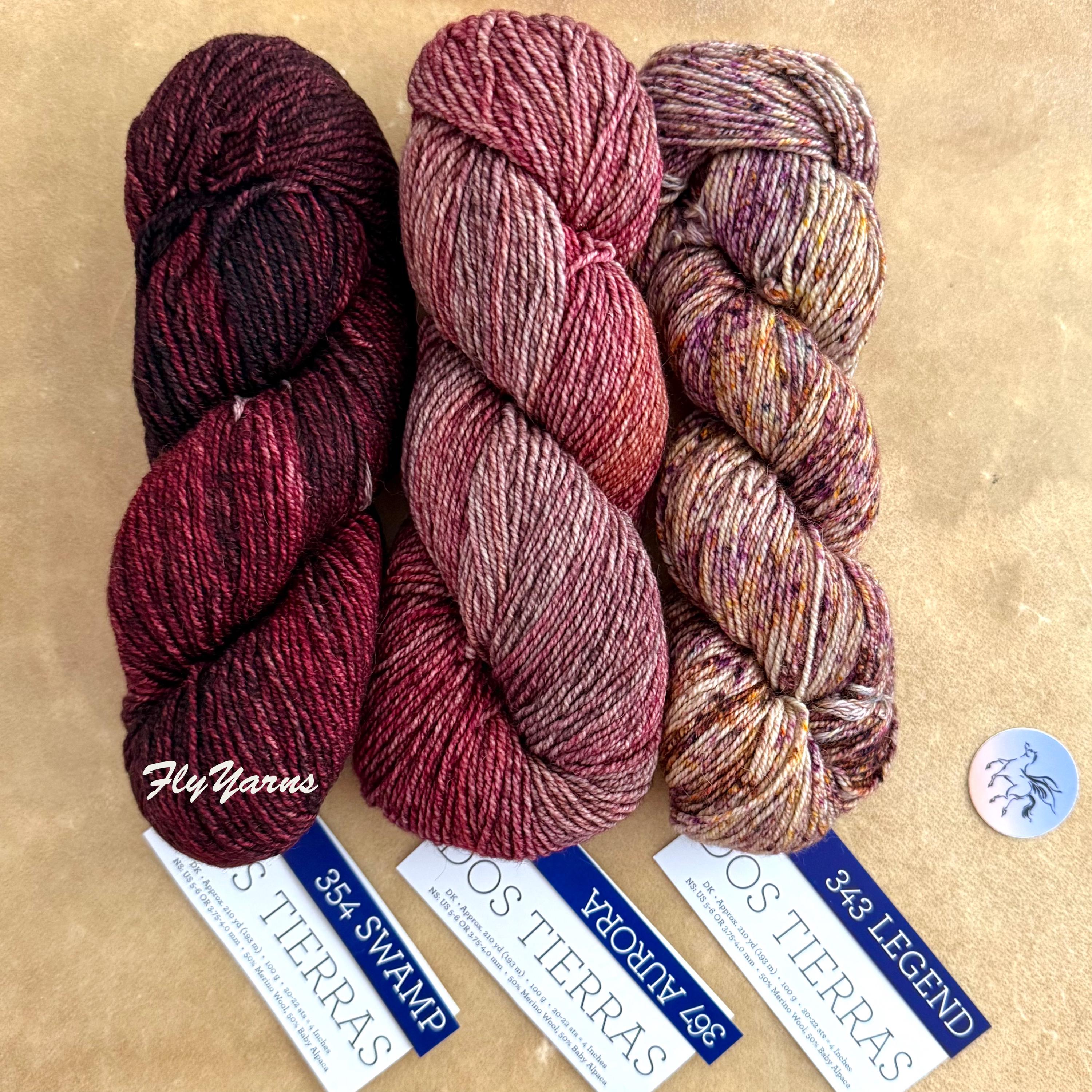 Kit for Malabrigo Dos Tierras KAL called The Friendship Shawl in Swamp, Aurora and Legend. This shawl was the Malabrigo Dos Tierras KAL in March 2024. The kit comes in an organza bag - a reusable small project bag. Shawl is designed by Jill Tamminen; pattern available on Ravelry. Dos Tierras means Two Lands, reflecting the sources of the two amazing fibers found in this ultra-soft DK blend yarn. By spinning together 50% fine Uruguayan Merino wool with 50% baby alpaca from Peru Malabrigo has created a DK weight yarn that is as versatile as it is beautiful. When the good stitch definition and drape of this four ply yarn is combined with the amazing kettle-dyed semi-solid and variegated colors of Malabrigo you have the perfect palette to show off your stitch work. Pattern on Ravelry.
