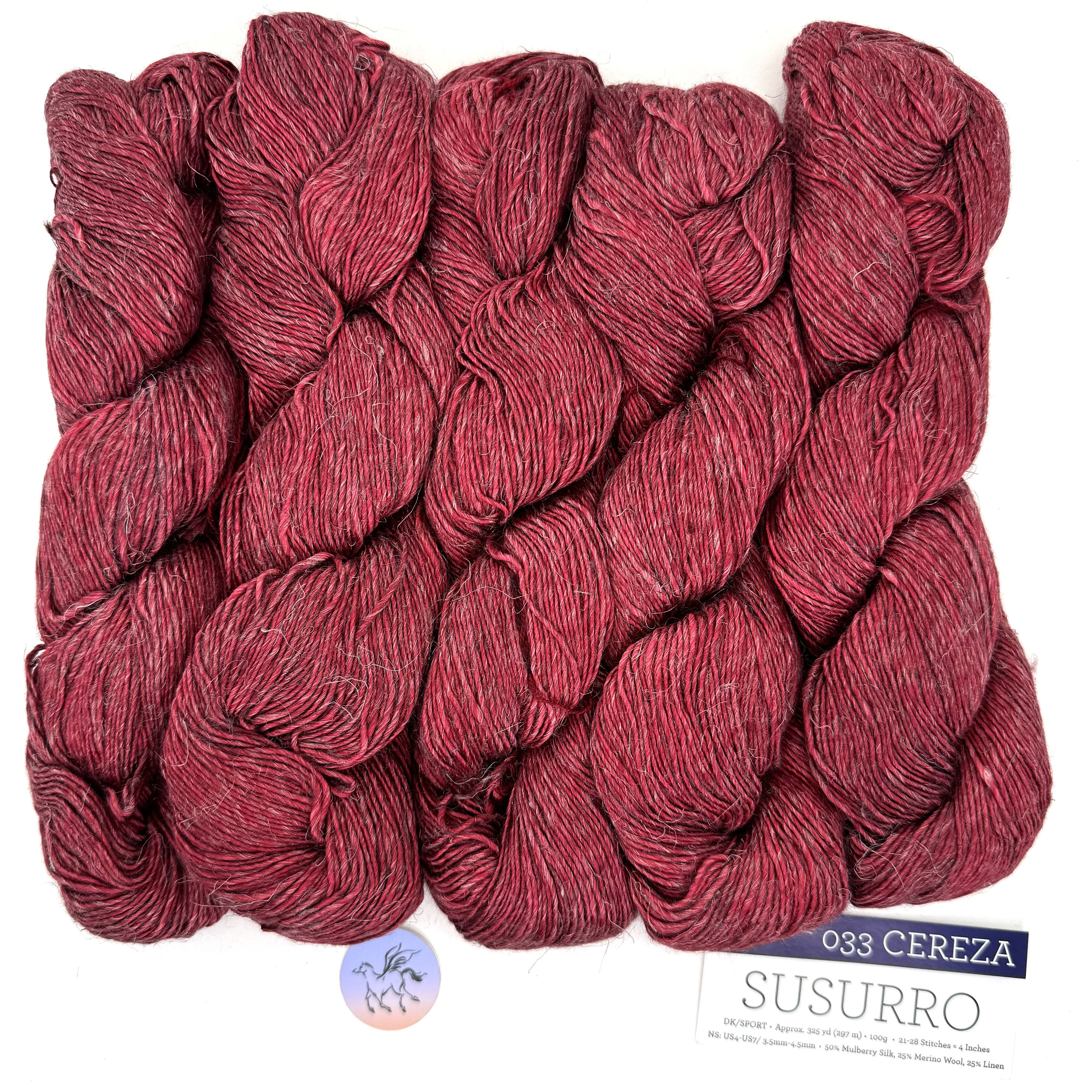 Susurro is soft and light, a blend of Silk, Linen and Merino-the perfect summer yarn offered here in a rich red, Cereza. The blend of 3 very different fibers results in an amazing depth of color with an almost metallic sheen. The sharp contrast between the crude texture of the linen and silkiness of Merino creates a yarn of marvelous balance.