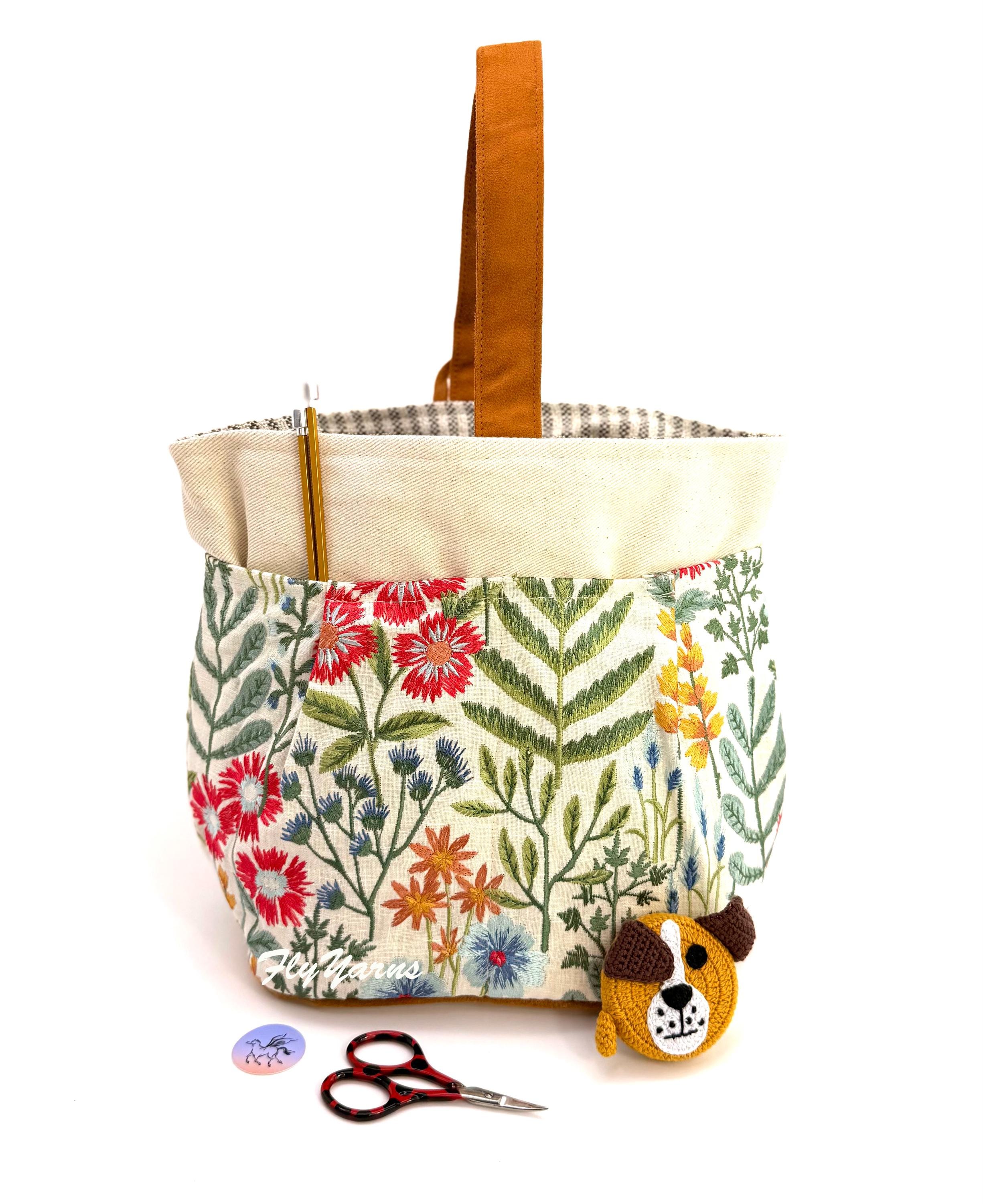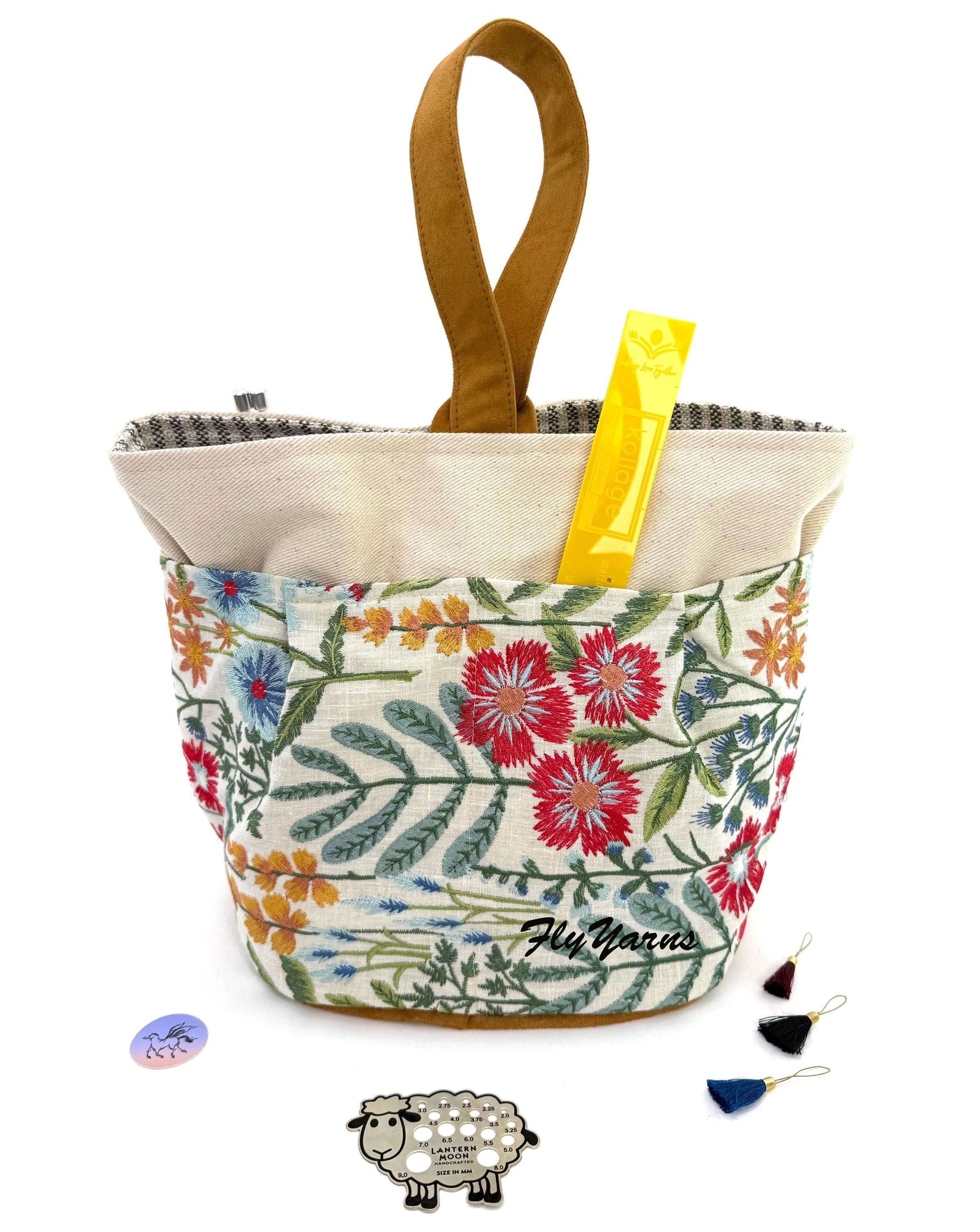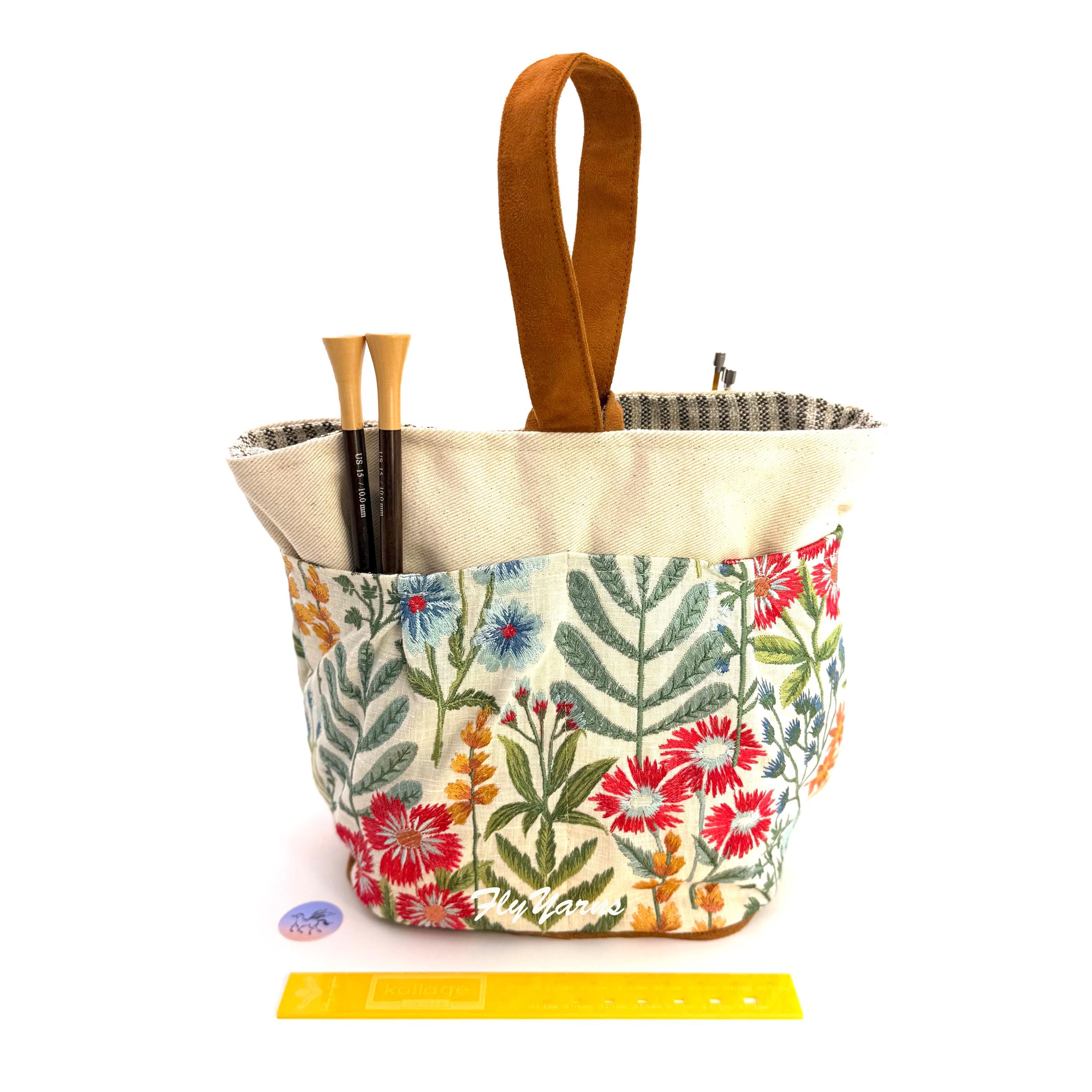 Atenti Tall Caddy in a summery embroidered floral design, called Wildflower, has 4 outer pockets and 4 inner pockets. which is a stand-alone, carry around organizer. It’s fully lined in water resistant taffeta with four inside pockets and plenty of interior room to hold your knitting, gadget bag or Ipad. Thread the gold ultra suede handle through the closure loop to secure and carry. This exquisite, embroidered caddy has 8 pockets - so perfect to store all your tools and notions. Wildflower tall caddy is an excellent gift for knitters and crafters.