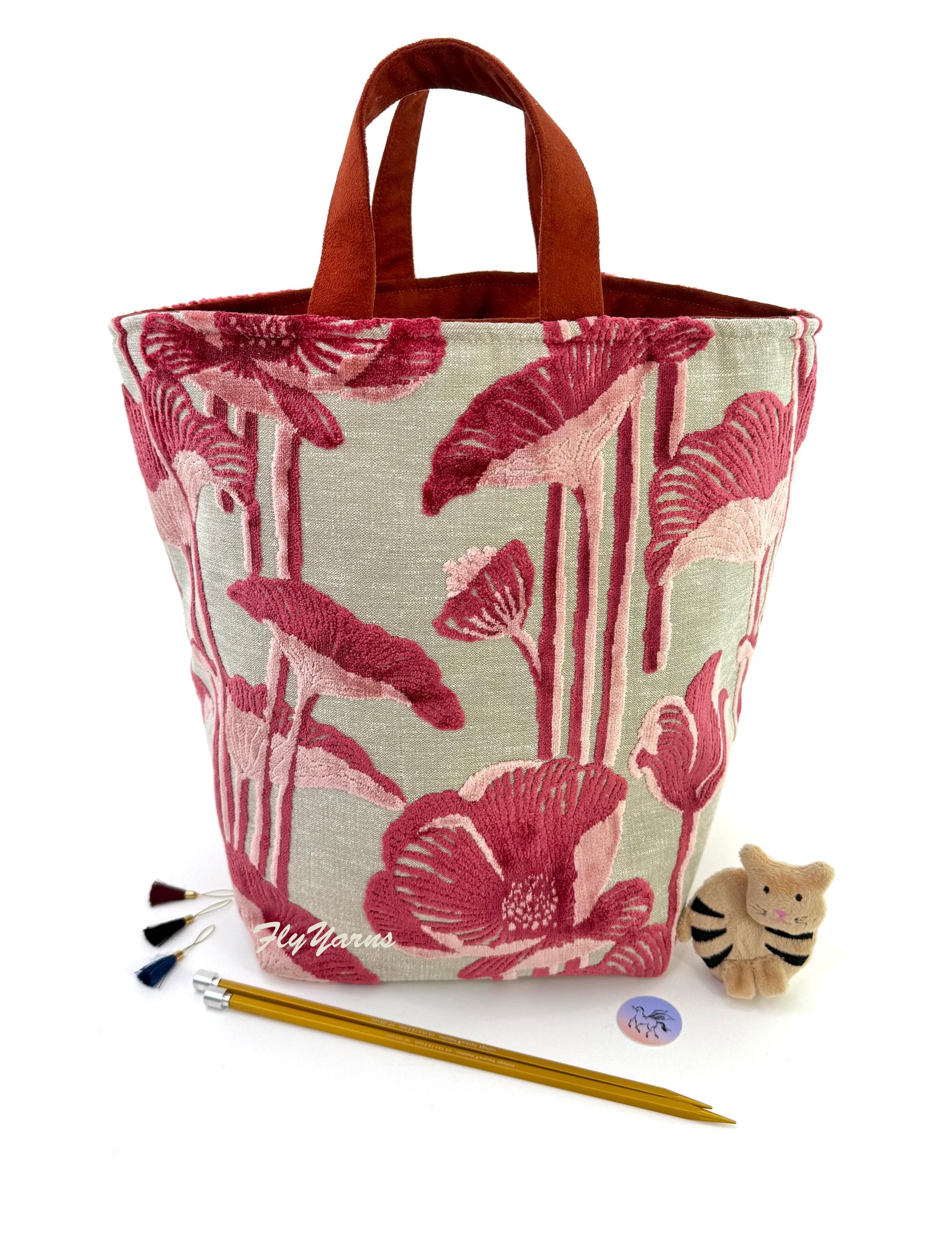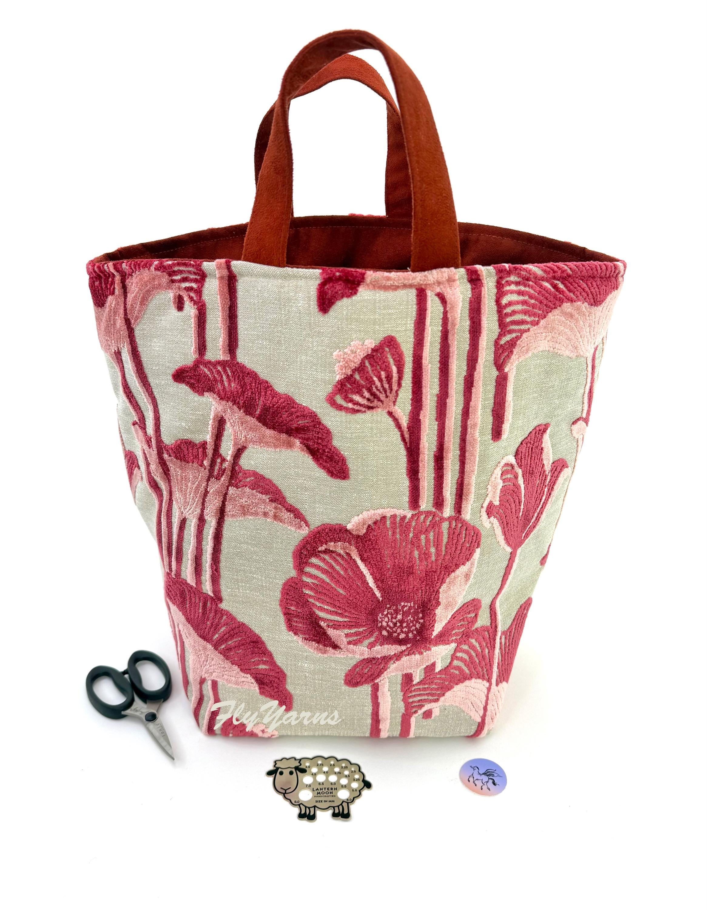 Atenti Hope Basket Lalique is made of a gorgeous cut velvet floral fabric inspired by the art nouveau style of cut glass. A roomy stand-alone project bag is fully lined in tan water repellent taffeta, with 5 slotted pockets to hold needles, a phone and notions. The top rolls down for easy access with a wide opening and two handles. This elegant bag makes an excellent crafter's gift or Birthday Gift.