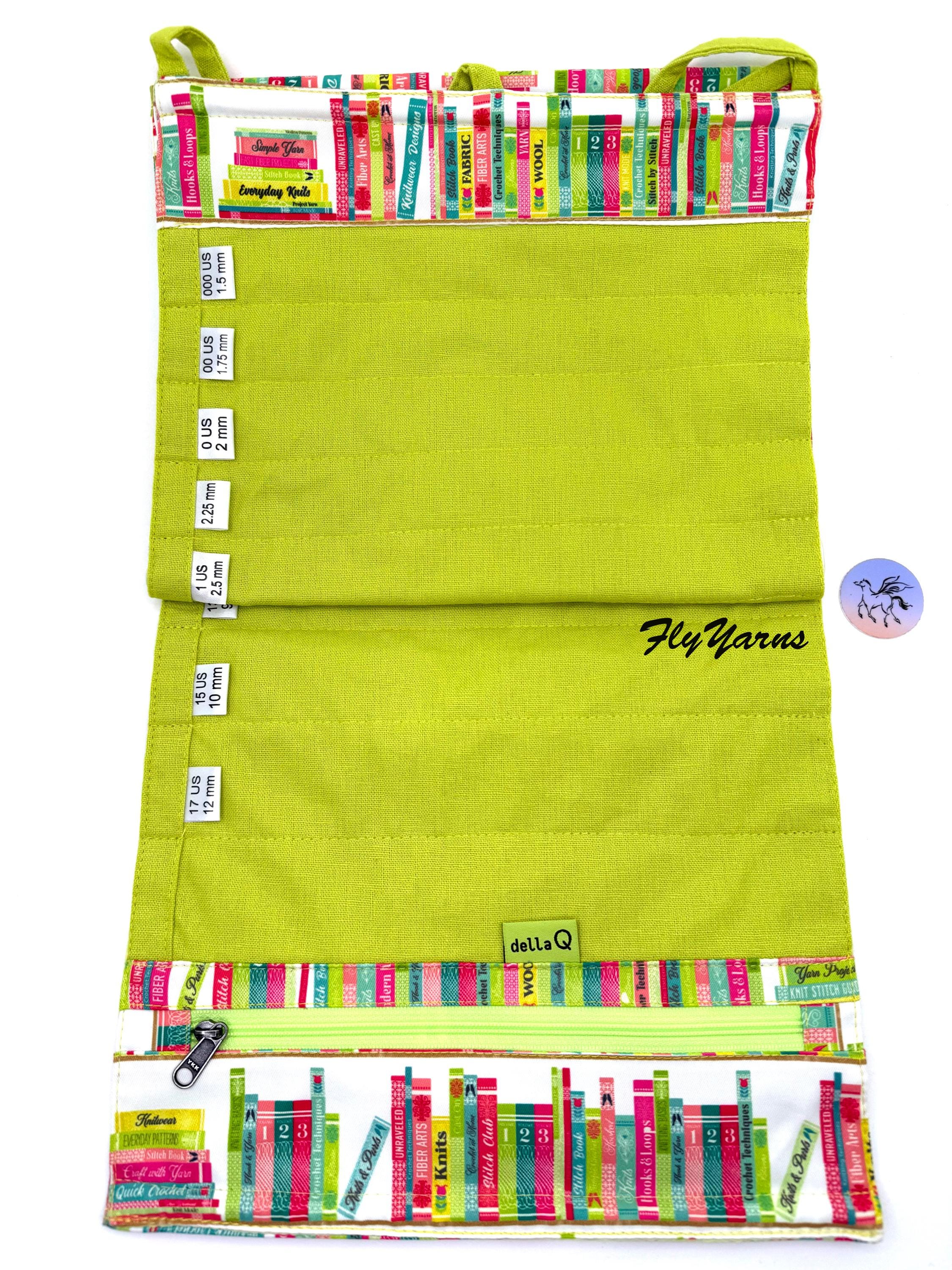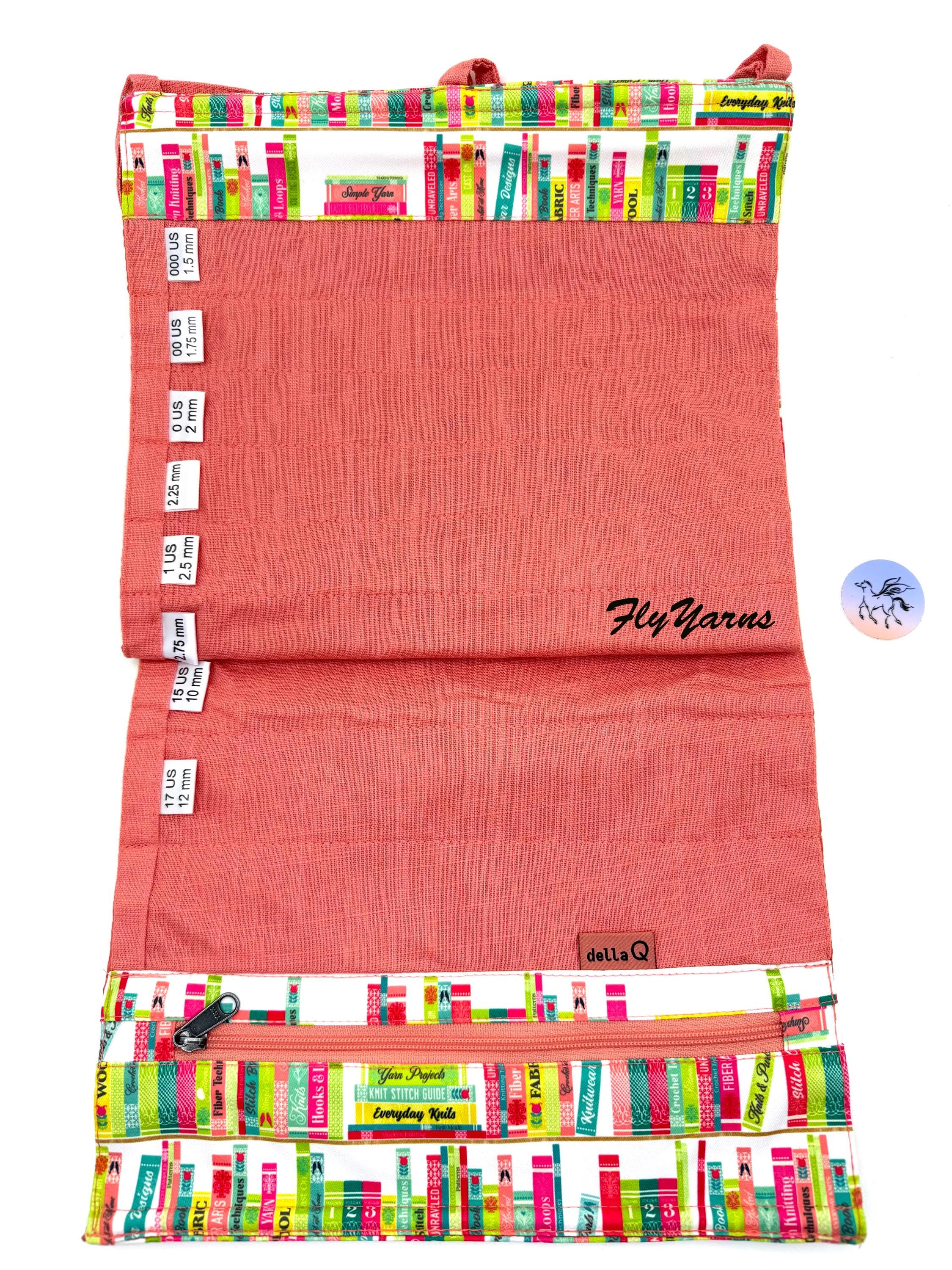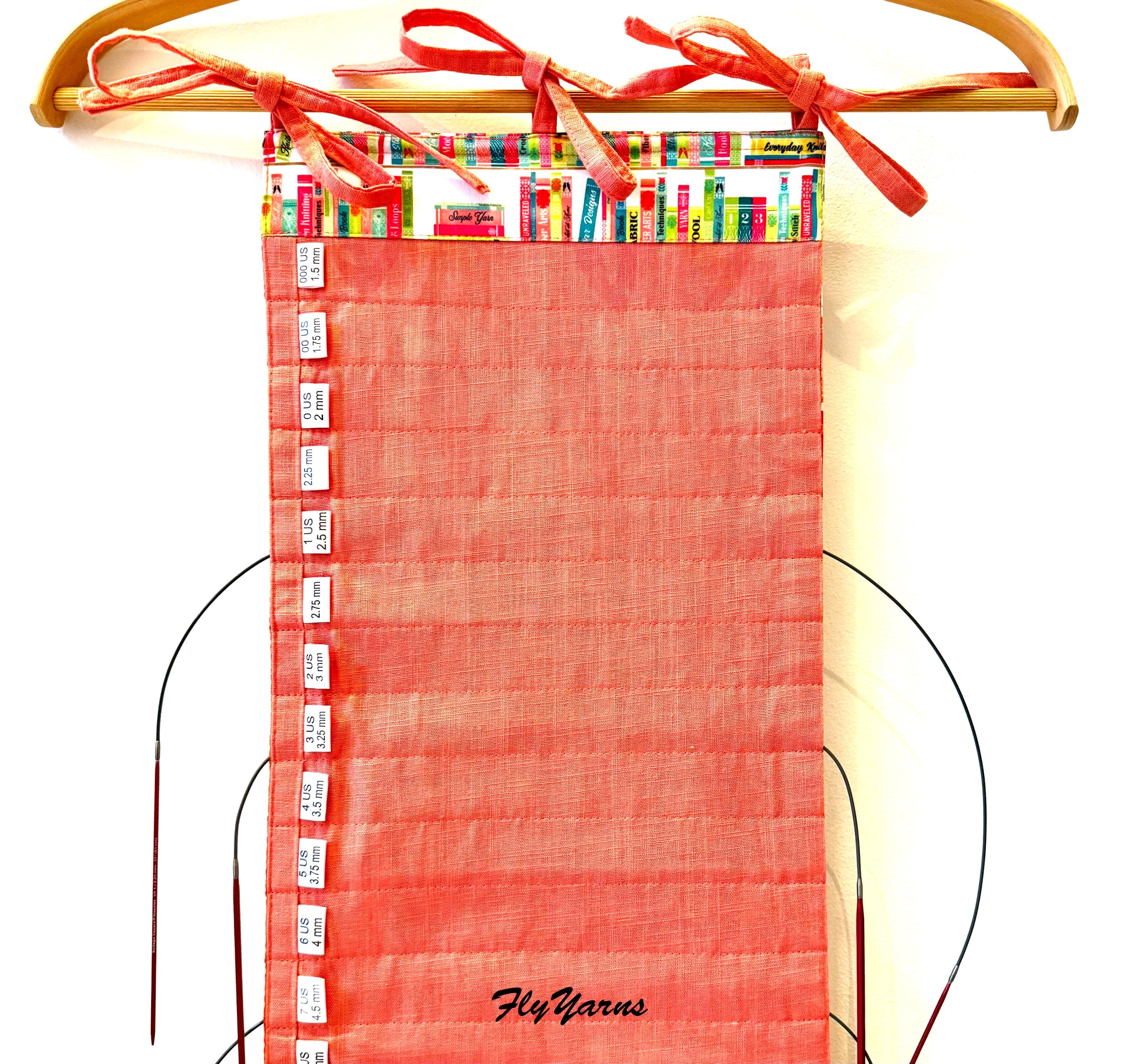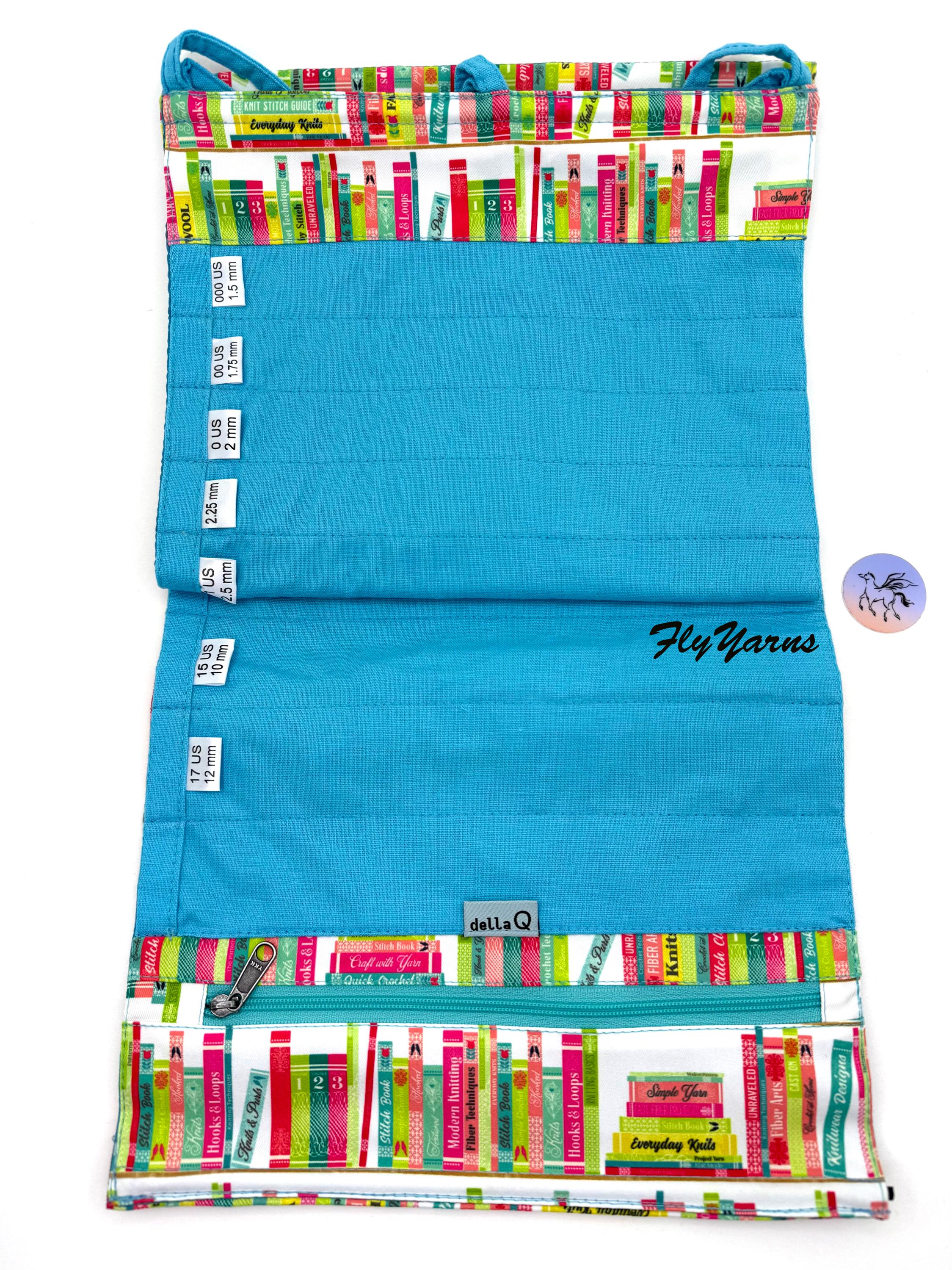 Della Q Hanging Circular Needle Case is a popular method for organizing your circular needles. This Linen Library Print for the Circular Knitting Needle Case is very smart in the new 2025 LINEN fabrics-just a knitter's dream for organizing all those knitting needles. Each slot can hold multiple circular needles of different lengths. The three ties at the top can be easily attached to a hanger, or closet rod. If you need to take it to go, simply roll it up and secure with the ties. Linen hanging case is a great choice if you plan on really loading up your case. The bottom section includes a long zip pocket for extra notions.