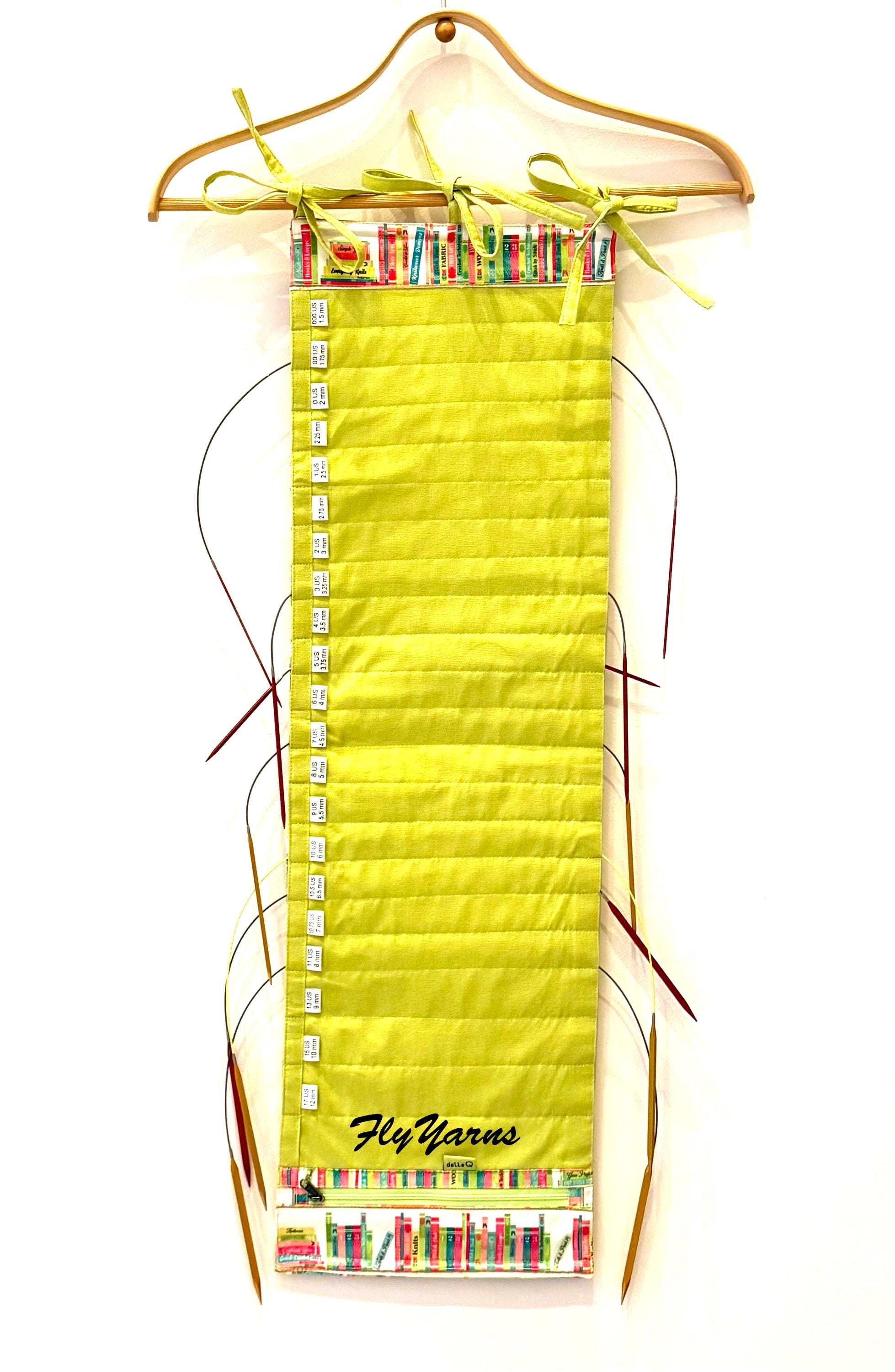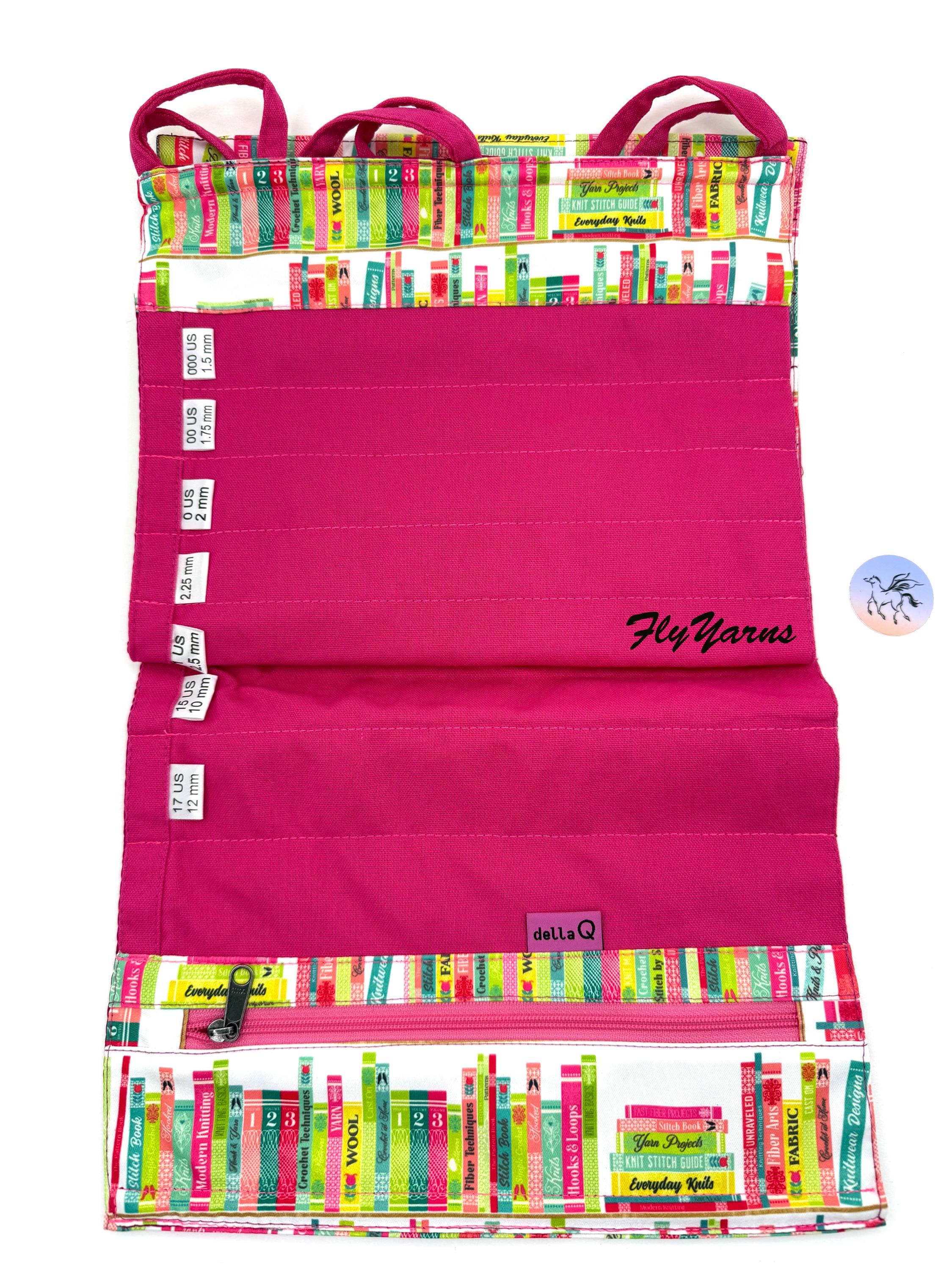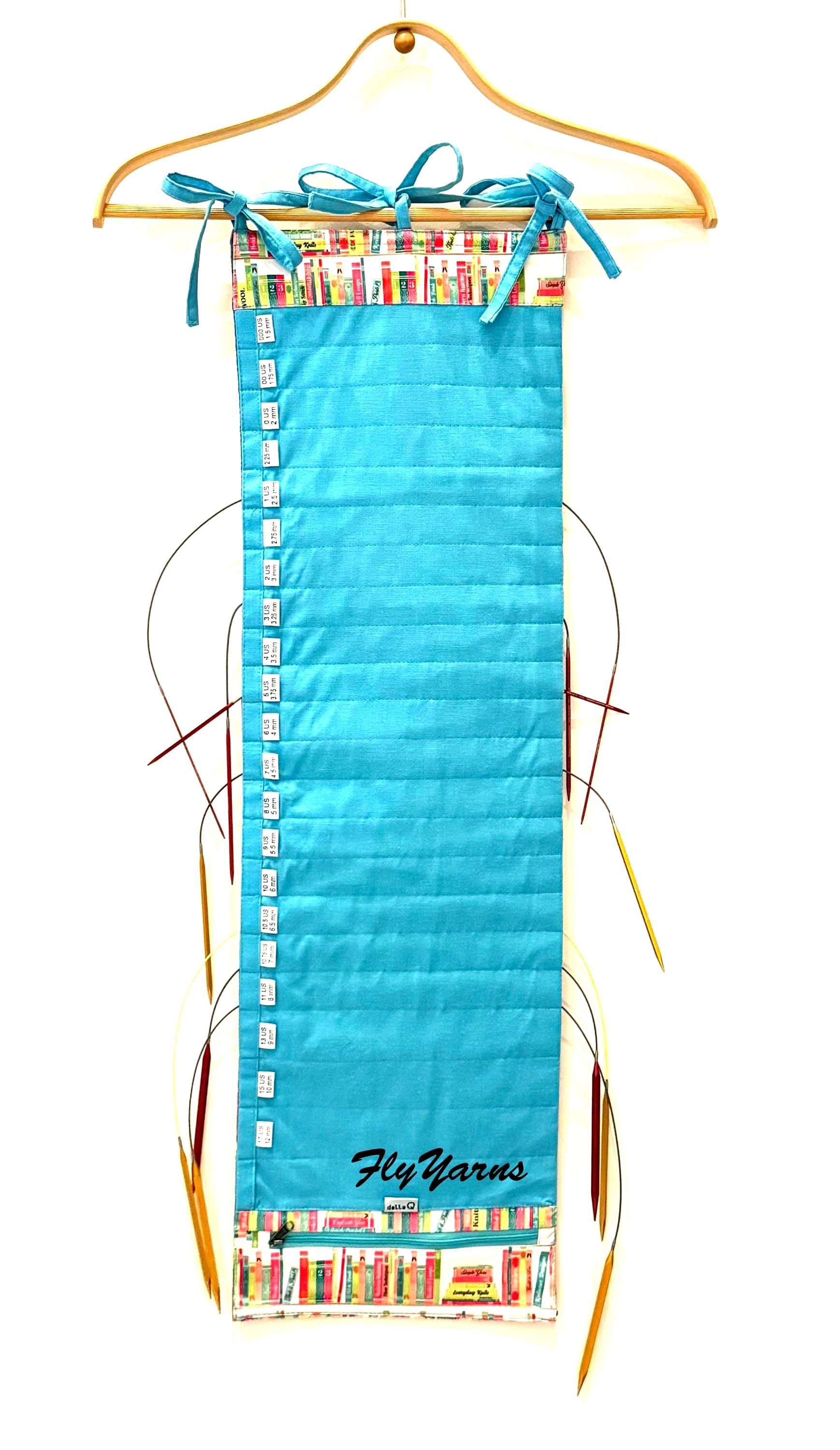 Della Q Hanging Circular Needle Case is a popular method for organizing your circular needles. This Linen Library Print for the Circular Knitting Needle Case is very smart in the new 2025 LINEN fabrics-just a knitter's dream for organizing all those knitting needles. Each slot can hold multiple circular needles of different lengths. The three ties at the top can be easily attached to a hanger, or closet rod. If you need to take it to go, simply roll it up and secure with the ties. Linen hanging case is a great choice if you plan on really loading up your case. The bottom section includes a long zip pocket for extra notions.