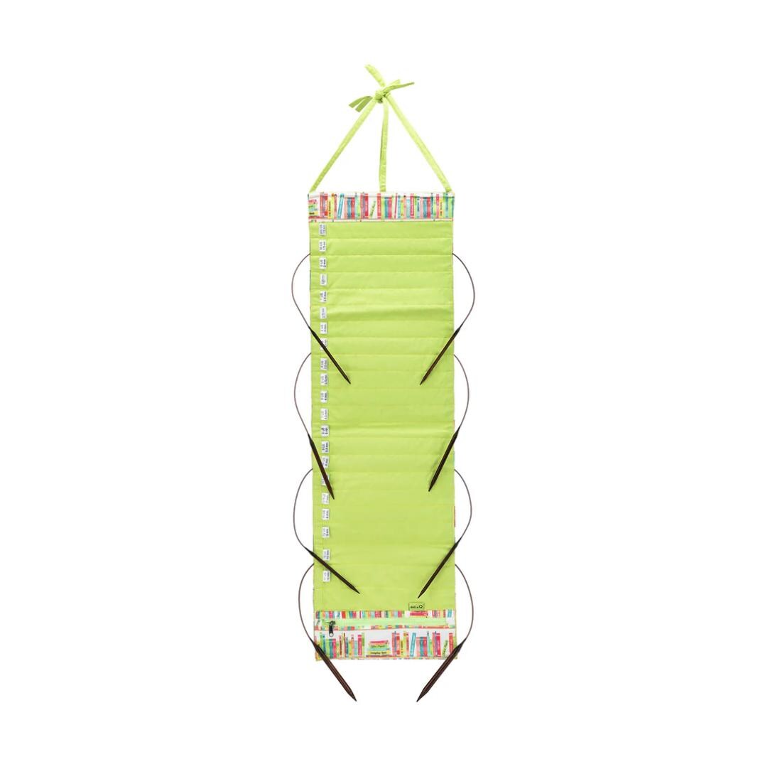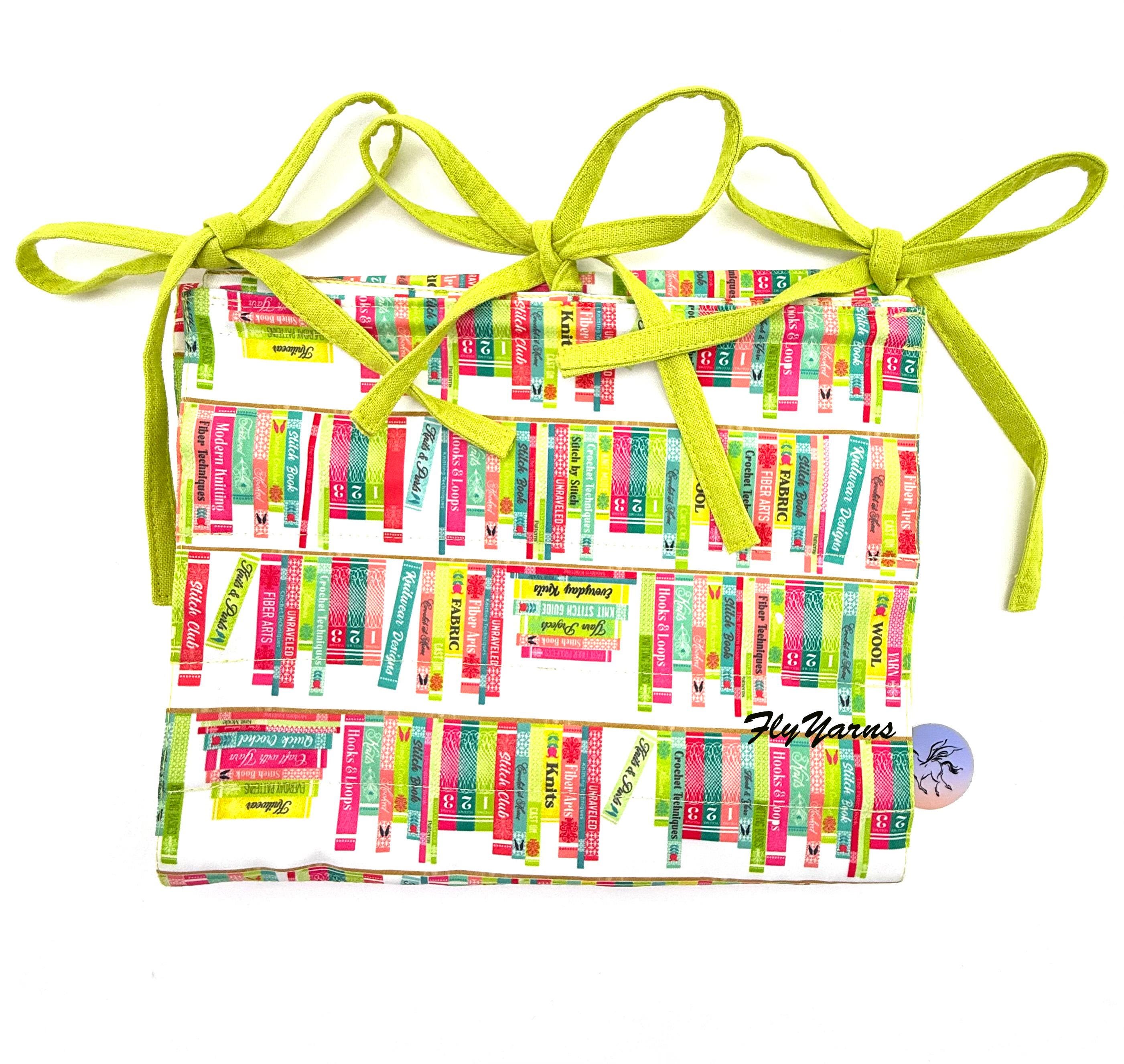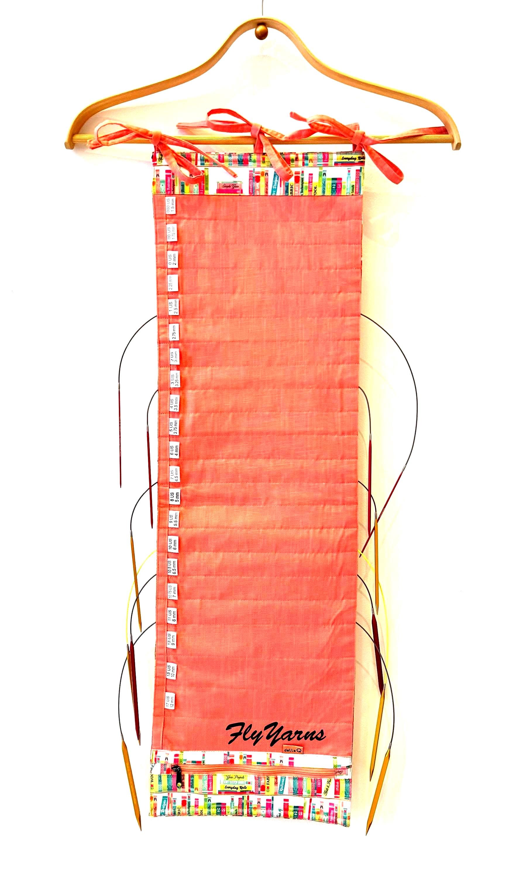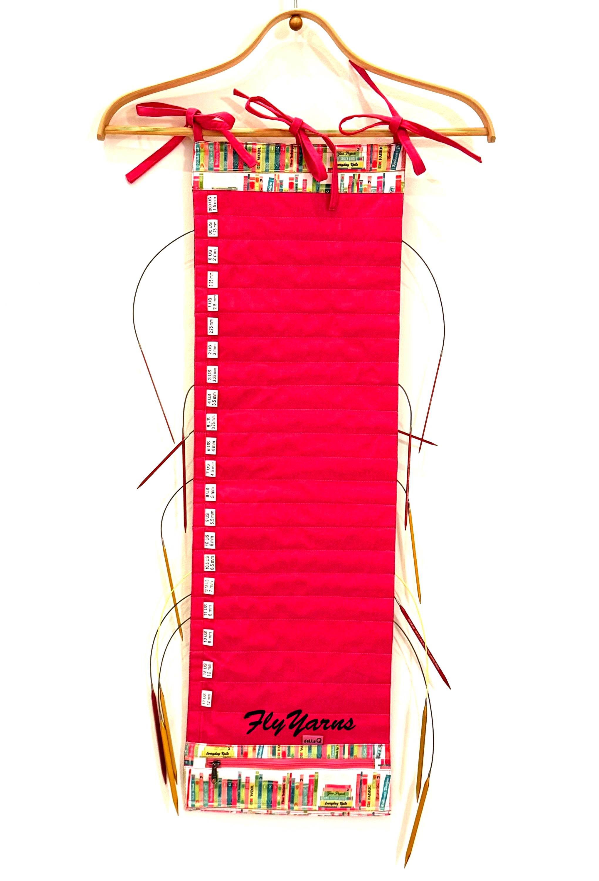 Della Q Hanging Circular Needle Case is a popular method for organizing your circular needles. This Linen Library Print for the Circular Knitting Needle Case is very smart in the new 2025 LINEN fabrics-just a knitter's dream for organizing all those knitting needles. Each slot can hold multiple circular needles of different lengths. The three ties at the top can be easily attached to a hanger, or closet rod. If you need to take it to go, simply roll it up and secure with the ties. Linen hanging case is a great choice if you plan on really loading up your case. The bottom section includes a long zip pocket for extra notions.