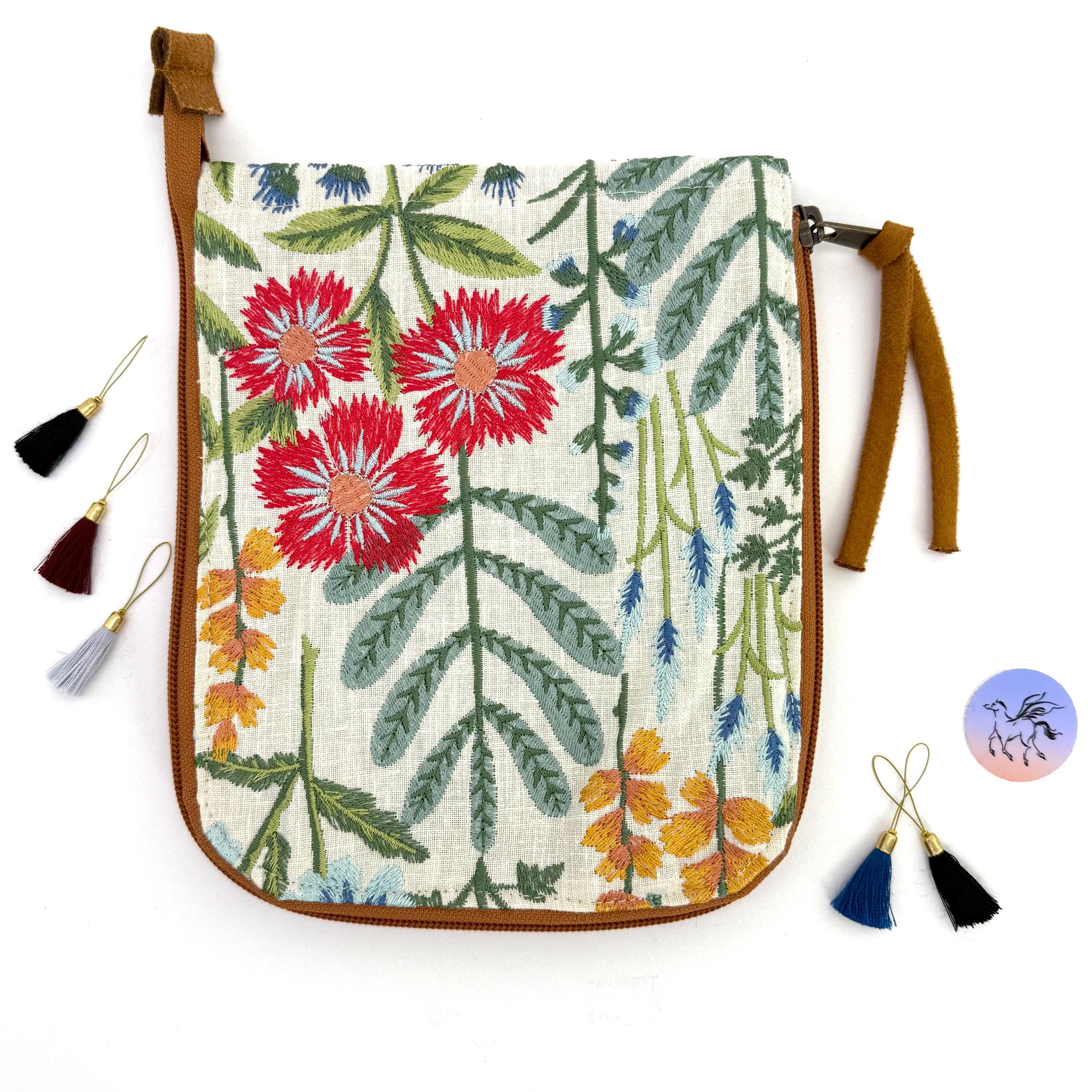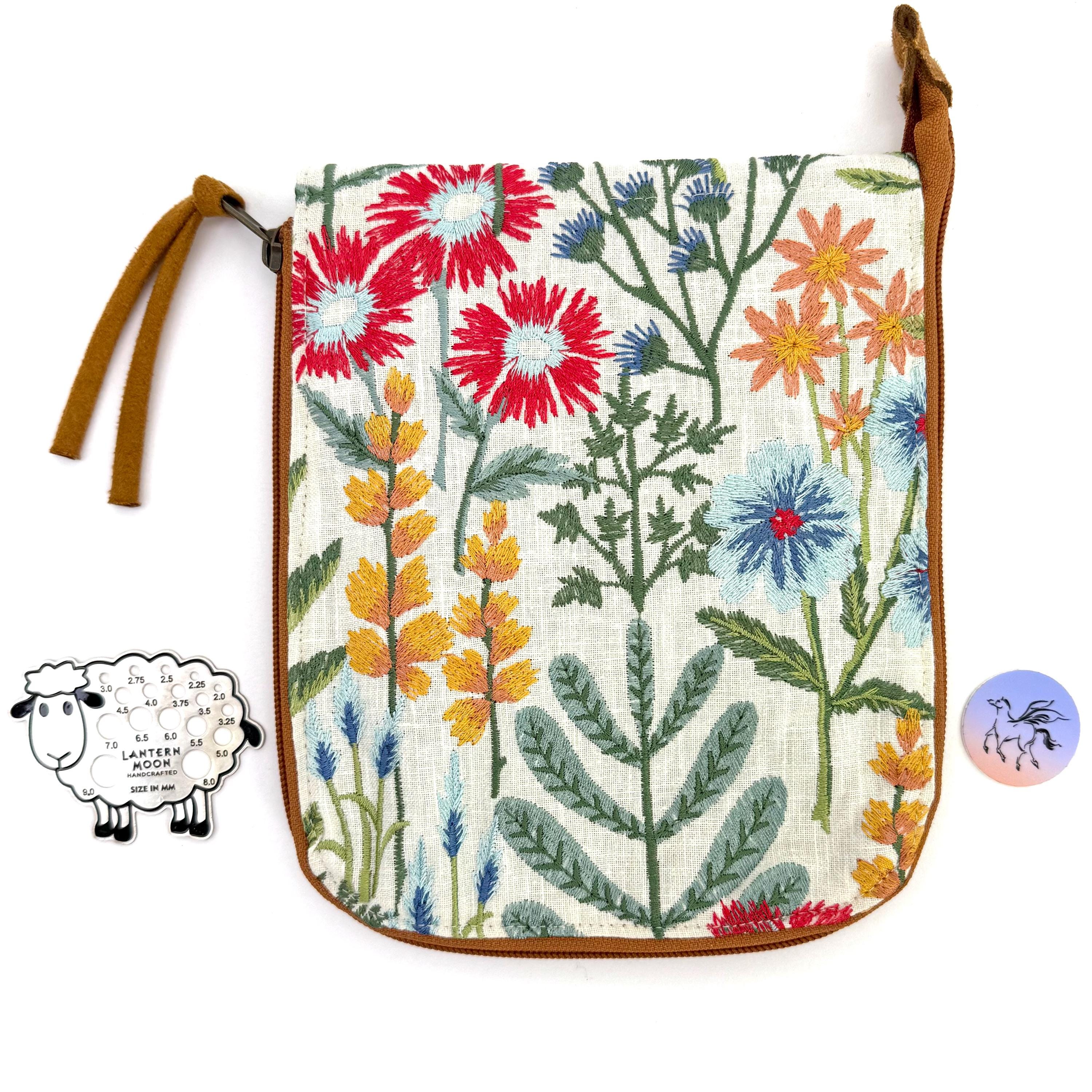 The Atenti Circular Needle Case Wildflower made with a summery embroidered floral design and a sienna zipper is a practical organizer for your circular needles. An all around zipper closure protects an interchangeable plastic booklet insert with 12 clear pockets. Case has one large inside fabric pocket for notions. Additional insert booklets available, see below.