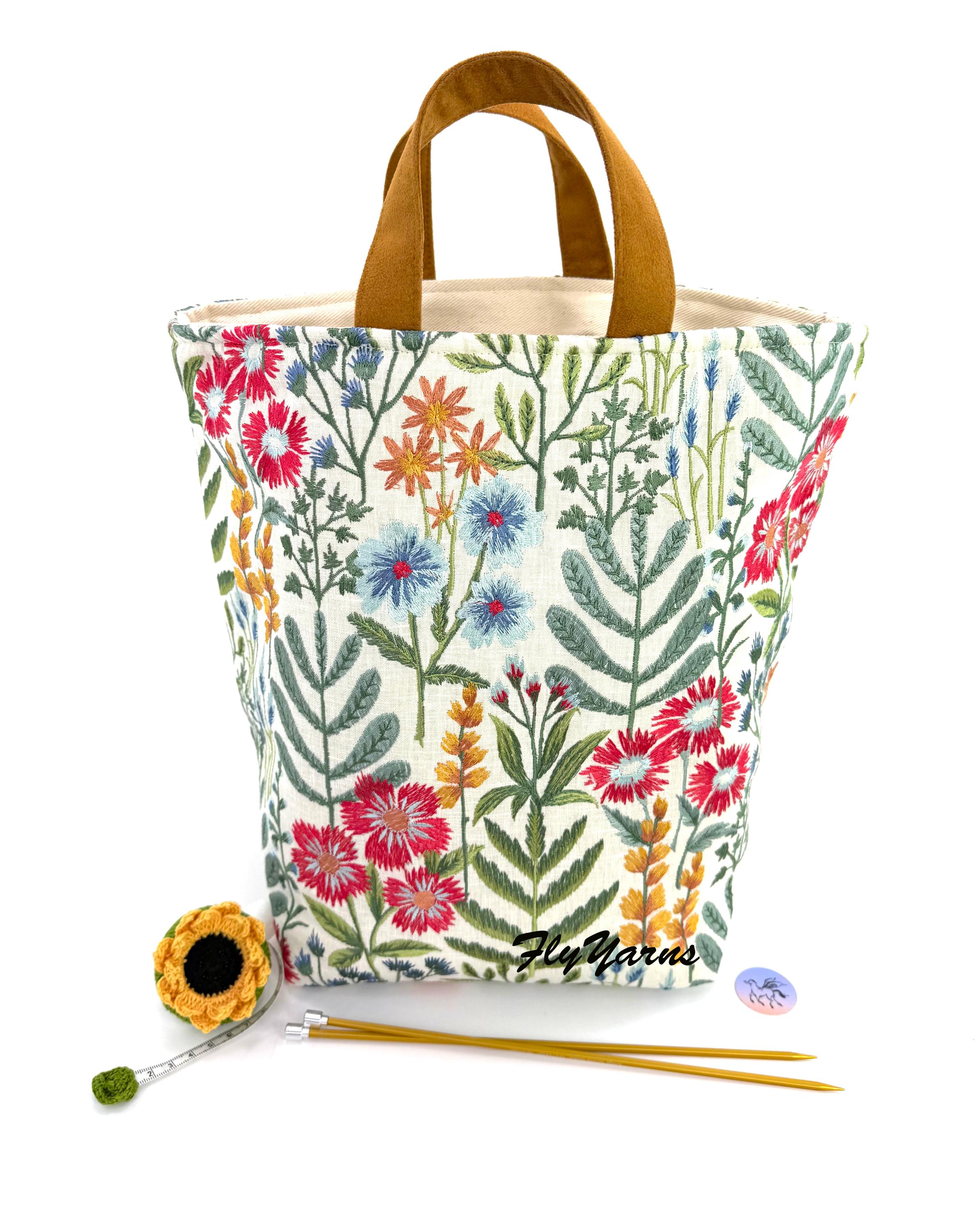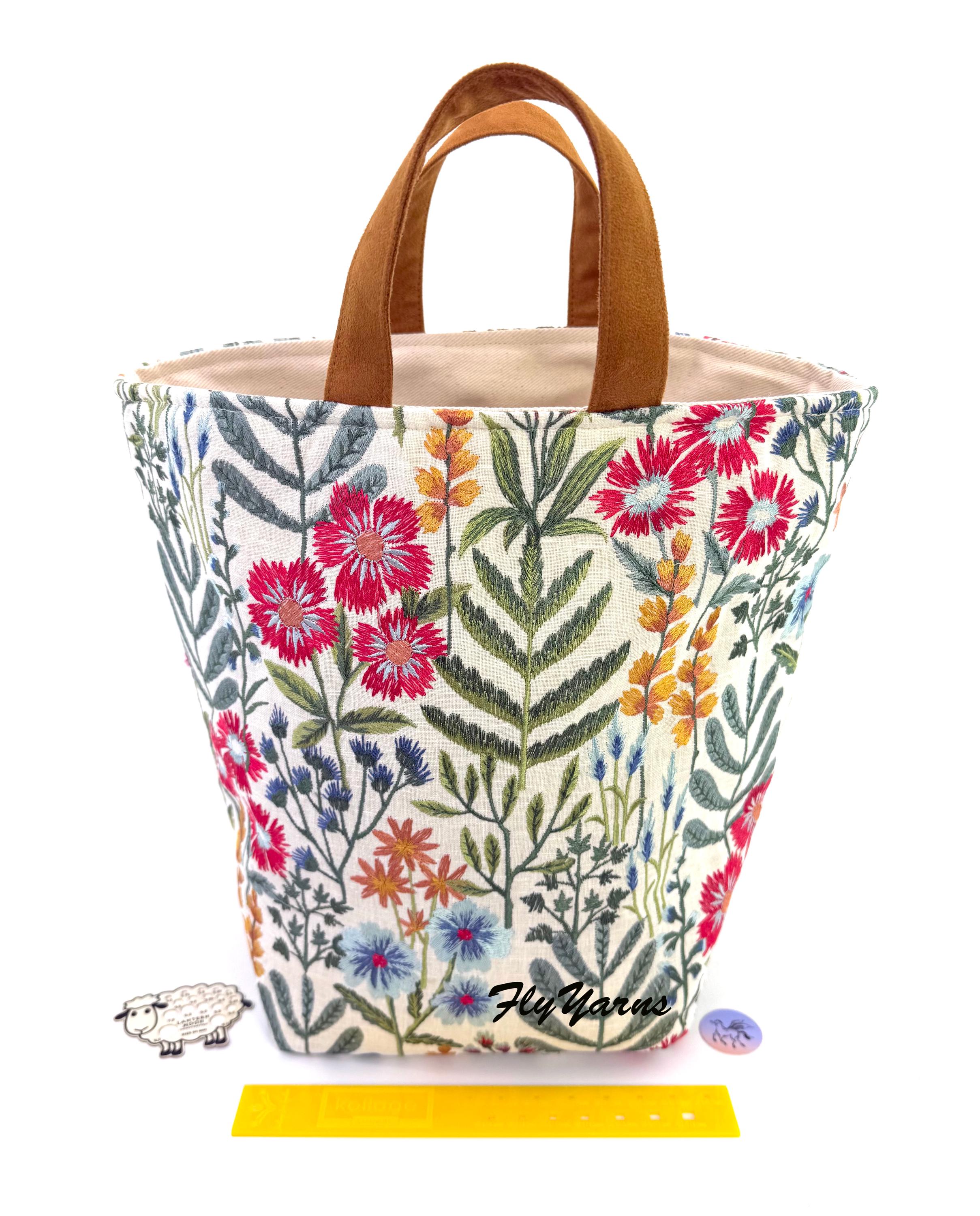 Atenti Hope Basket Wildflower is made of an exquistly embroidered floral fabric that is a roomy stand-alone project bag. The top rolls down for easy access with a wide opening and two handles. Fully lined in tan water repellent taffeta. Inside are slotted 5 pockets to hold needles, phone and notions. Makes an excellent crafter's gift or Birthday Gift.