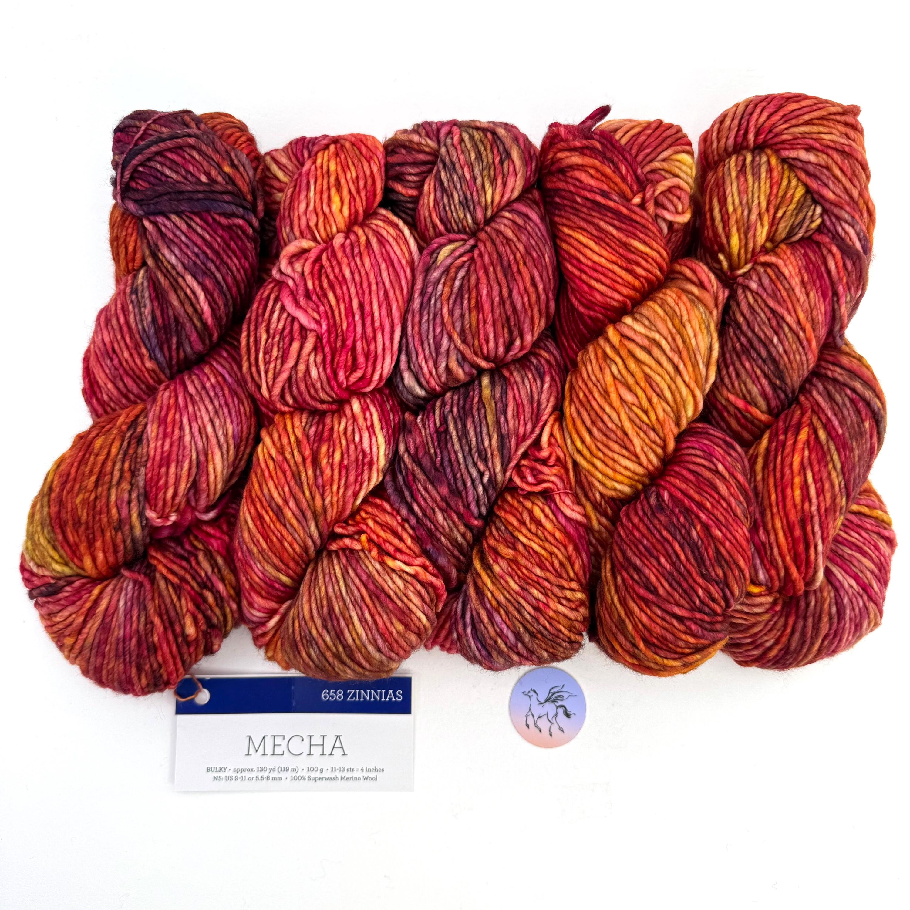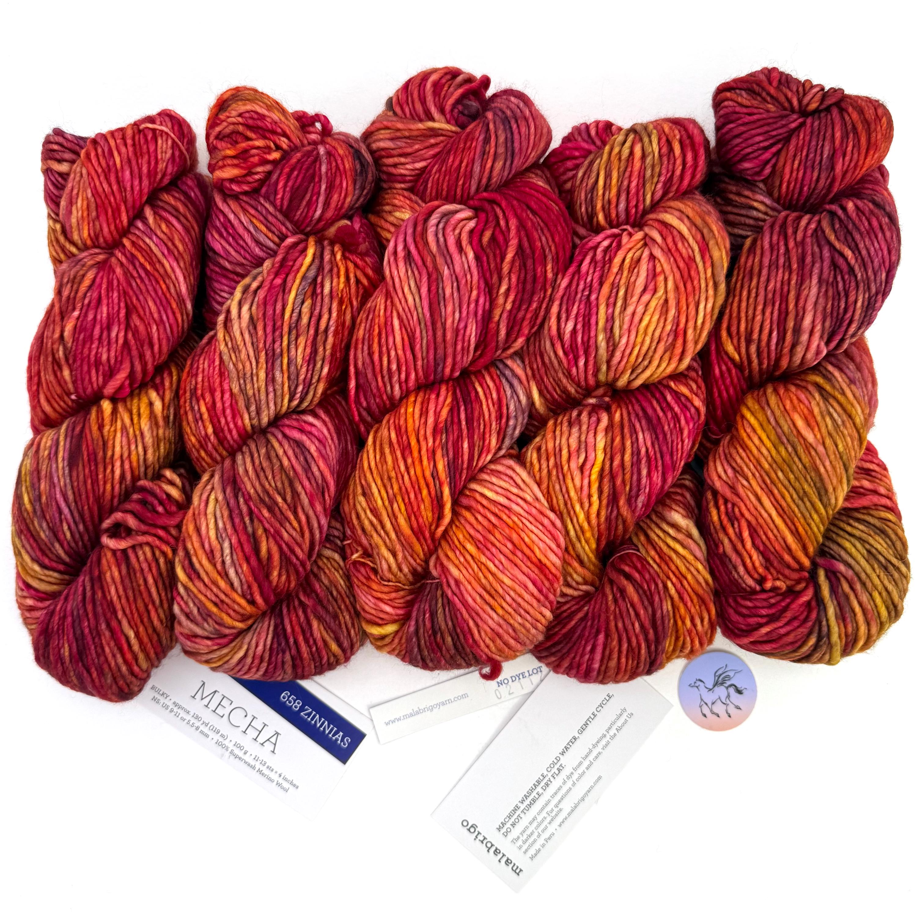 Malabrigo Mecha is a rare single-ply super-wash yarn! This merino takes color in the most vivid, rich way. Soft as always, Mecha Merino Wool is a slightly thick-and-thin yarn, with a lovely loft, and is the perfect choice for quick but not-too-heavy projects. Super-wash means you can wash your garments in cold water, gently, and your items will not shrink or felt. This listing is for color 658 Zinnias, with 10 hanks from Dye Lot 02 02 25 and one hank from different batch. If more than one hank is chosen it will be from the bag of 10.