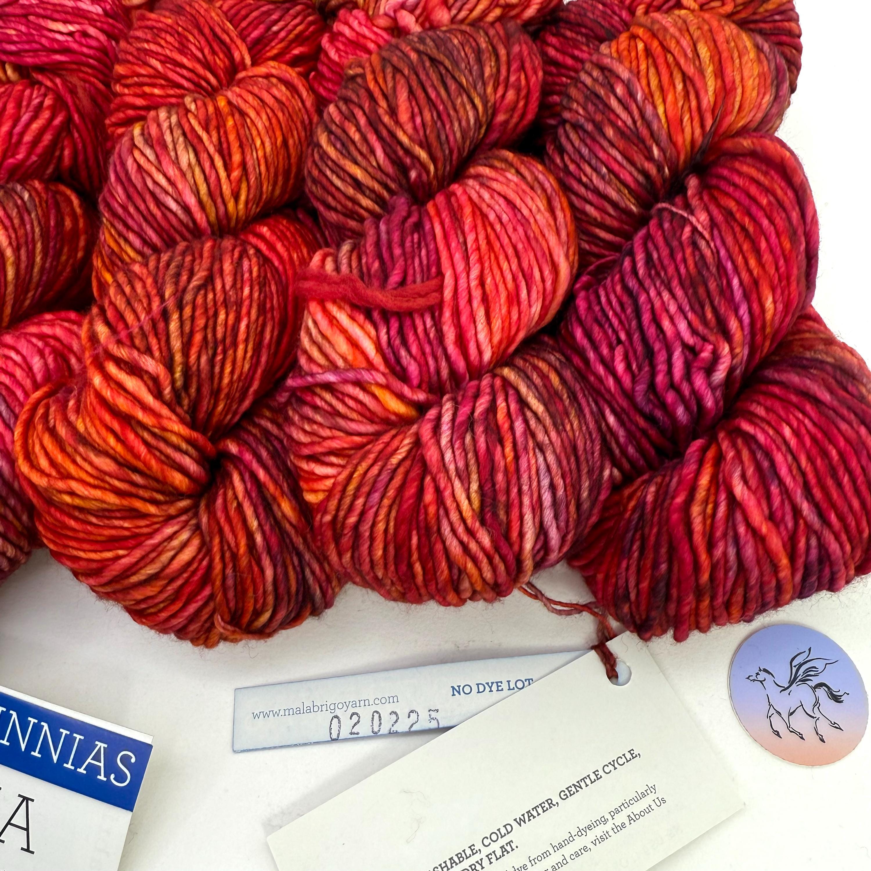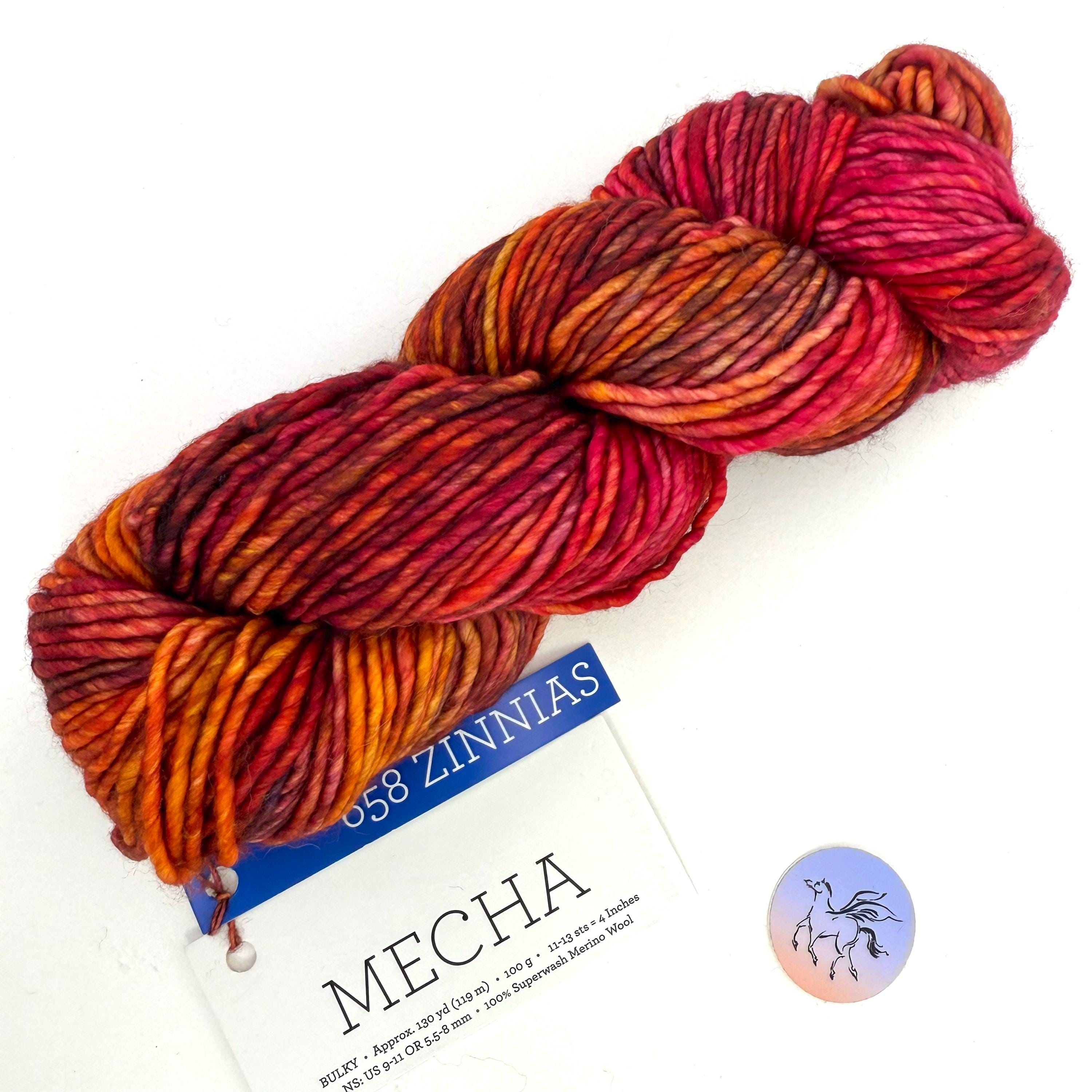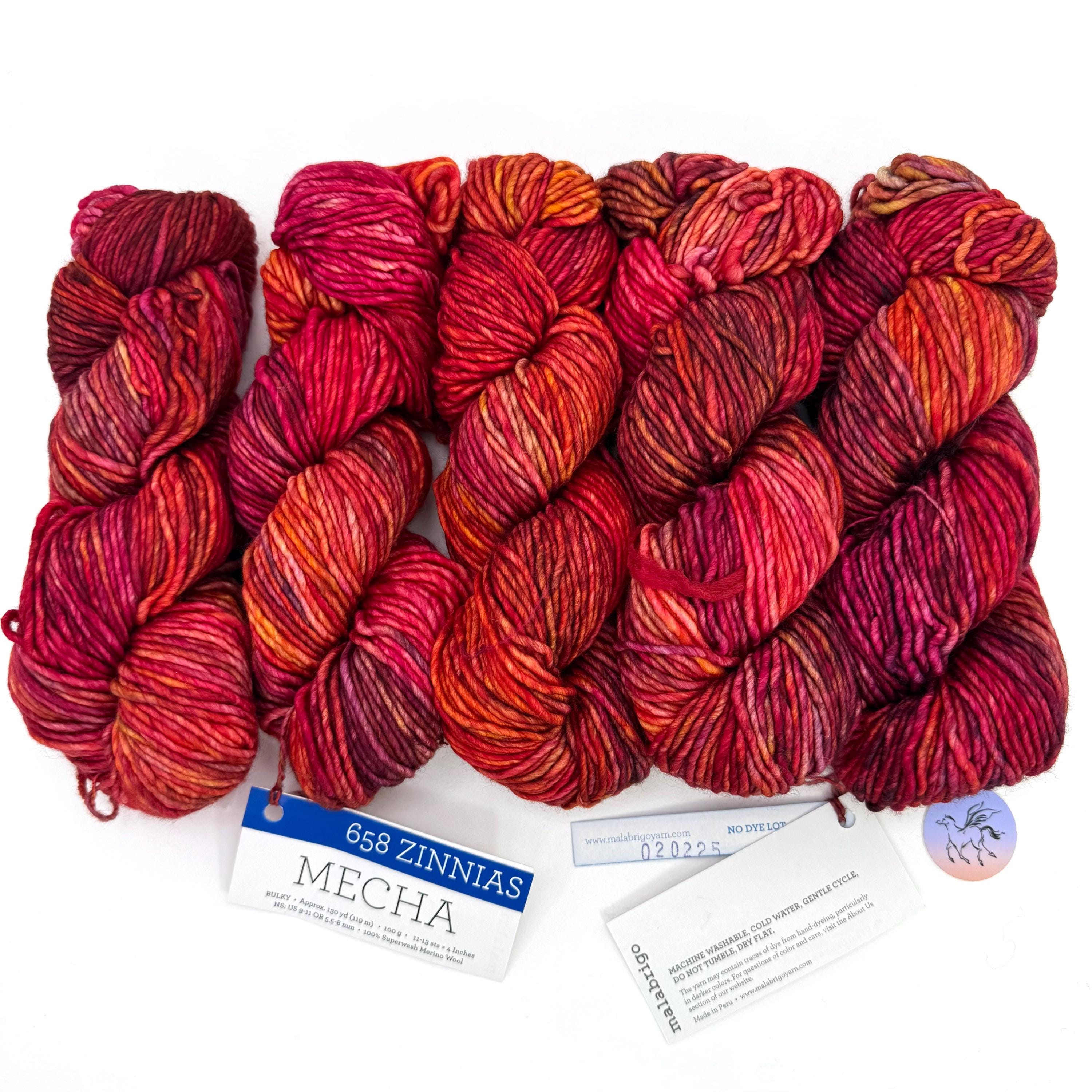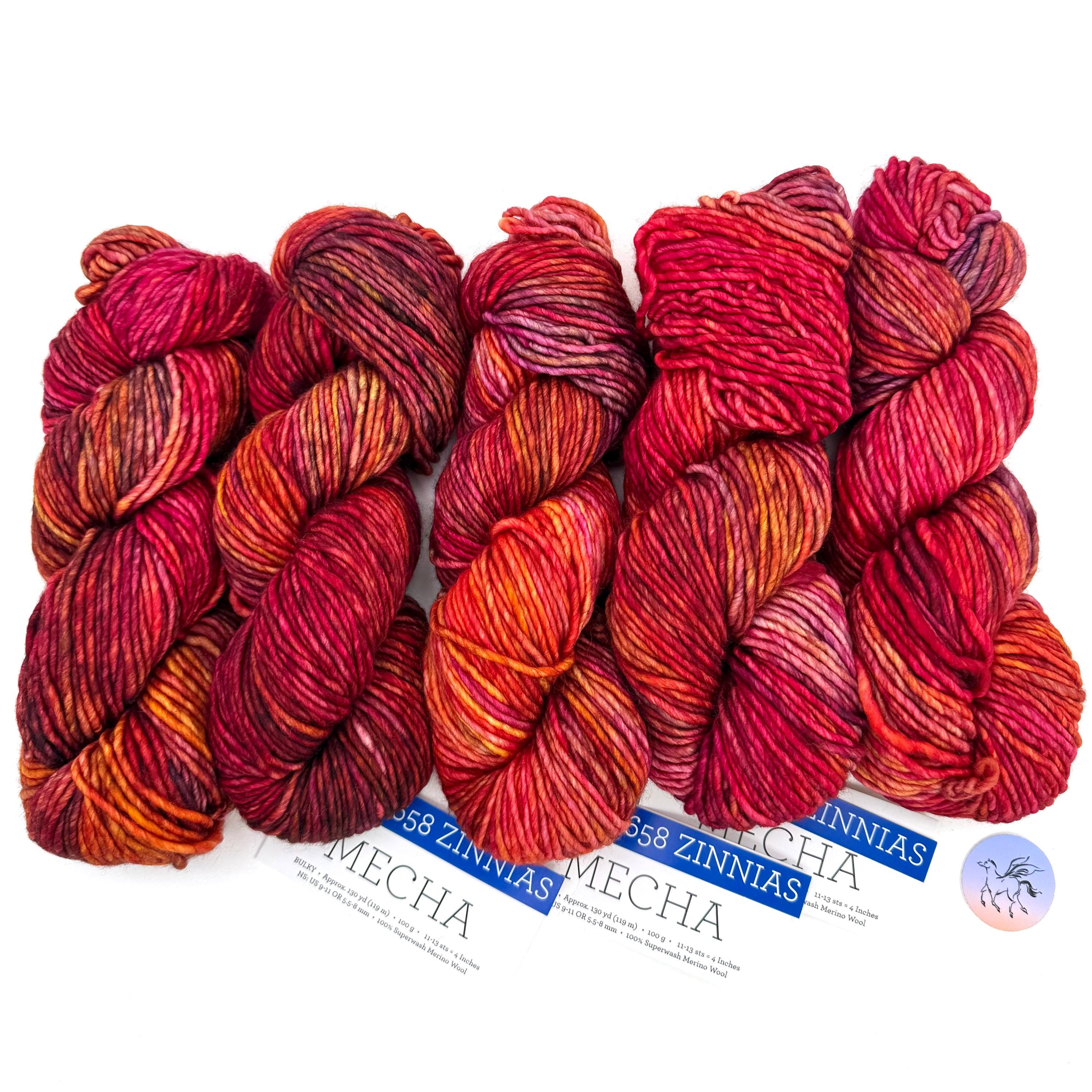 Malabrigo Mecha is a rare single-ply super wash yarn! This super wash merino takes color in the most vivid, rich way, and nowhere is that more apparent than in the multi-layered hues of Mecha! Soft as always, Mecha Merino Wool is a slightly thick-and-thin yarn, with a lovely loft, and is the perfect choice for quick but not-too-heavy projects. A super wash yarn in single-ply is a rare find especially with pink and blue colors and tones. Super wash means you can wash your garments in cold water, gently, and your items will not shrink or felt. This listing has 10 skeins all from the same batch in color of 658 Zinnias yarn. Be sure to buy enough for your project. Priced per hank.