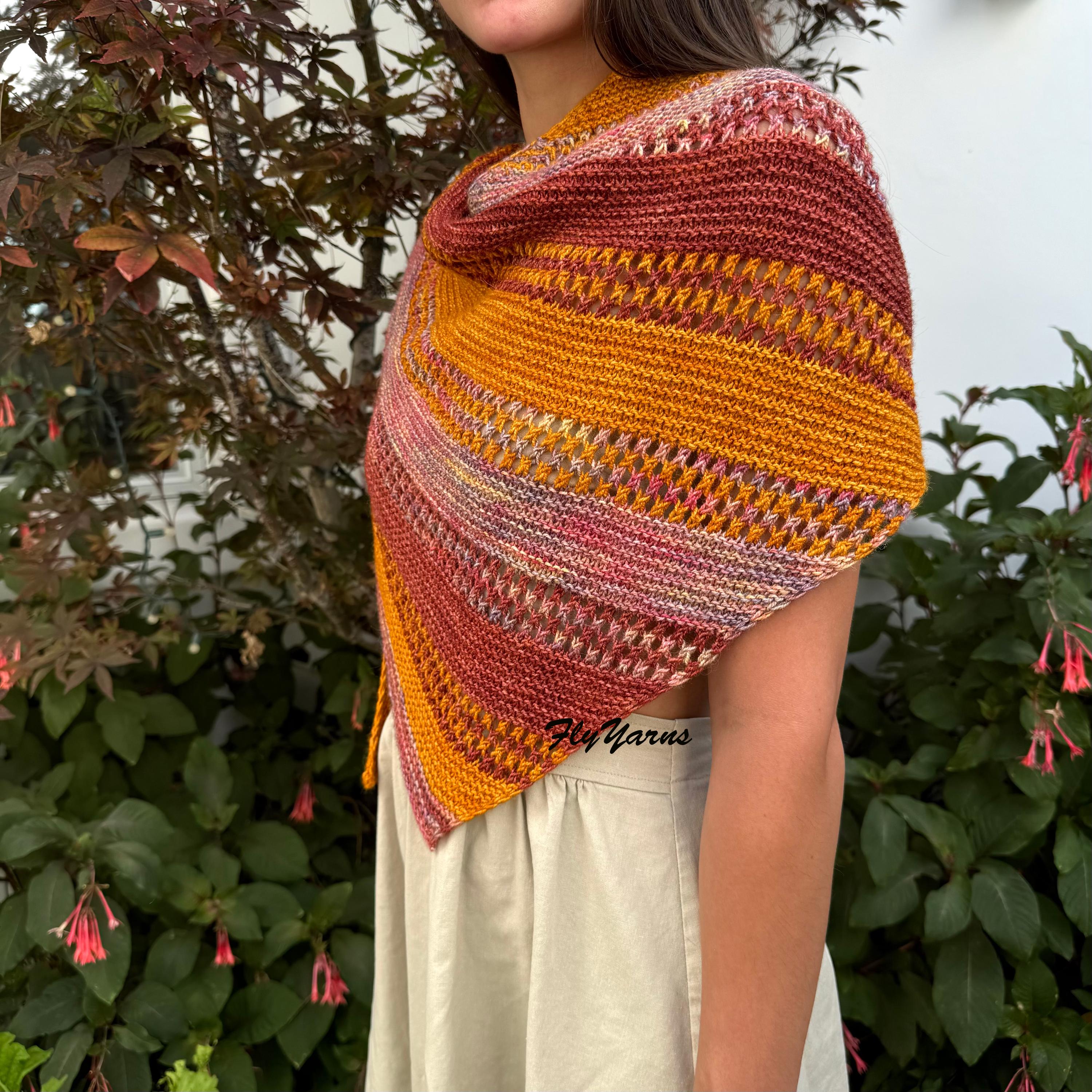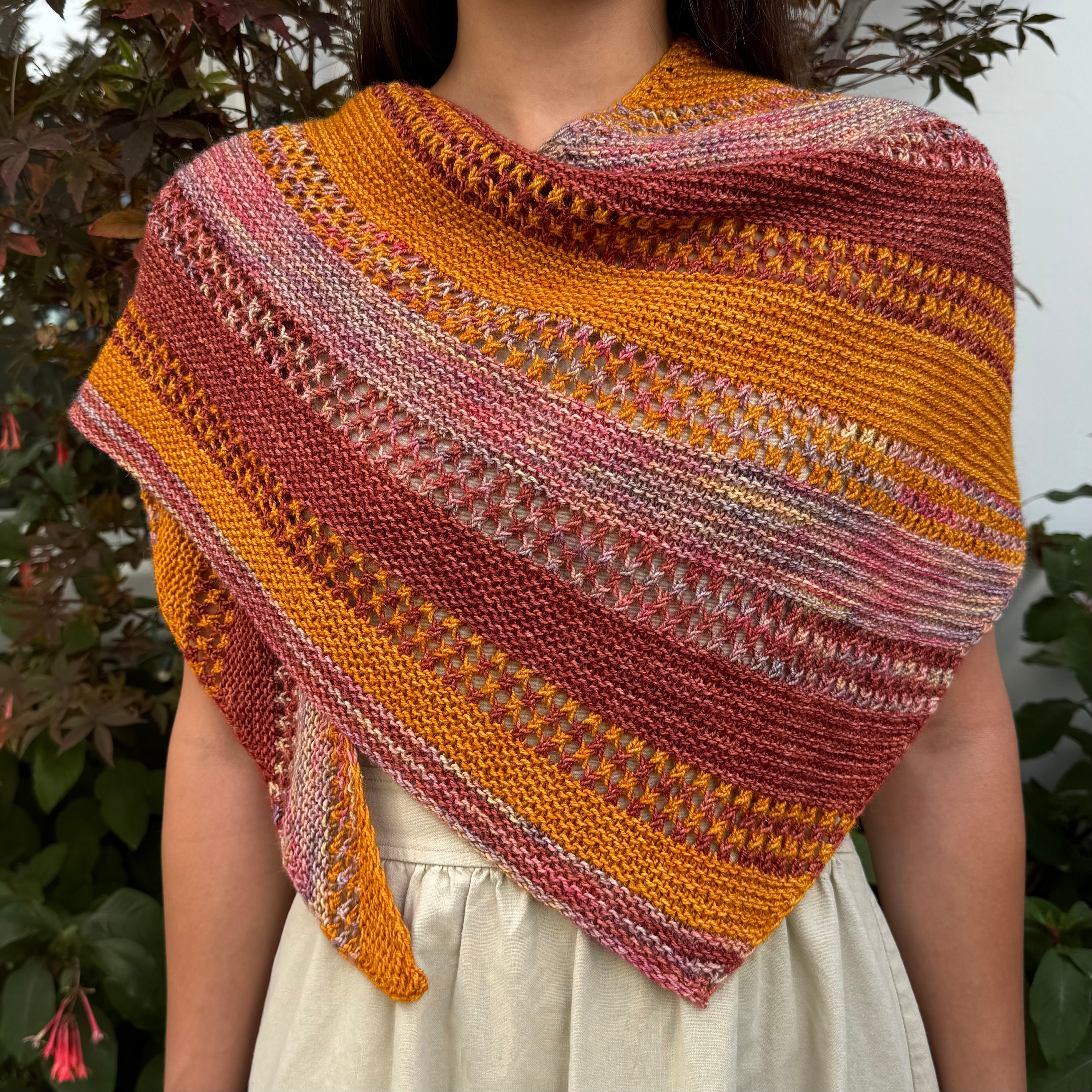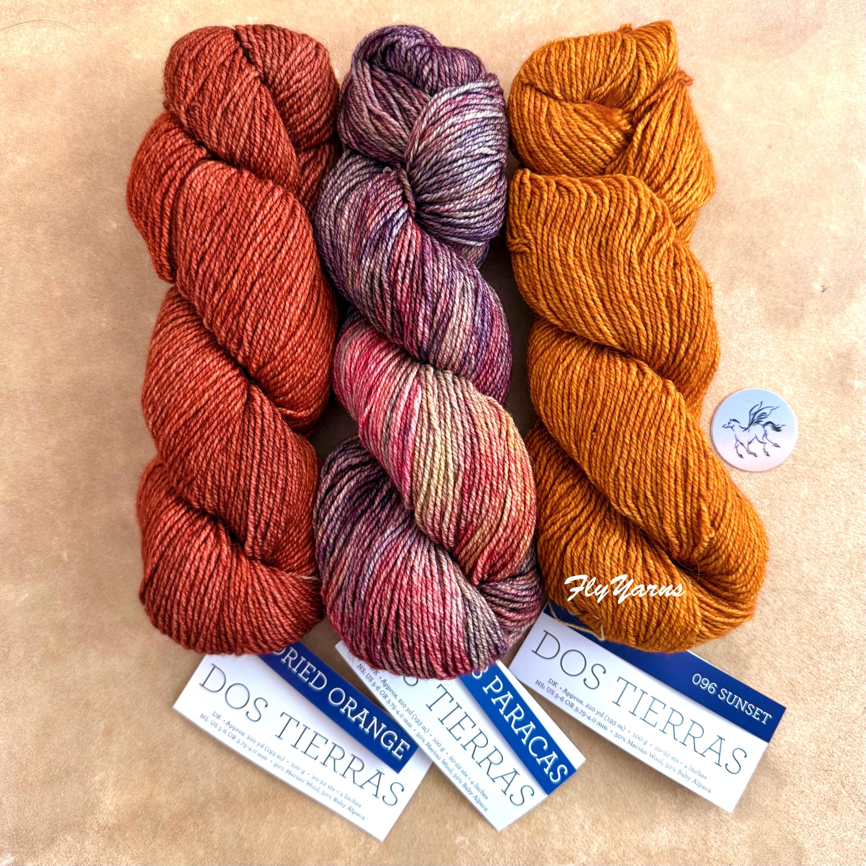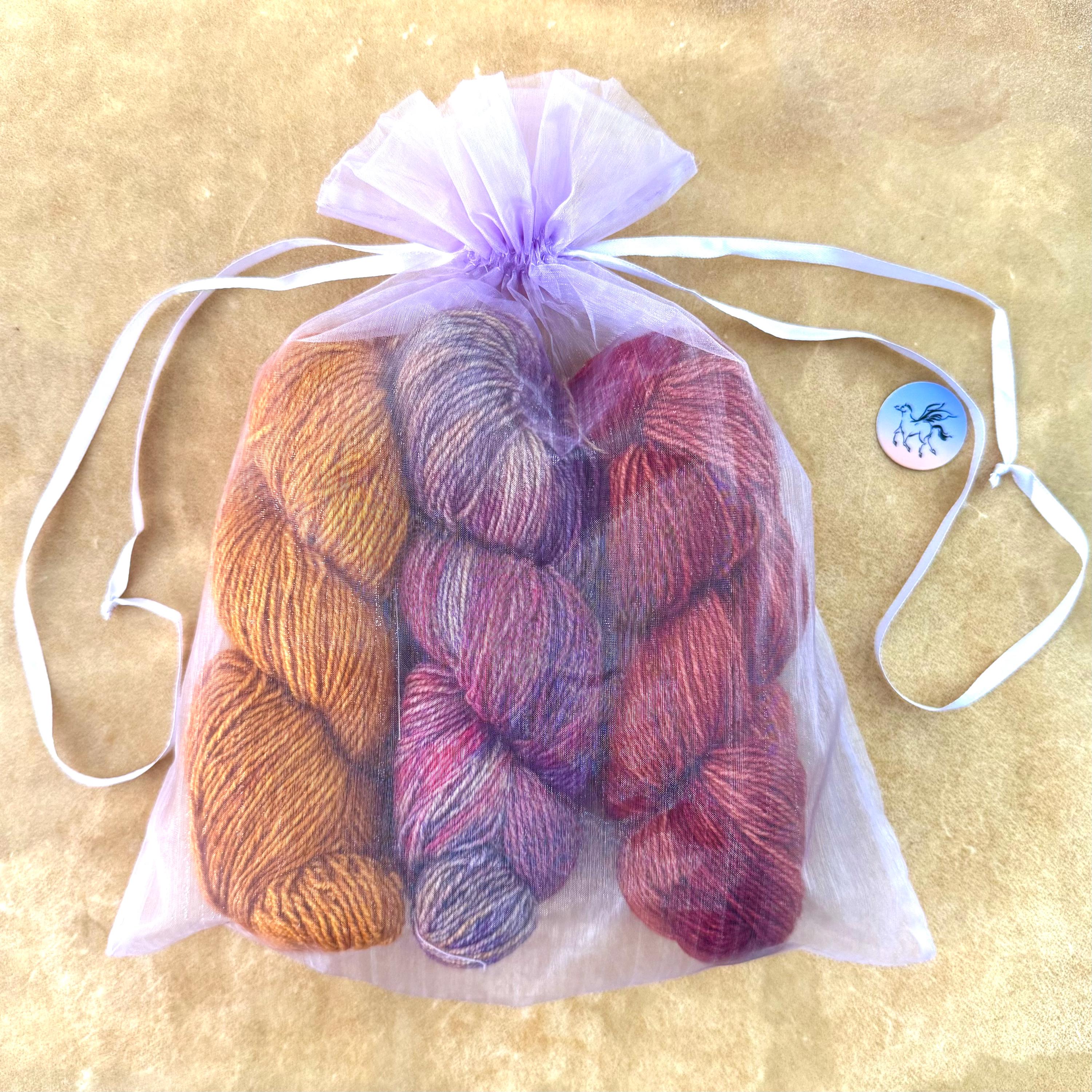 Kit for Malabrigo Dos Tierras Friendship Shawl yarn in Dried Orange 895, Paracus 338 and Sunset 096. This shawl was the Malabrigo Dos Tierras KAL in March 2024. The kit comes in an organza bag - a reusable small project bag. Shawl is designed by Jill Tamminen; pattern available on Ravelry as the KAL has ended.