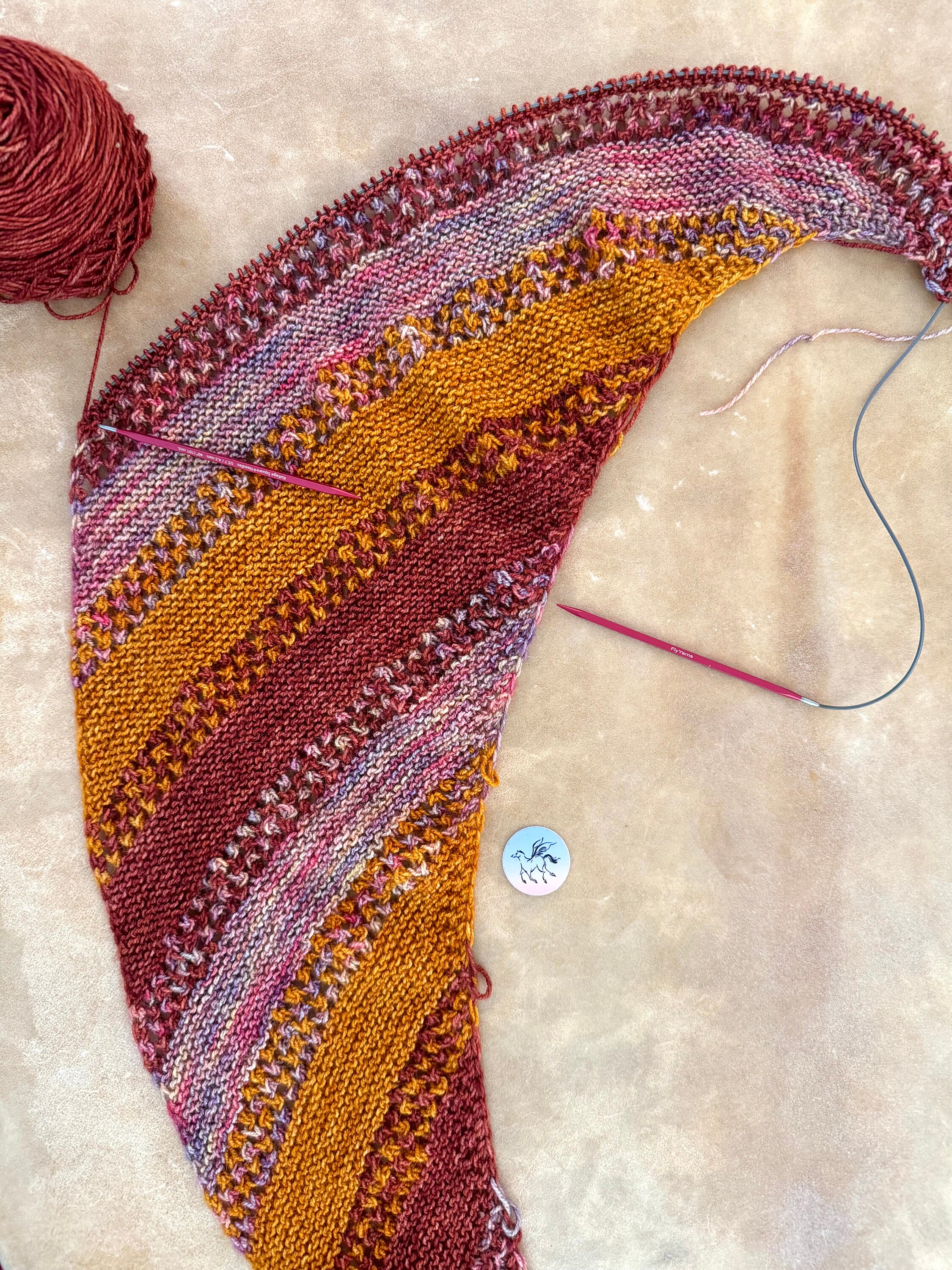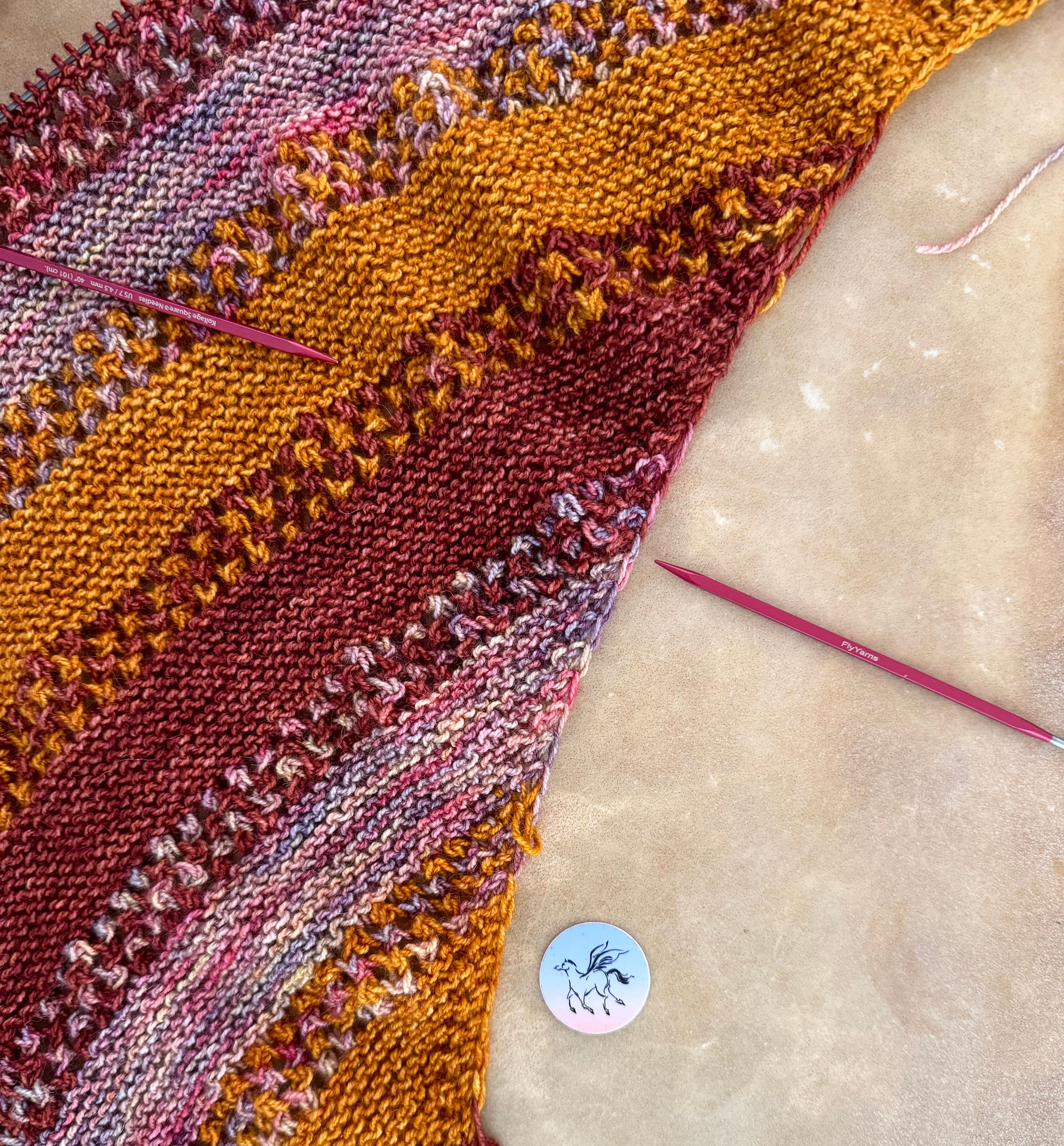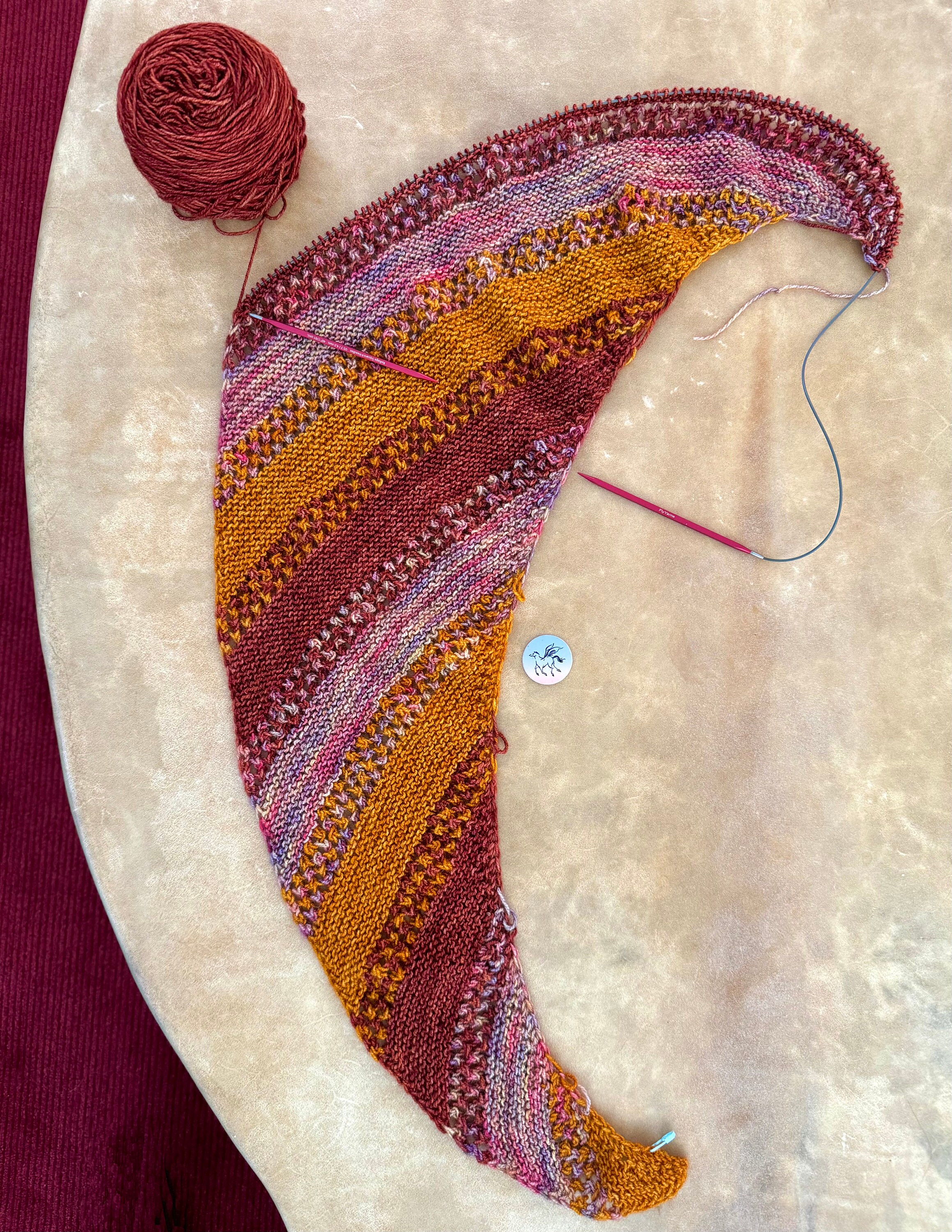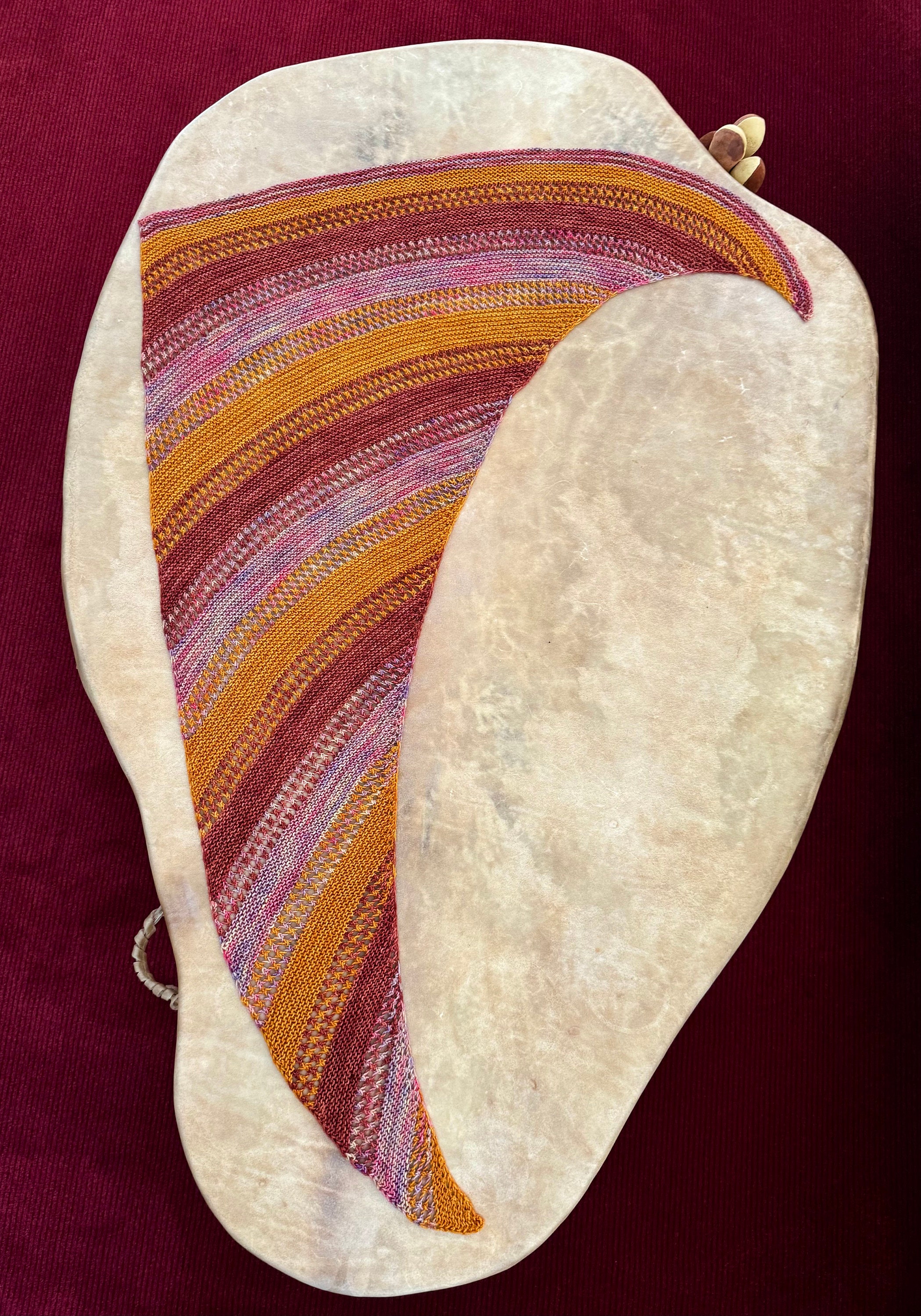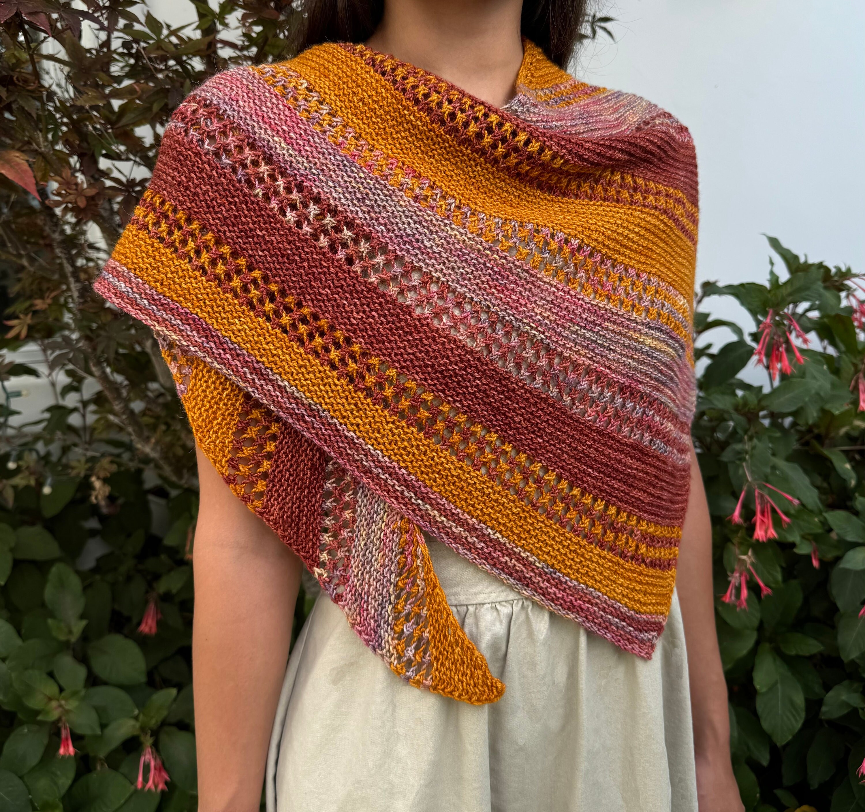 Kit for Malabrigo Dos Tierras Friendship Shawl yarn in Dried Orange 895, Paracus 338 and Sunset 096. This shawl was the Malabrigo Dos Tierras KAL in March 2024. The kit comes in an organza bag - a reusable small project bag. Shawl is designed by Jill Tamminen; pattern available on Ravelry as the KAL has ended.