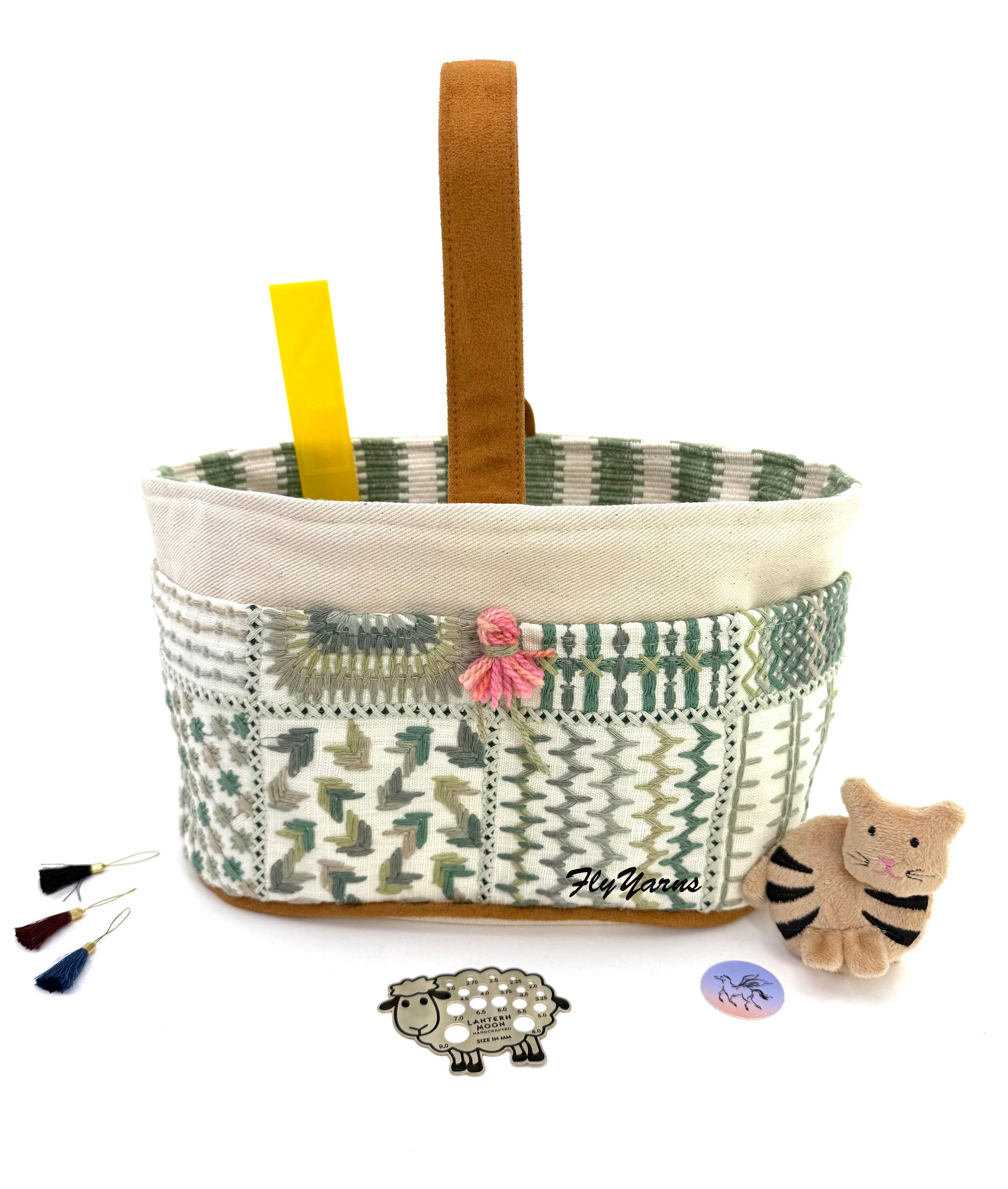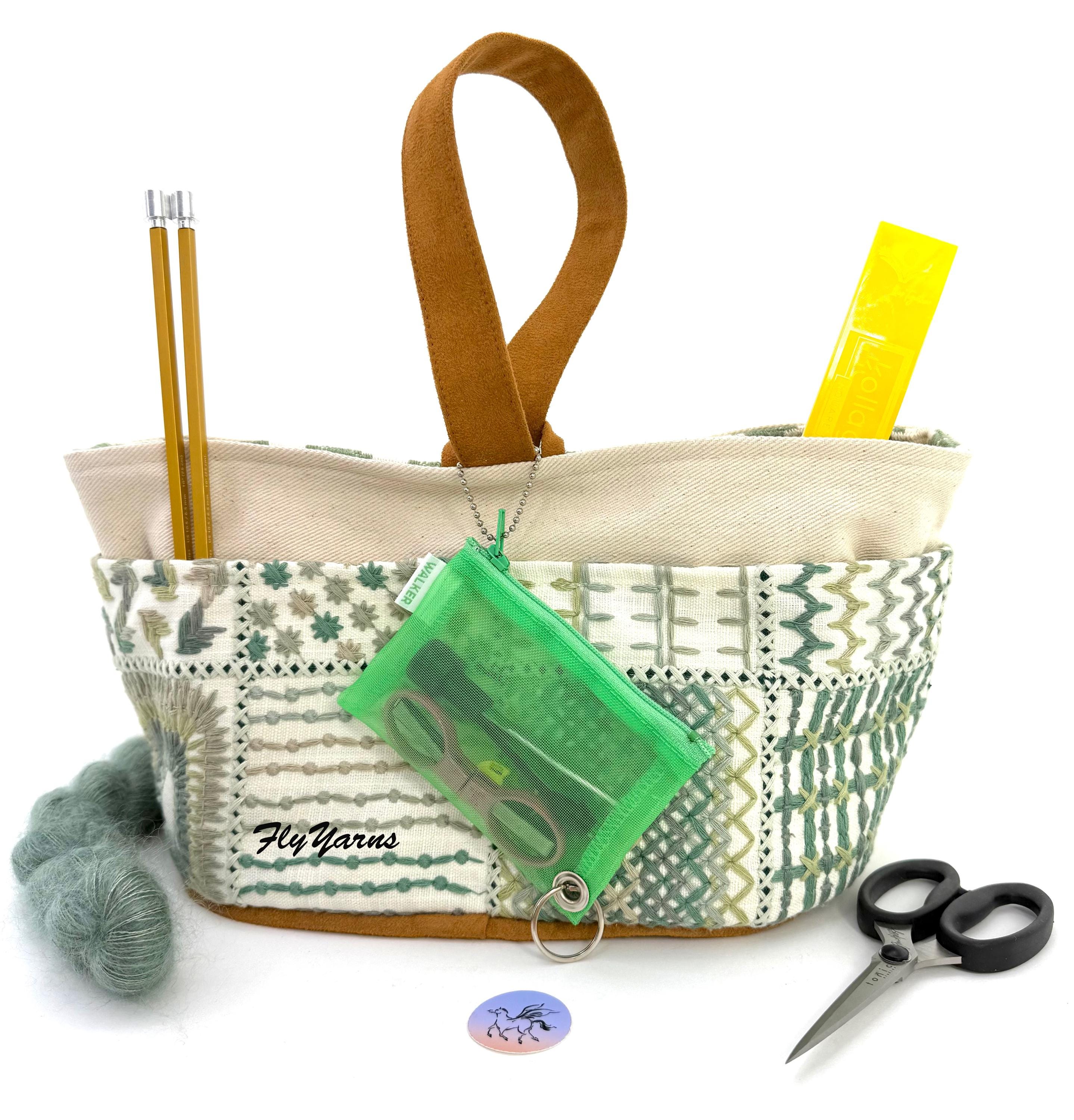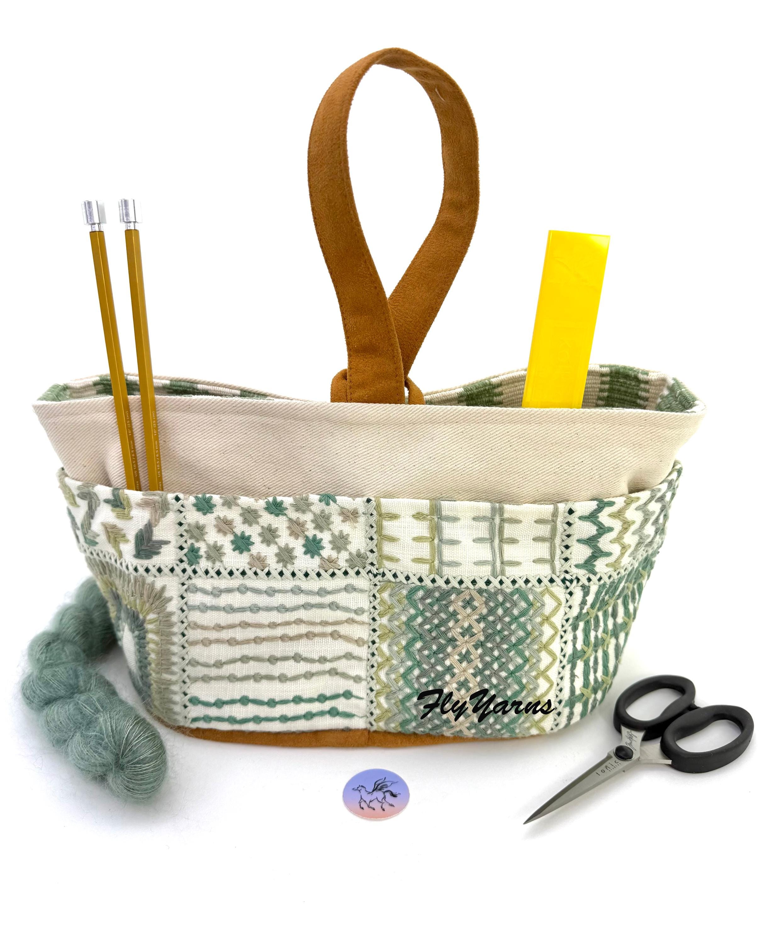 Atenti Short Caddy in an embroidered Granny Square pattern on a heavy duck canvas, called Lily. A Gold vegan Ultra Suede handle is fully lined and has four outside and four inside pockets with an ample center well with and edged lining of cream denim. Designed for multiple yarn projects, beading, and crafting it has 8 pockets and plenty of room inside to hold a project. The short height gives you easy access to the inside of the caddy which is lined in a water resistant taffeta. This embroidered bag best fits a hat, sock, or baby clothes project. For a larger project check out the matching Hope Basket-see the link below. Keep your tools together and always be ready for a crafting break 🌴