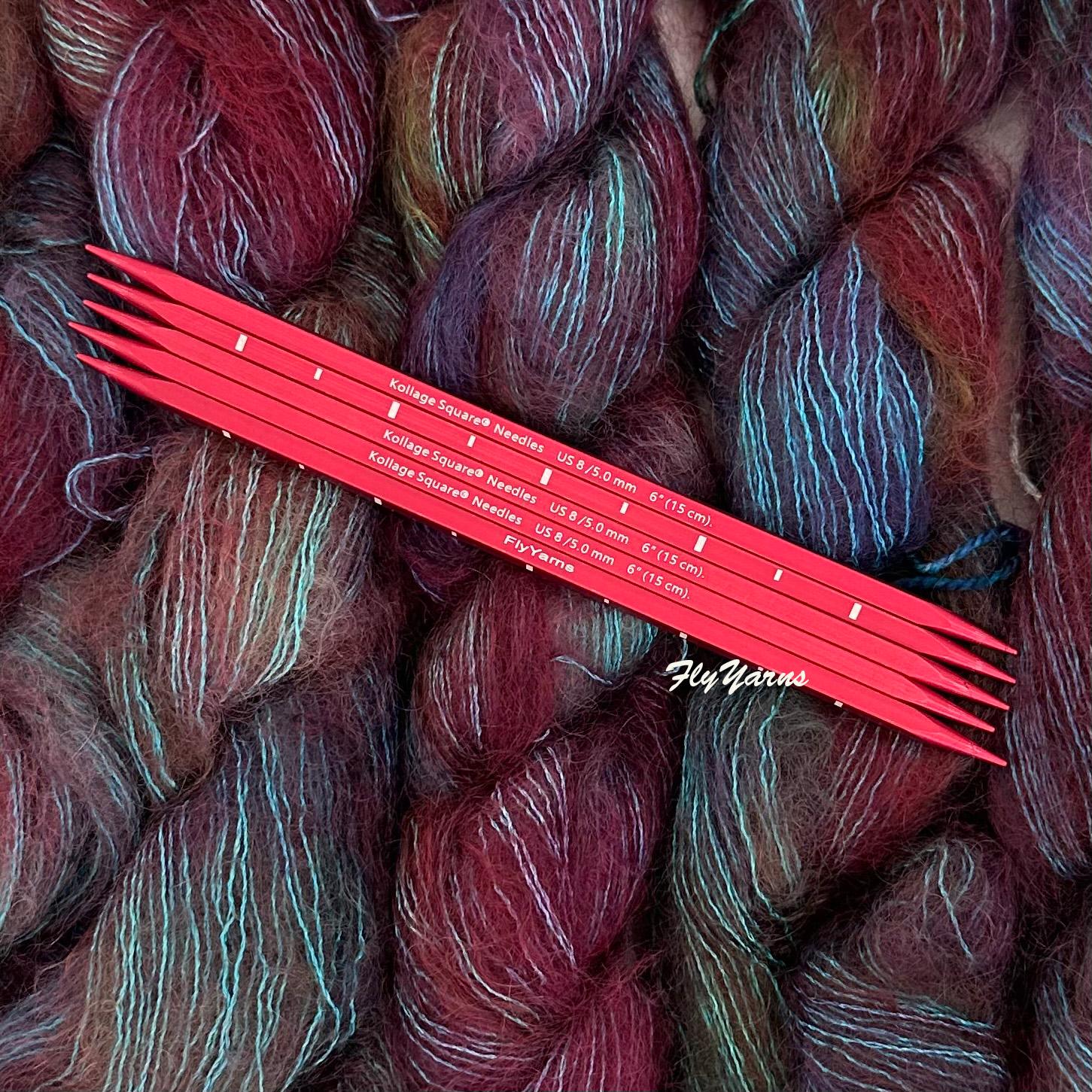 Kollage Double Pointed SQUARE Red Needles 6" length in sizes US2-US3 Kollage needles are the Original Four Sided Knitting Needles and each size is a set of 5 double pointed needles. Made of a high grade aluminum -shades of blue may vary, these needles have precise points which are excellent for fine yarns such as fingering yarn, sock yarn and lace yarn. Kollage knitting needles originally became known for the Square® shape which are easier on your hands while producing a more even stitch gauge. Each needle is laser etched with size, length and Flyyarns. Kollage Needles are now made in Canada.