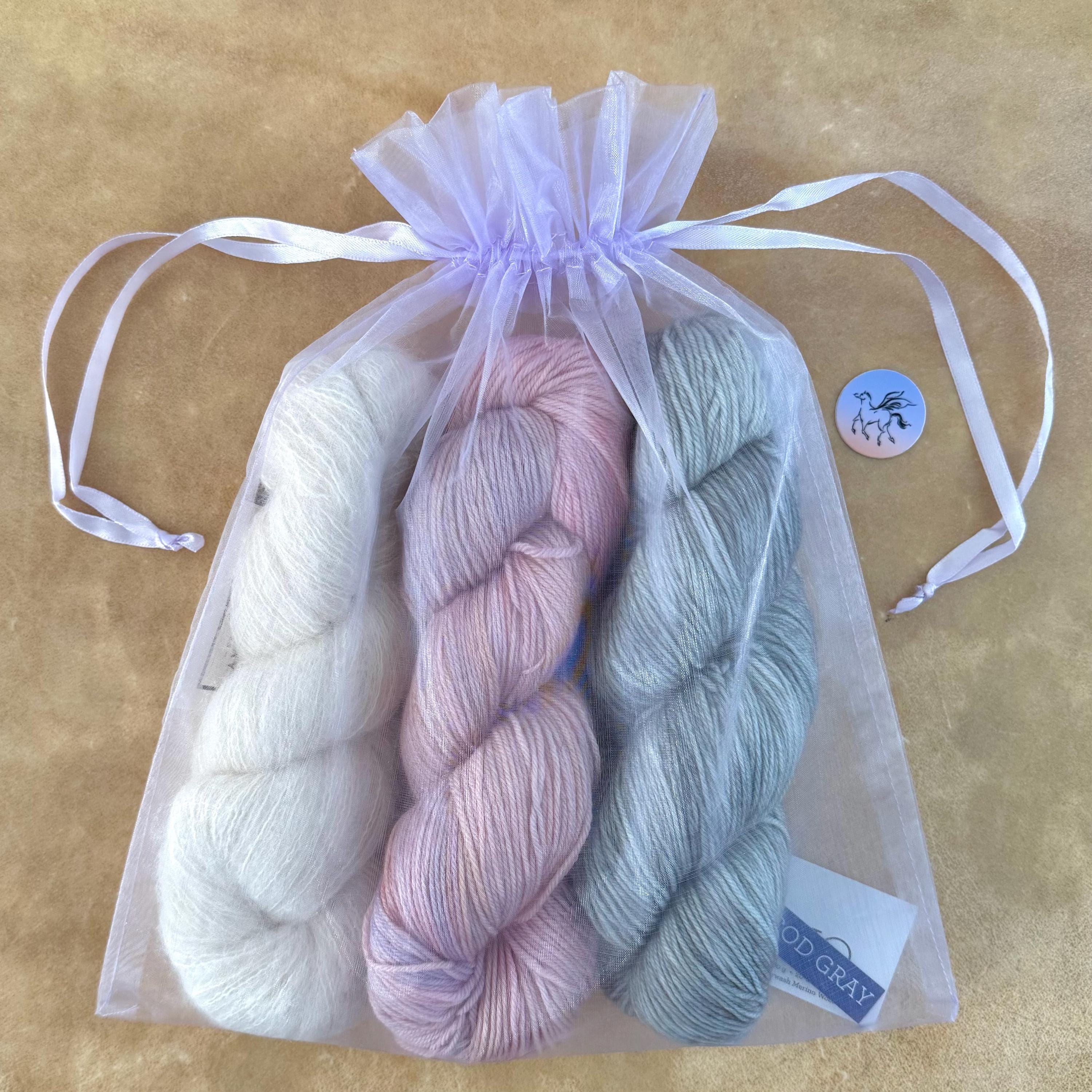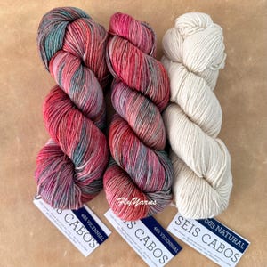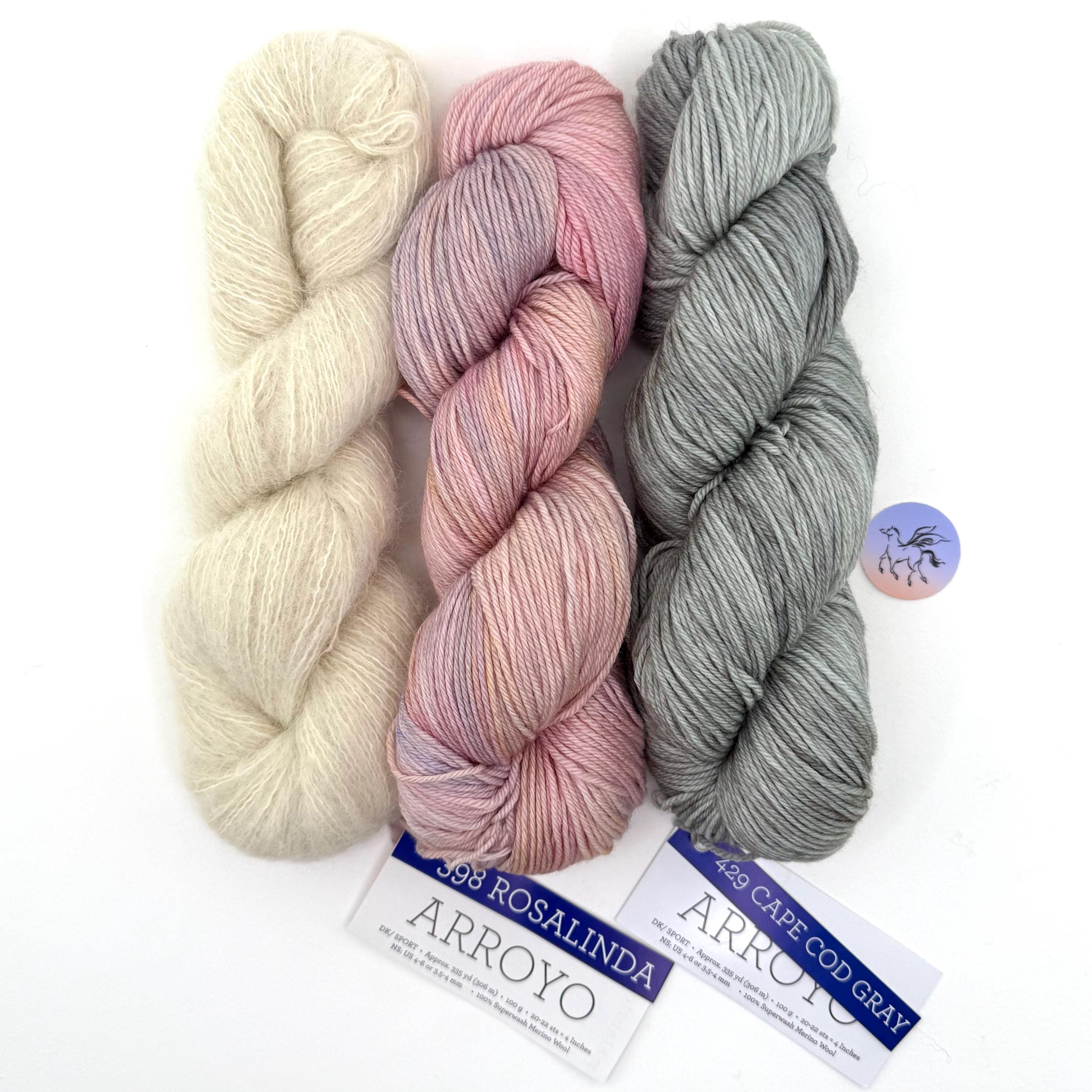 Kit includes: 1 Arroyo Rosalinda 398, 1 Arroyo Cape Cod Gray and Prairie Yarrow, all in a lovely organa bag. Also a single soak comes with each kit. Arroyo has quickly become a favorite among knitters! It’s perfect for those everyday lightweight (but warm) garments, and the superwash wool means it’s easy to take care of. Think of it as a Rios’s baby brother! Prairie is produced by Blue Sky Fibers-see yarn details below.