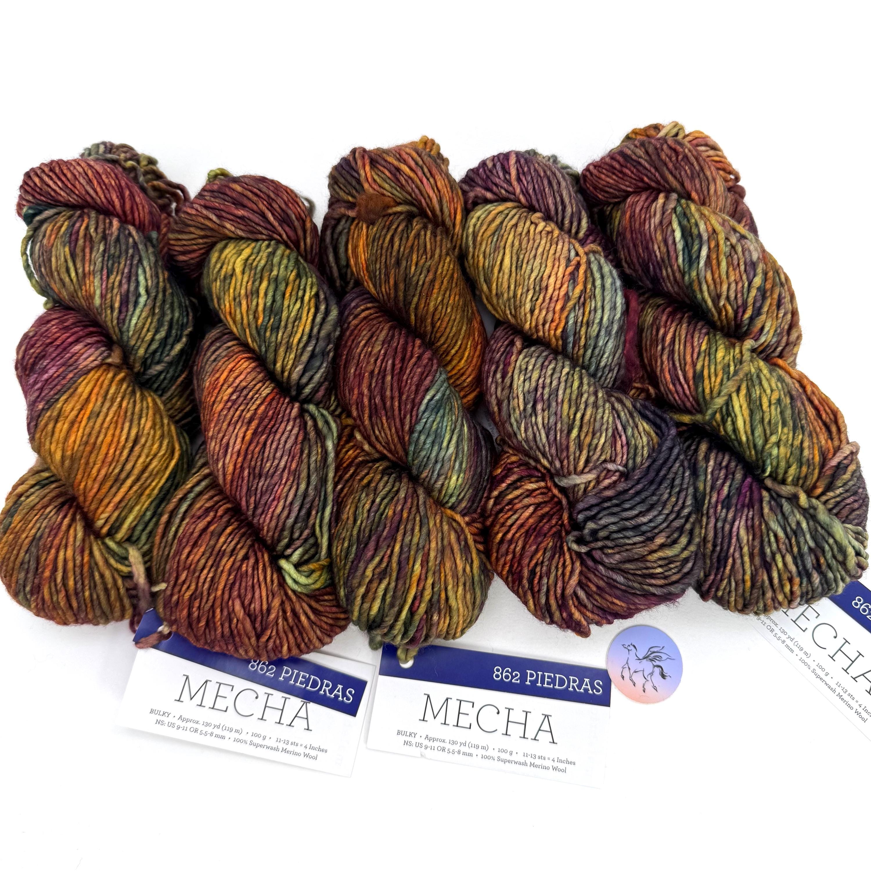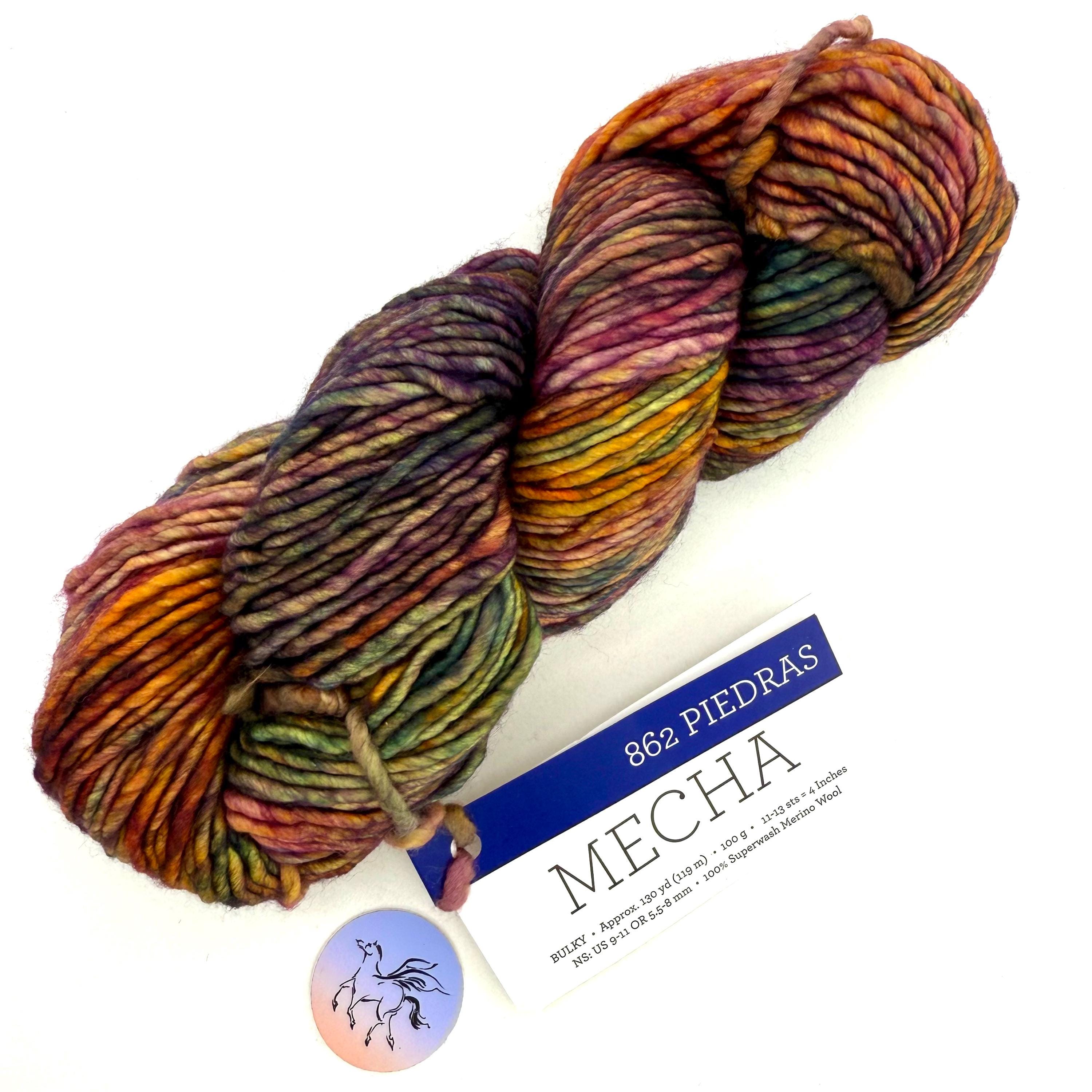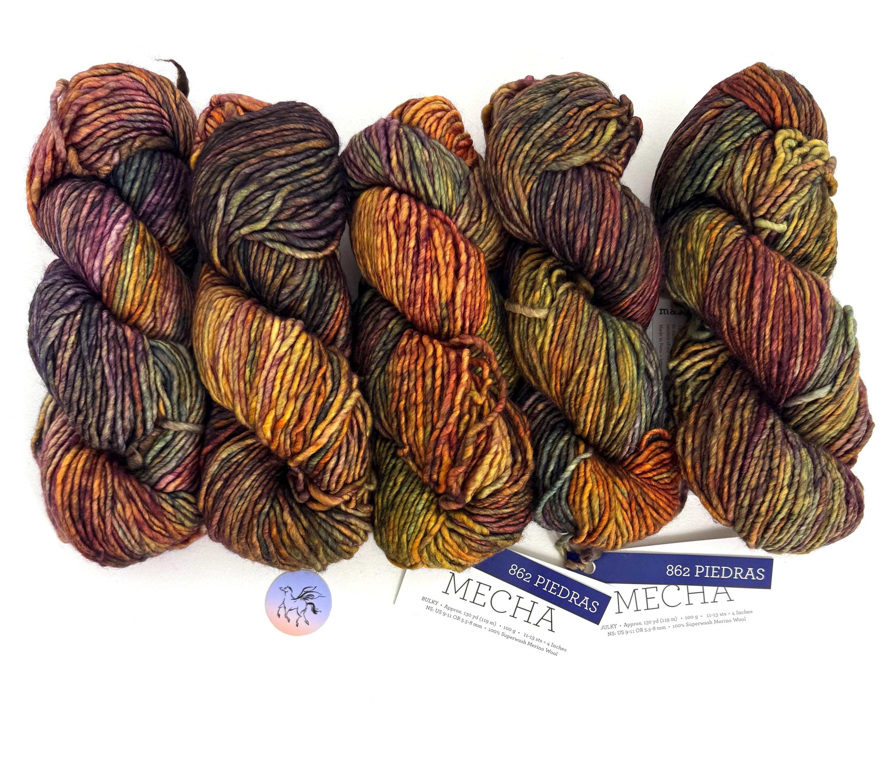 Mecha Merino Wool is a slighty thick-and-thin yarn, with a lovely loft, and is the perfect choice for quick but not-too-heavy projects. A superwash yarn in single-ply is a rare find especially with such vivid, rich colors and tones. Superwash means you can wash your garments in cold water, gently, and your items will not shrink or felt. Gorgeous kettle dyed yarn for knitting and crochet. This listing has all skeins from the same batch, color #862 Piedras, Mecha yarn. Piedras does not have a dye lot. Malabrigo creates each bag of 10 in one batch. Be sure to buy enough for your project.