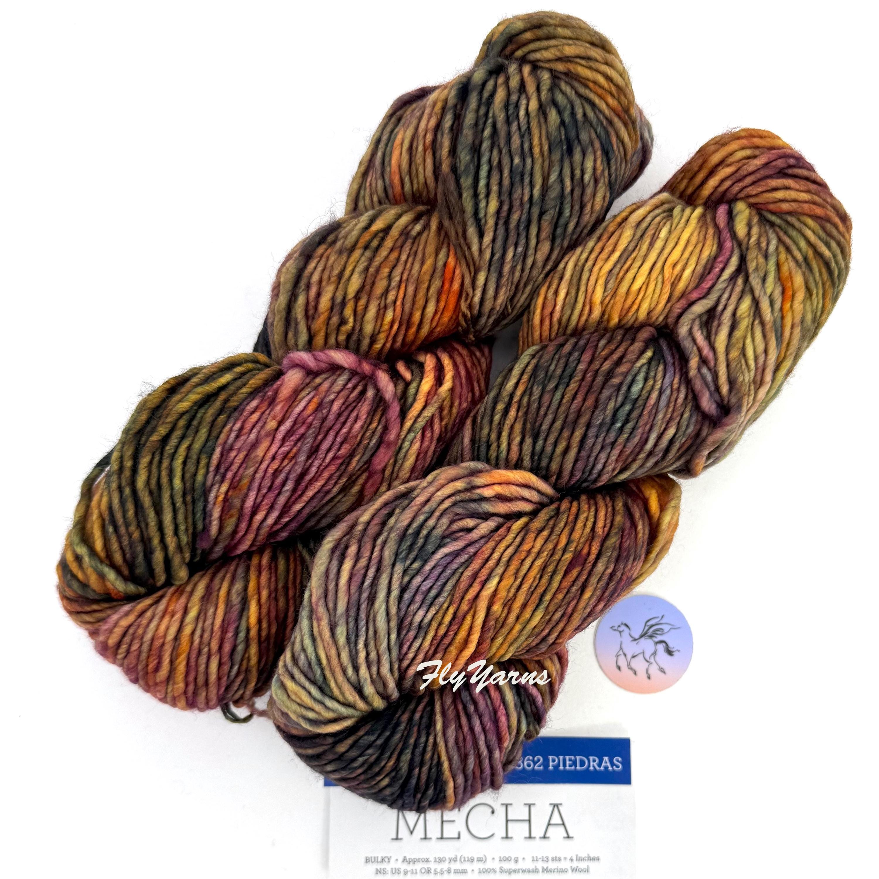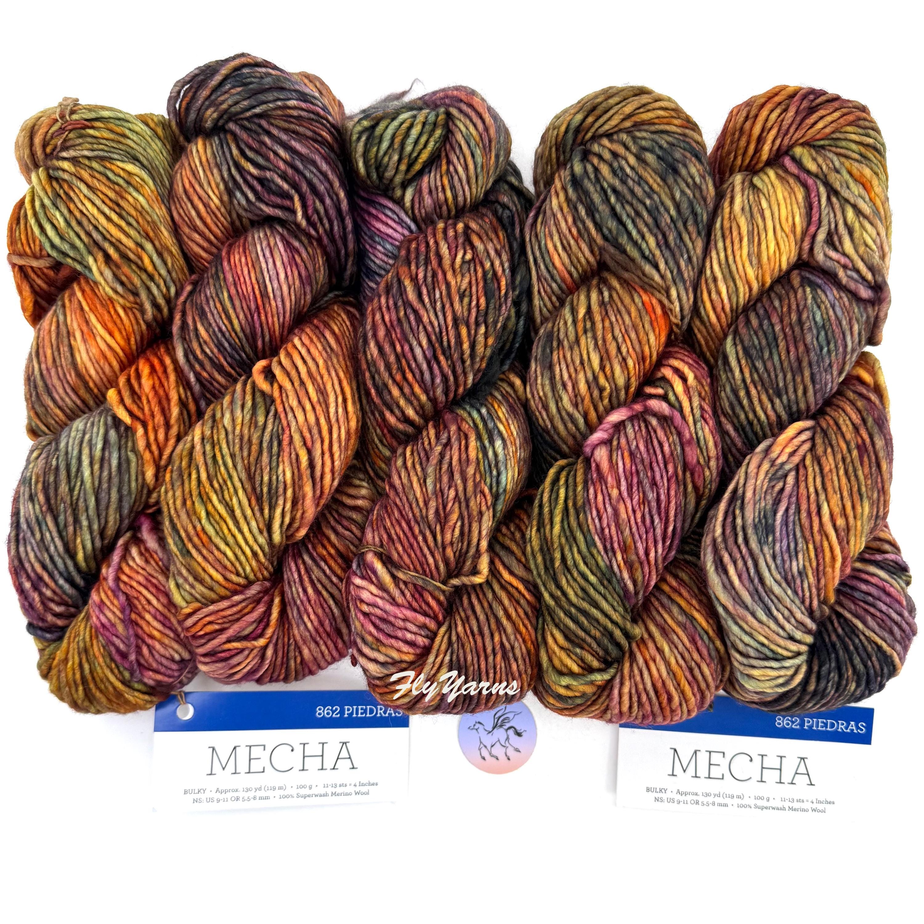 Mecha Merino Wool is a slighty thick-and-thin yarn, with a lovely loft, and is the perfect choice for quick but not-too-heavy projects. A superwash yarn in single-ply is a rare find especially with such vivid, rich colors and tones. Superwash means you can wash your garments in cold water, gently, and your items will not shrink or felt. Gorgeous kettle dyed yarn for knitting and crochet. This listing has all skeins from the same batch, color #862 Piedras, Mecha yarn. Piedras does not have a dye lot. Malabrigo creates each bag of 10 in one batch. Be sure to buy enough for your project.