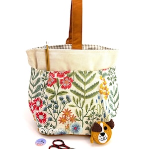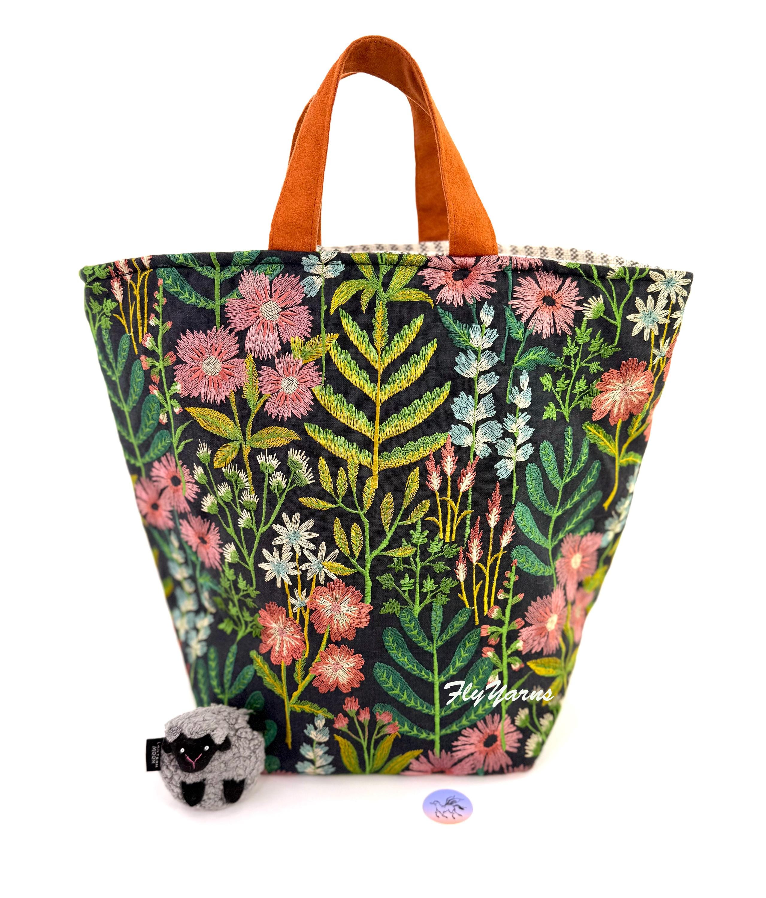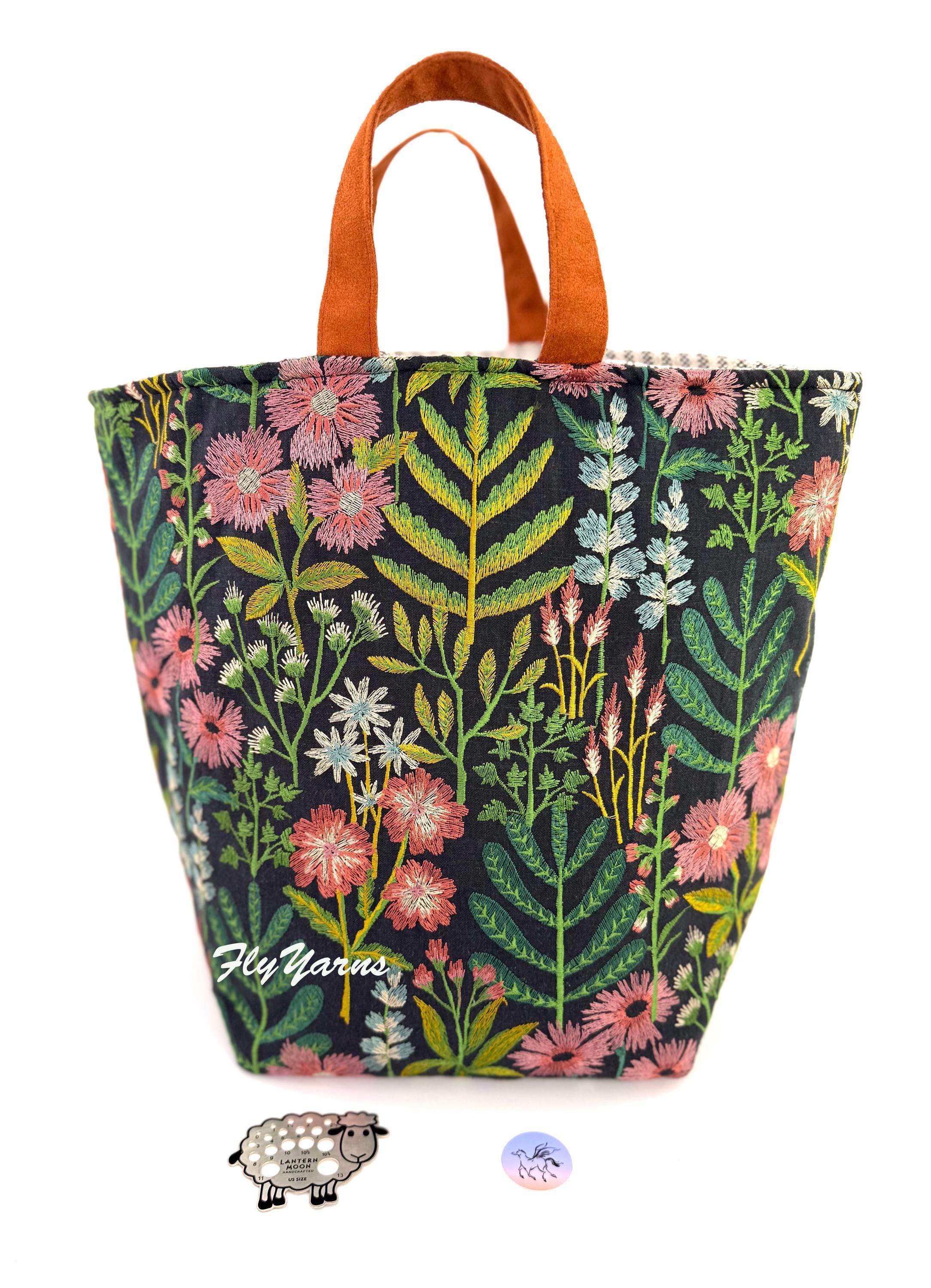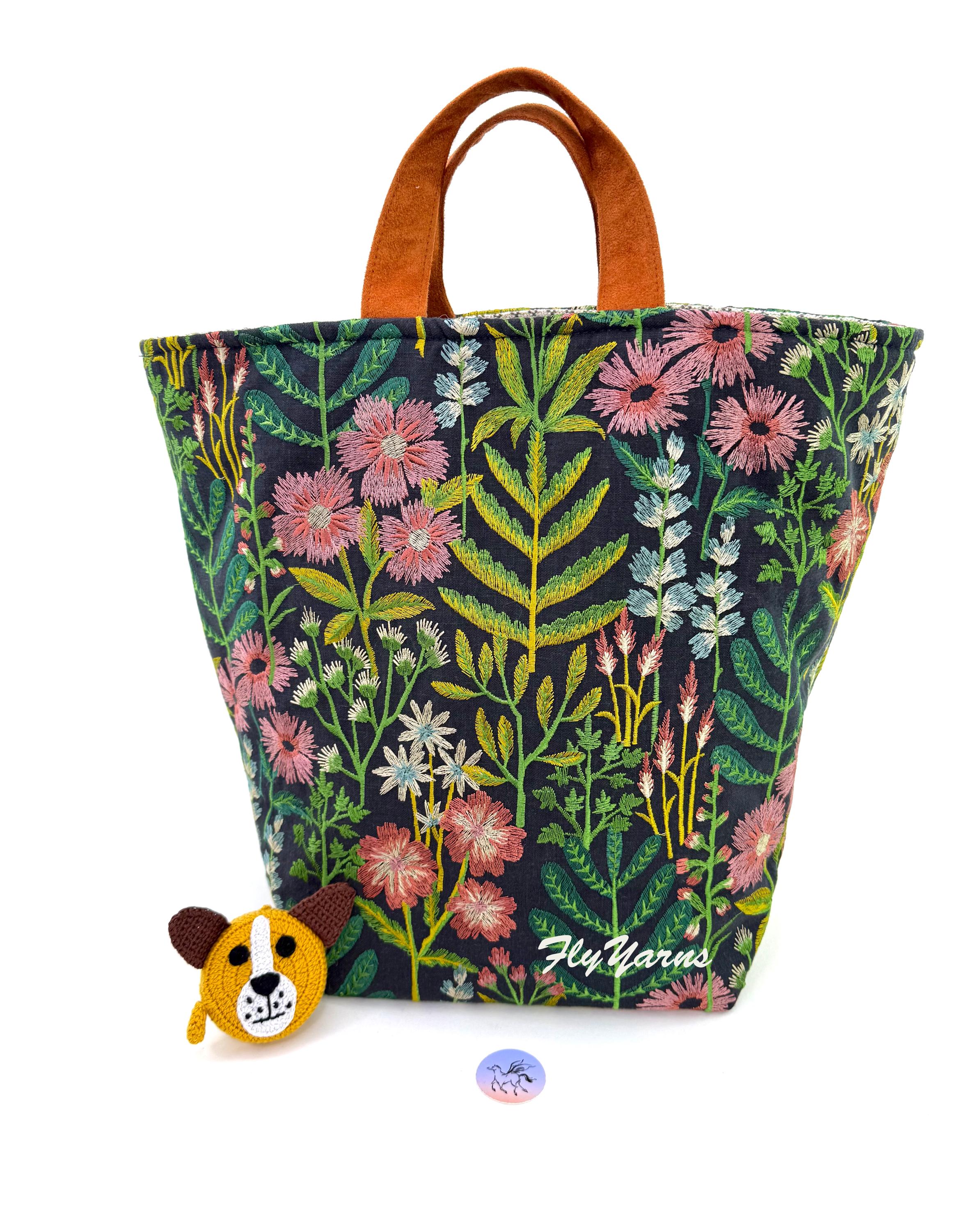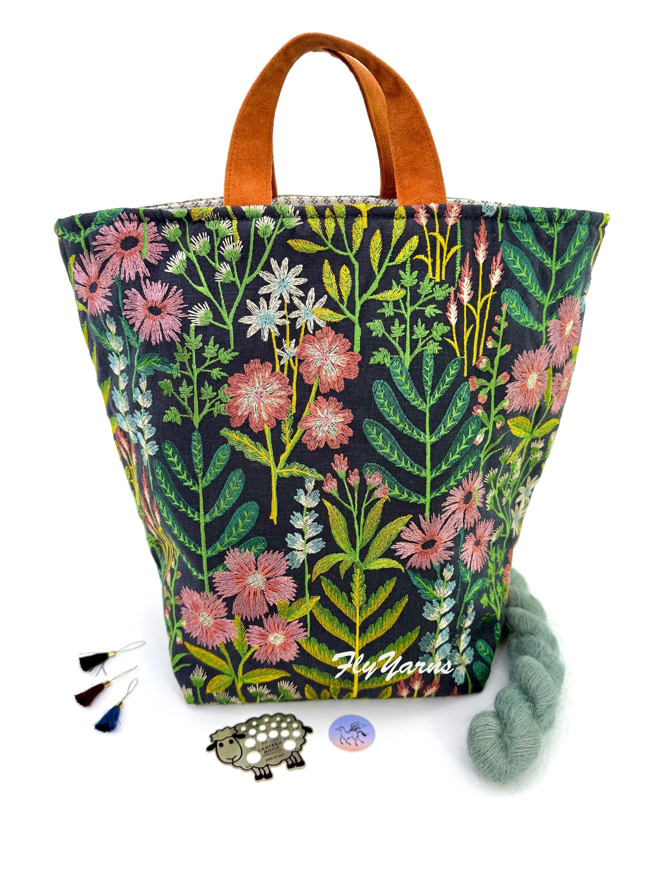 Atenti Hope Basket Meadow is made of an exquistly embroidered floral fabric that is a roomy stand-alone project bag. The top rolls down for easy access with a wide opening and two handles. Fully lined in tan water repellent taffeta. Inside are slotted 5 pockets to hold needles, phone and notions. Makes an excellent crafter's gift or Birthday Gift.