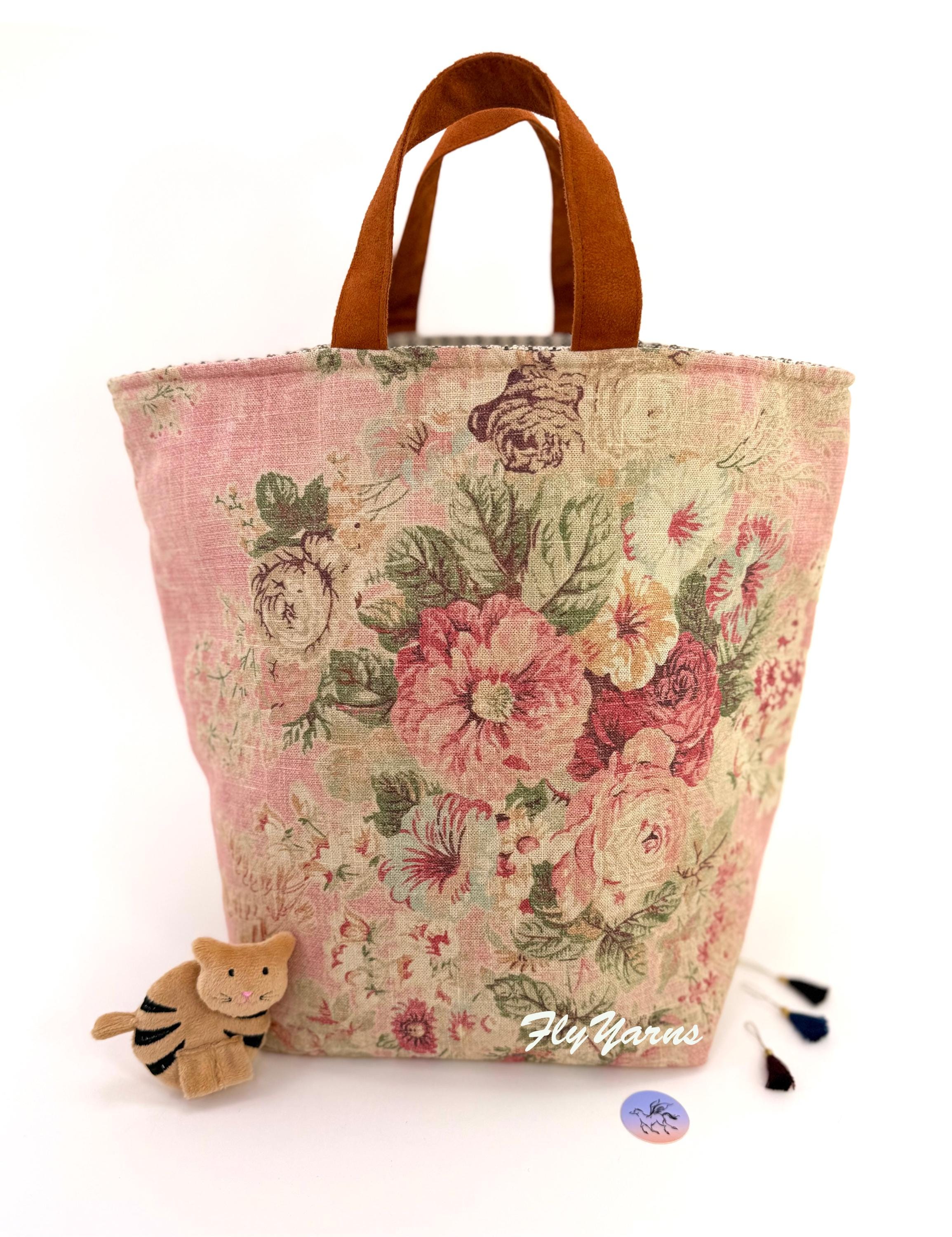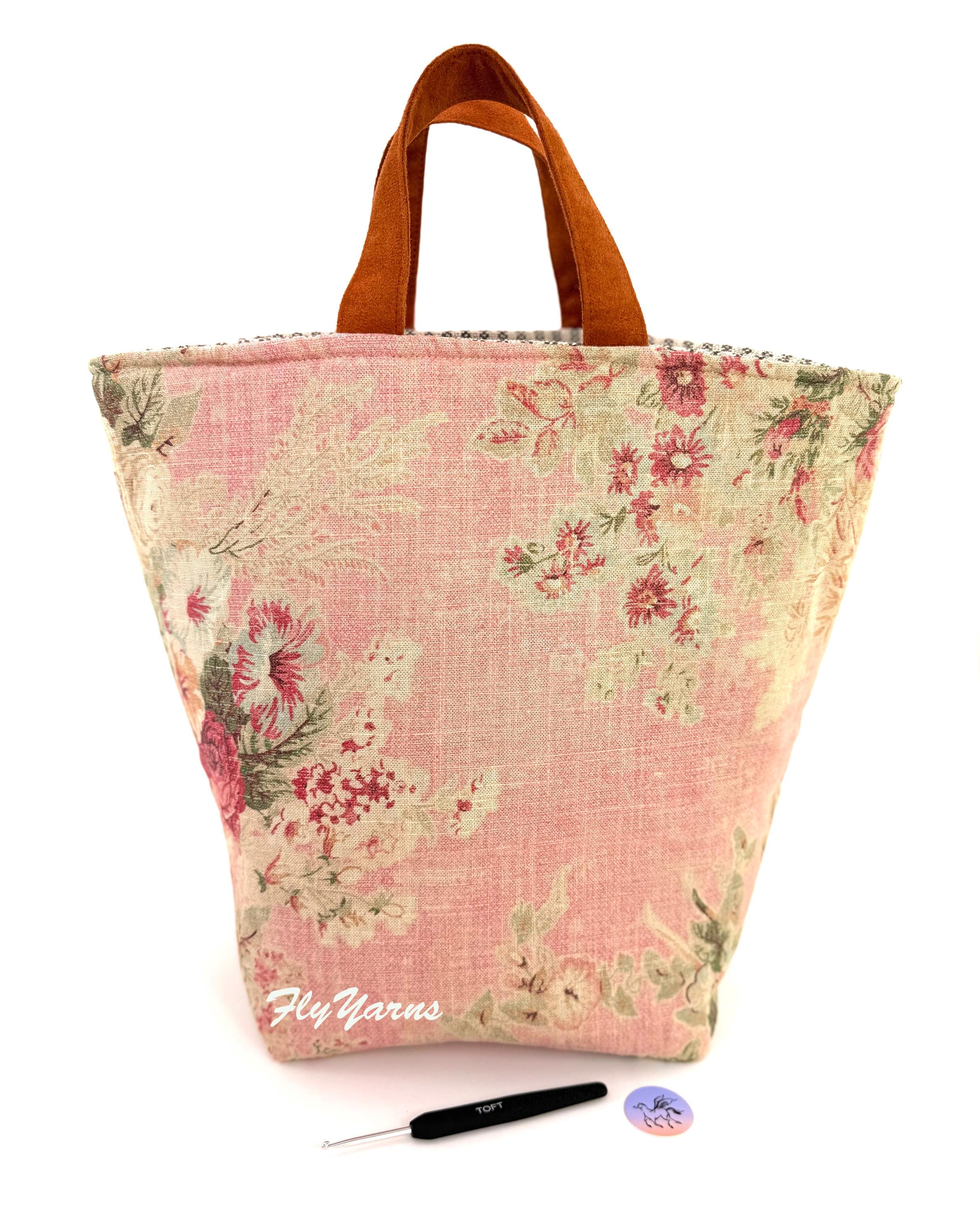 The Rosewood Hope Basket, showcasing a stunning assortment of delicate florals in warm tones, pairing with a classic stripe inside edge. The interior of the basket is fully lined in tan water repellent taffeta with five inside pockets! This spacious pale pink floral fabric basket holds over 6 hanks of super bulky yarn and has two sienna Ultra-Suede short handles.
