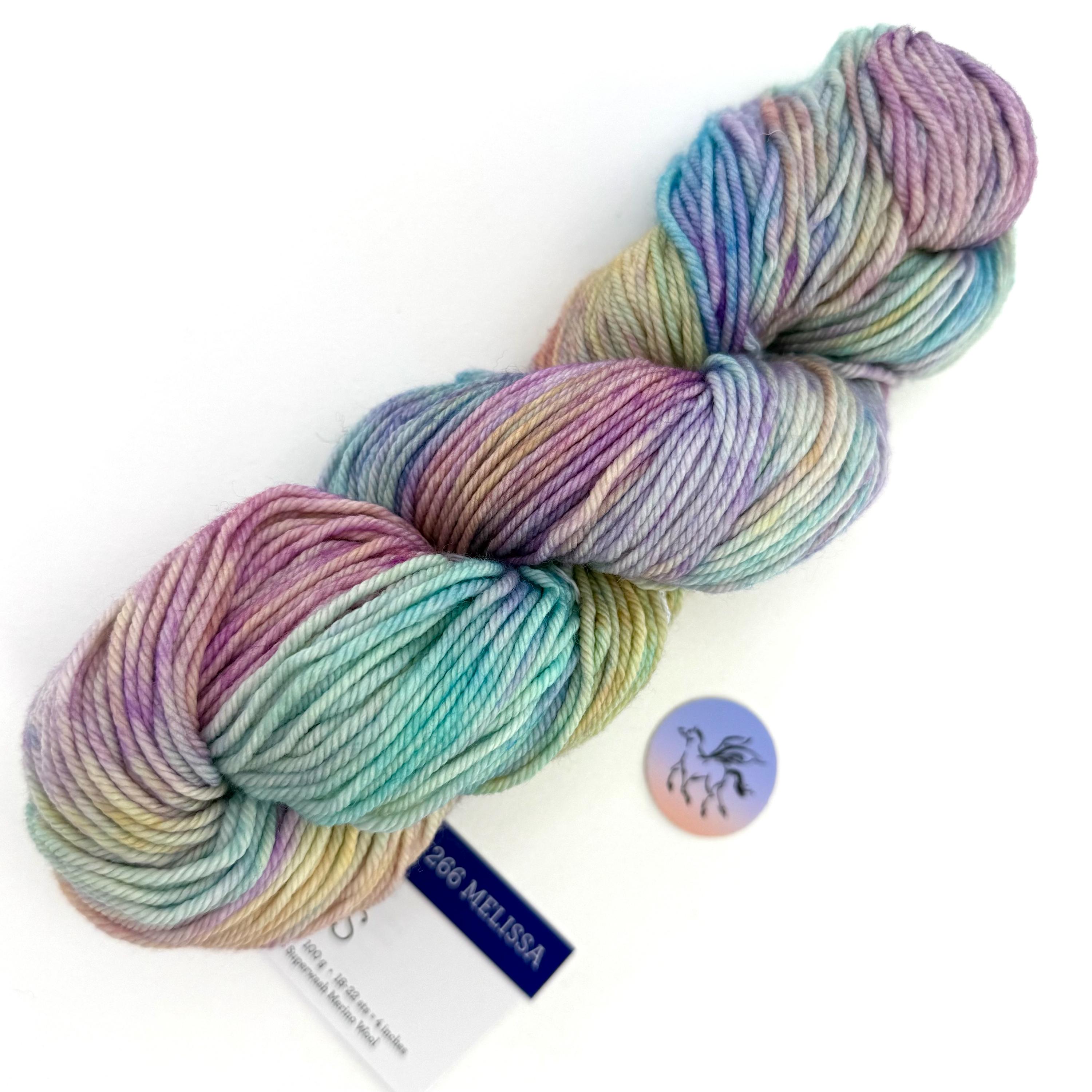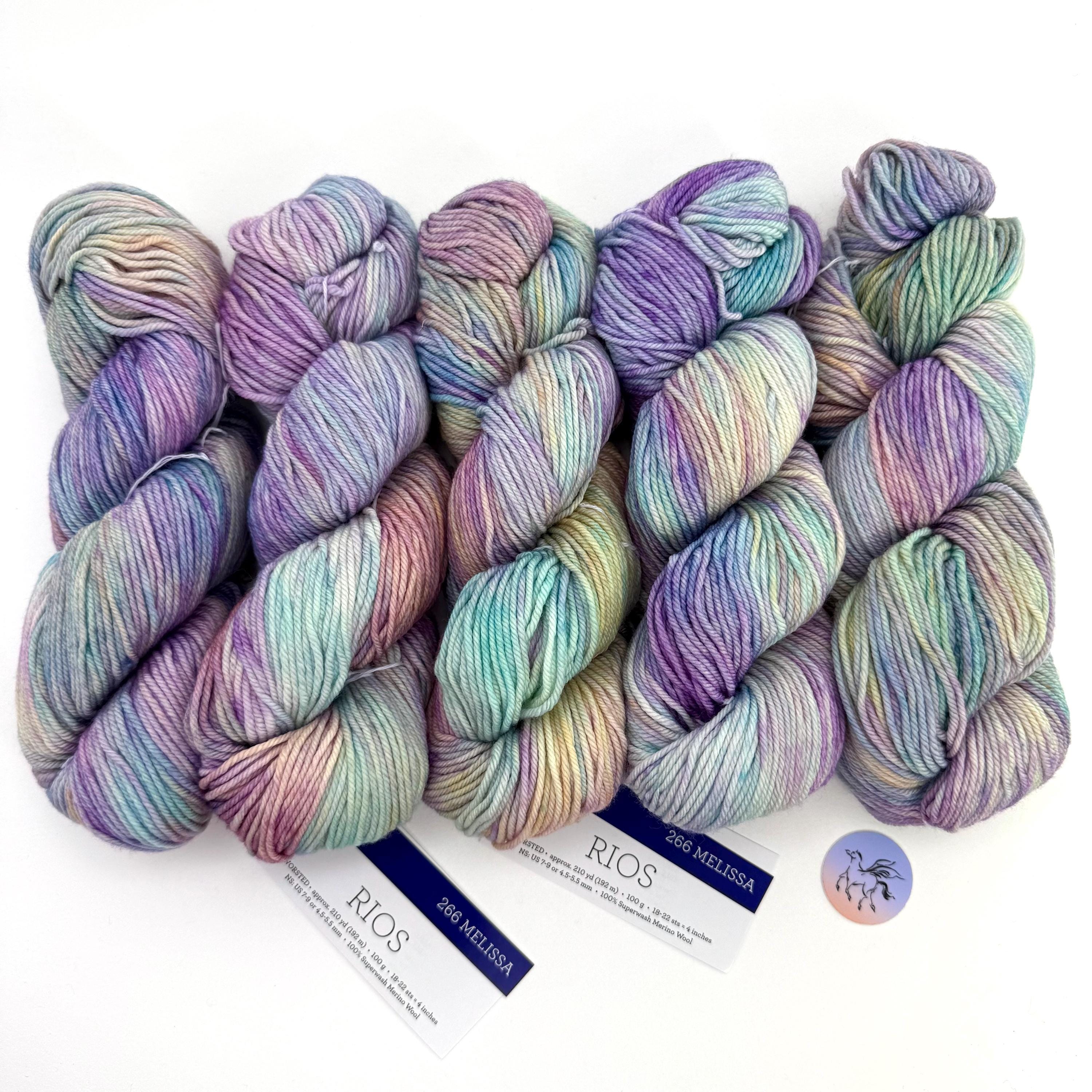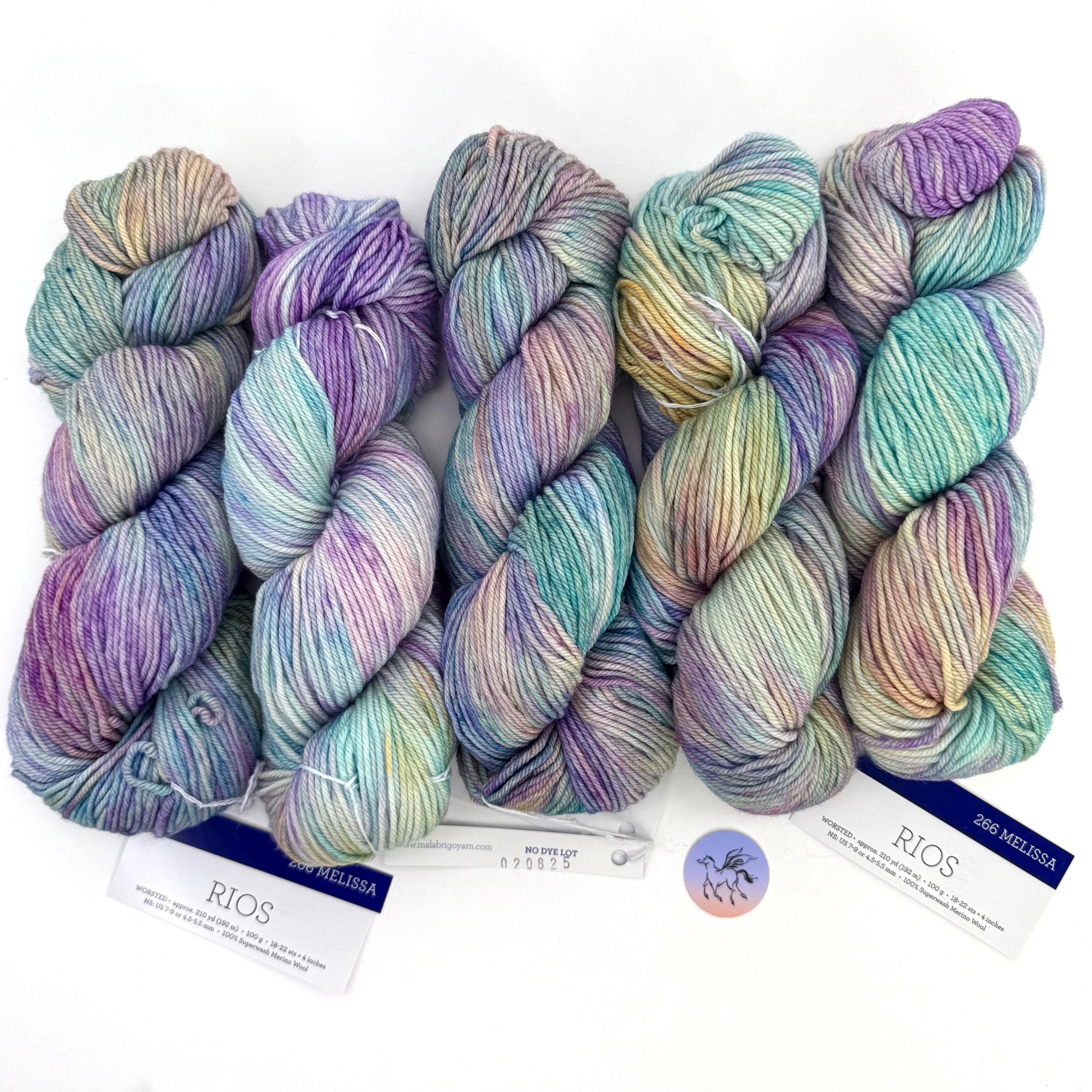 Malabrigo Rios Yarn is plied 100% pure Merino Superwash wool which is hand-dyed. This listing for the color Melissa 288 is a mulit-colored, worsted weight yarn, 10 ply wool. Malabrigo creates 10 hanks in a dye lot.. A gorgeous hand-dyed Merino wool in a turquoise, rose and lavender is Malabrigo's unique Pisces. Priced per hank.
