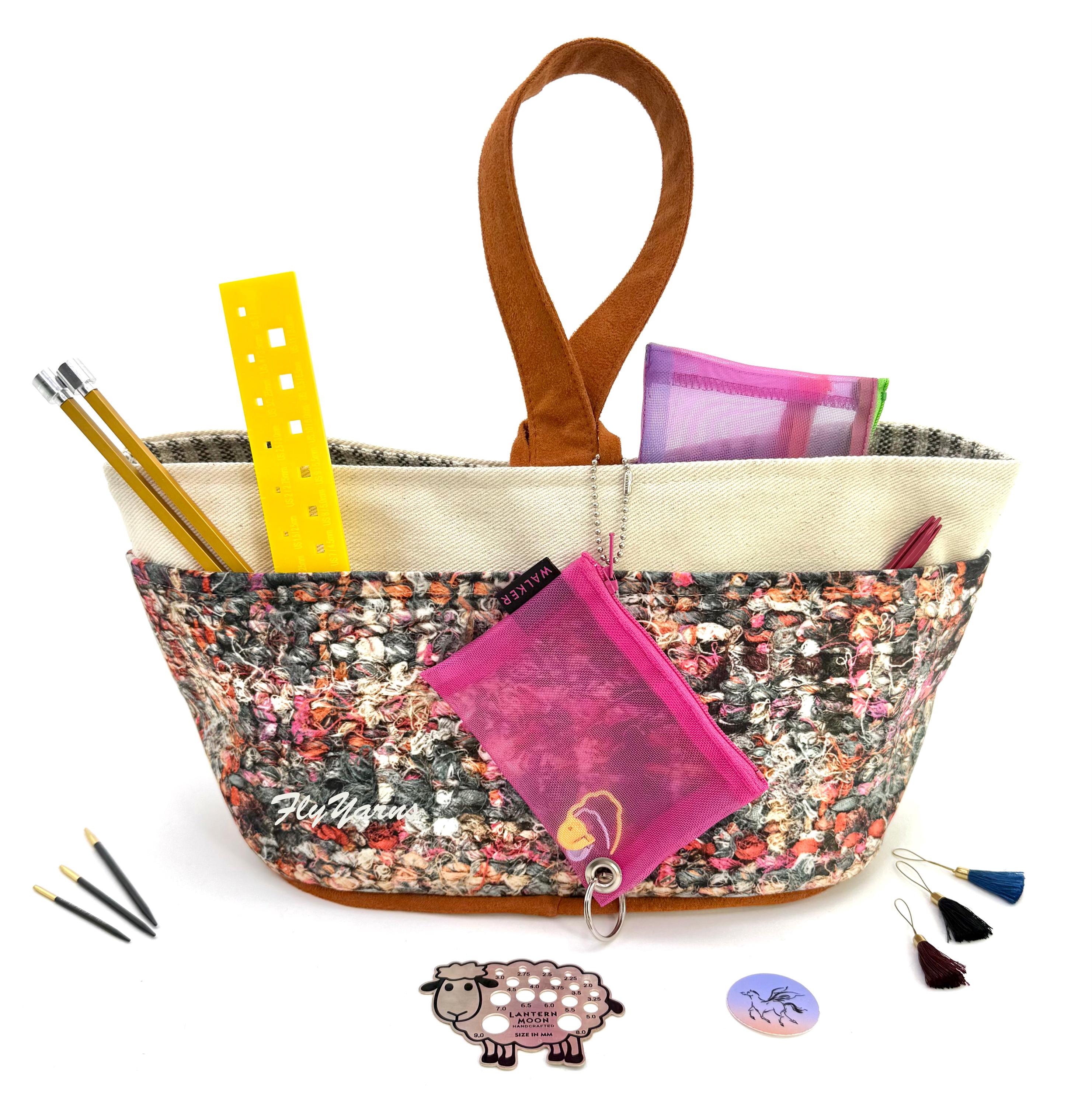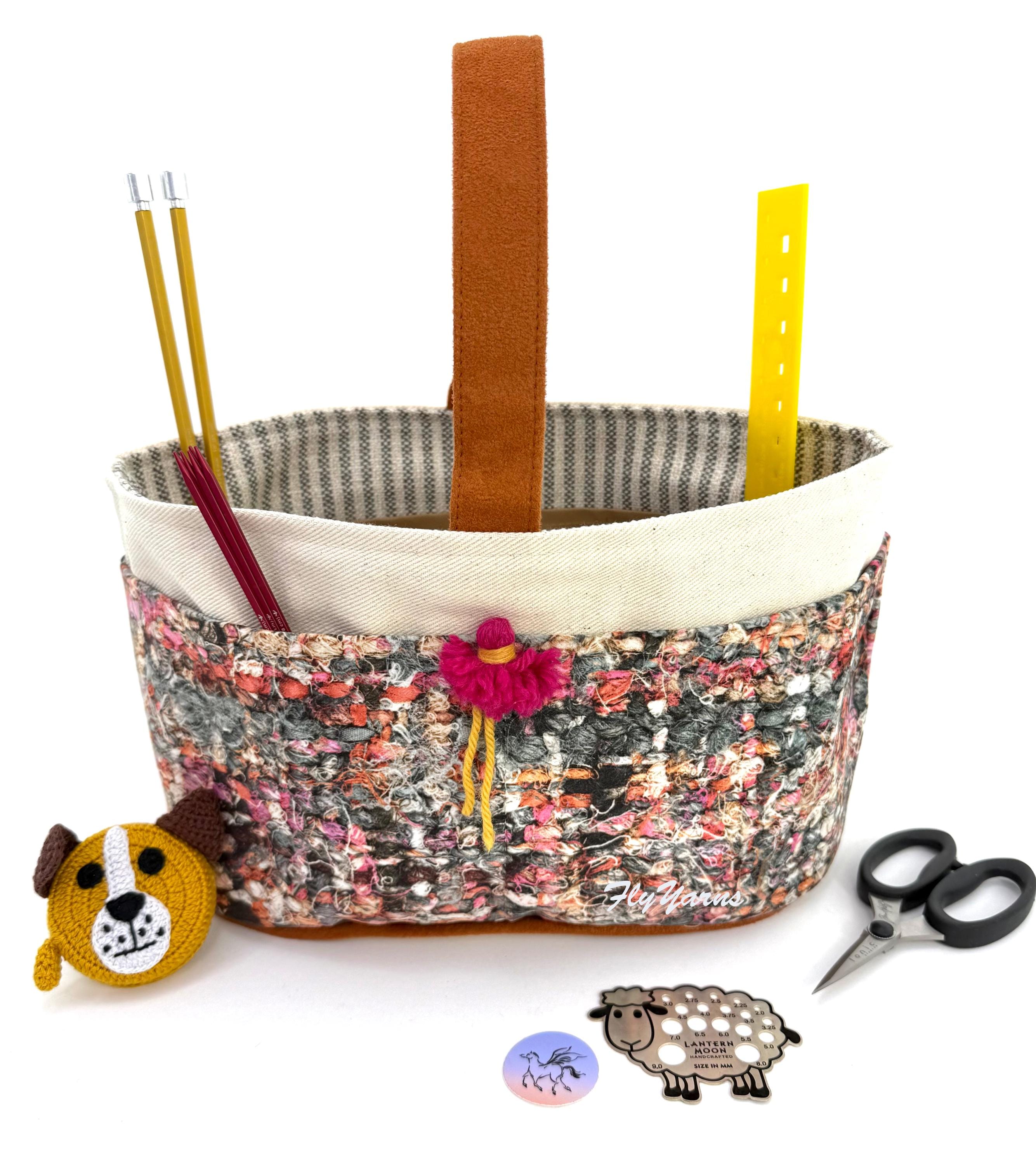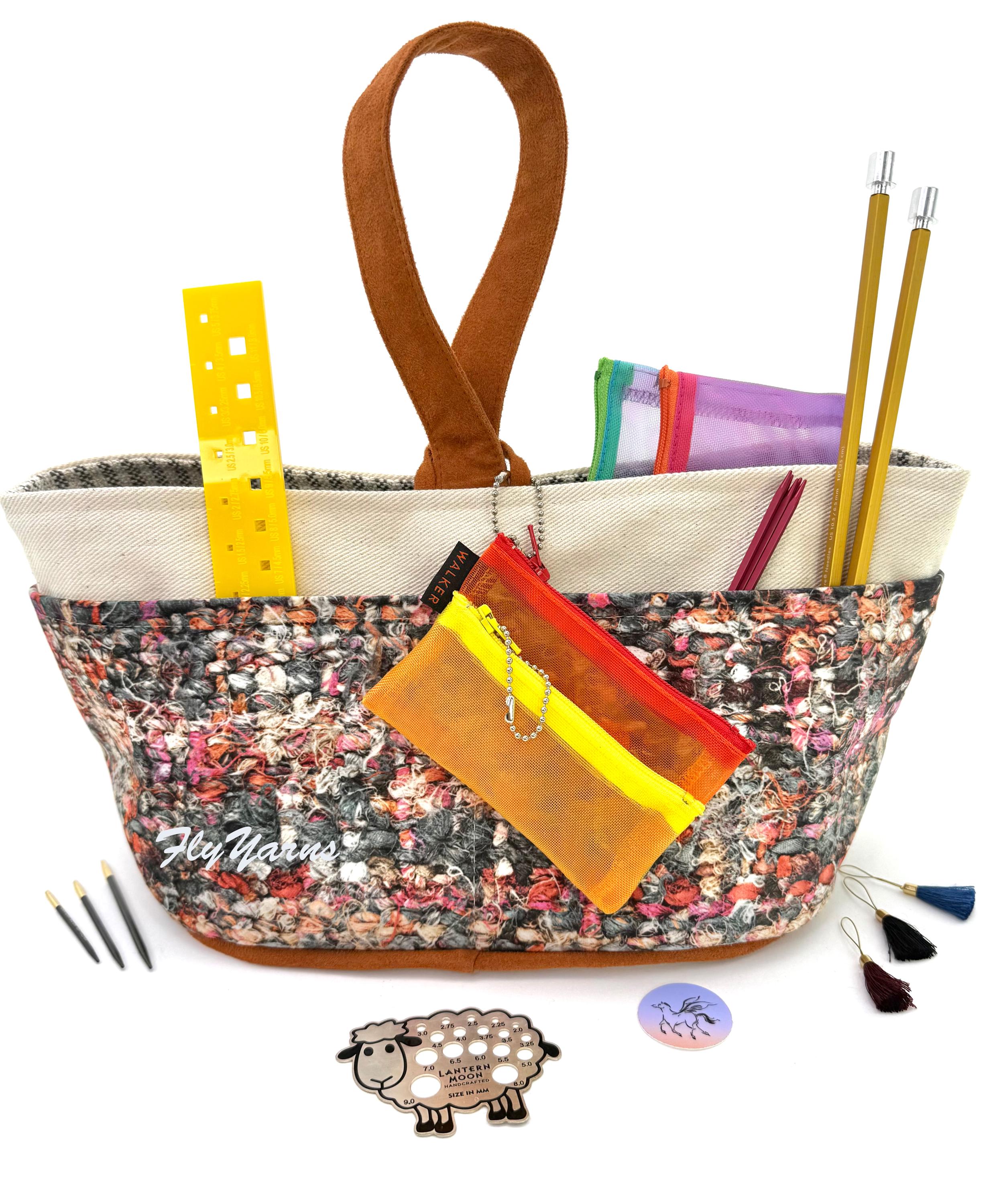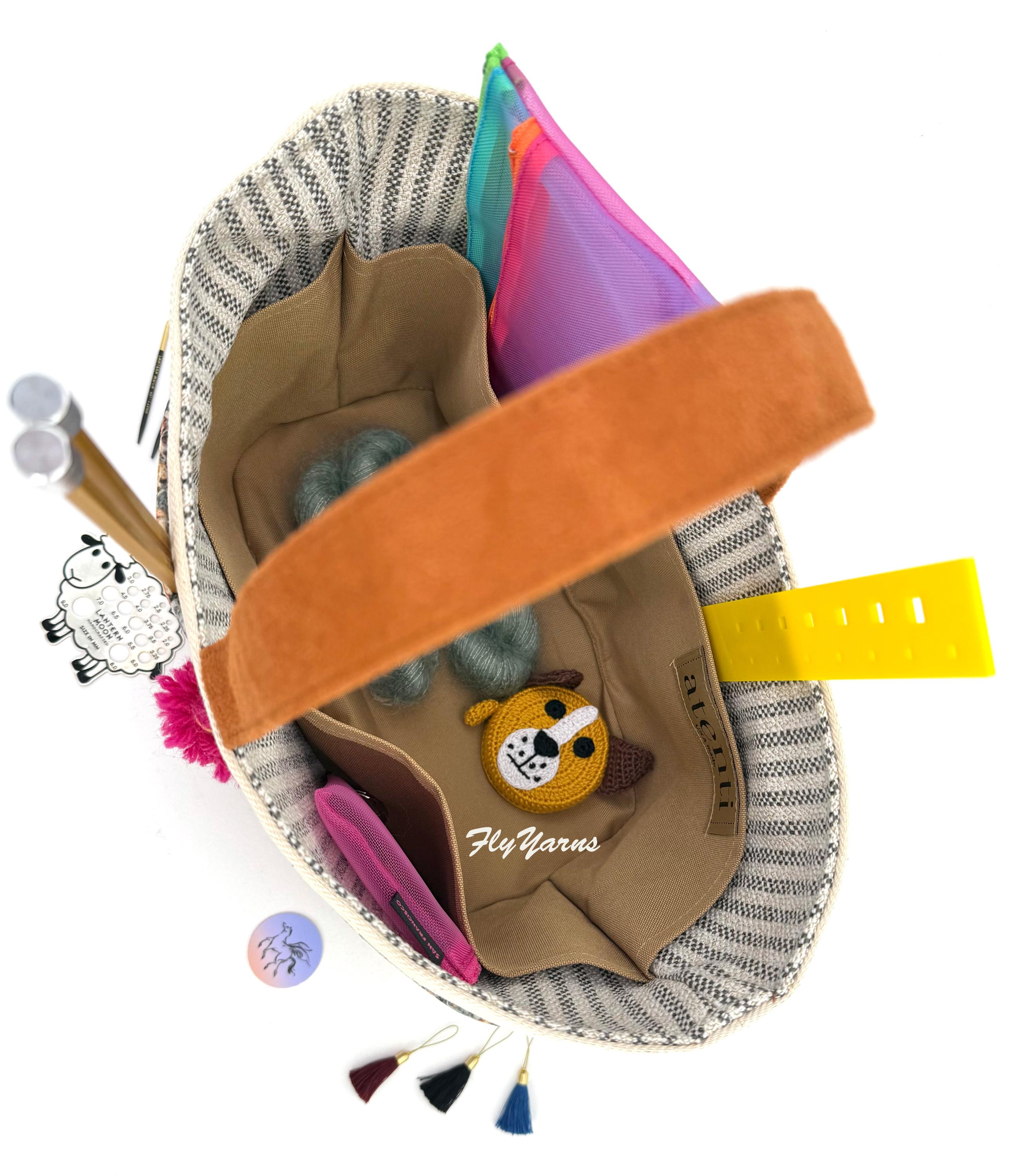 Atenti Knitzy Hope Basket is made of an unusual fabric - a multi-color knit print on ultra soft velvet. Vibrant and fun this bag will make you stand out in all the best ways! This bag exudes sophistication and softness. The Knitzy has four outside pockets, a Sienna vegan Ultra Suede handle over top and is fully lined in water resistant taffeta with four inside pockets. Designed for multiple yarn projects, beading, and crafting it has an ample center well edged in striped ticking. This bag best fits a hat, sock, or baby clothes project. For a larger project check out the matching Hope Basket-see the link below. Keep your tools together and always be ready for a crafting break 🌴
