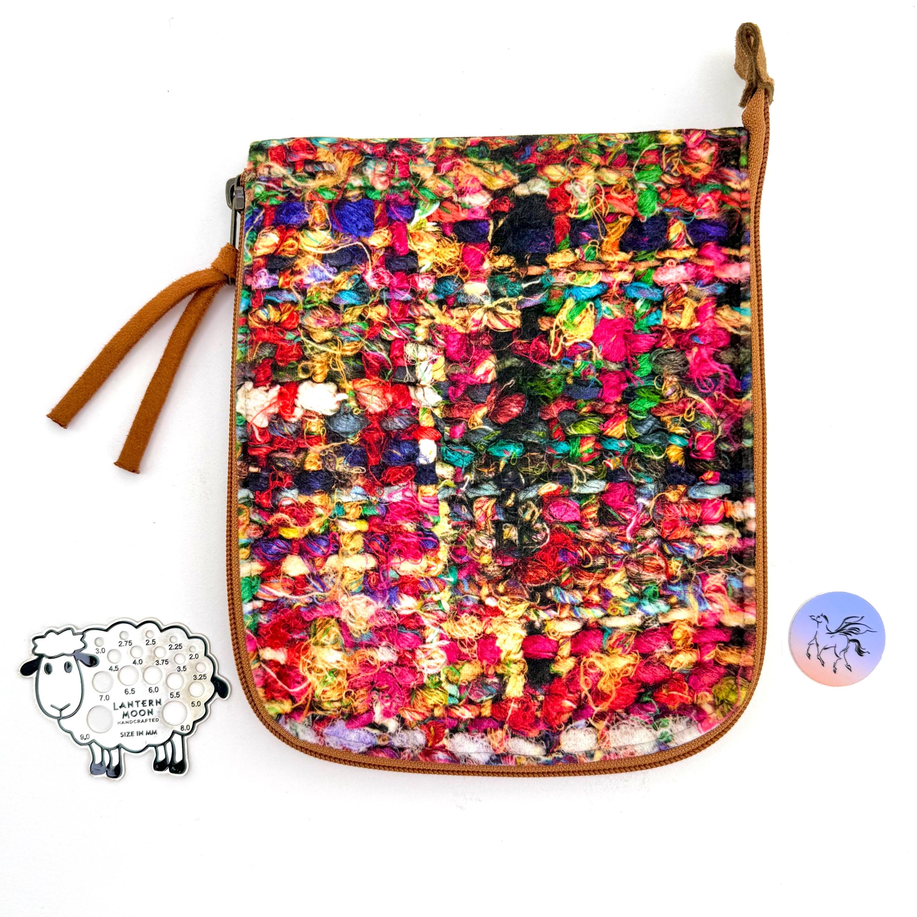 Atenti Circular Needle Case in a multi-color tapestry print on ultra soft velvet- in a bright color way! A practical organizer and storage for your circular needles in distinctive Atenti fabrics. An all around zipper closure protects an interchangeable plastic booklet insert with 12 clear pockets. Case has one large inside fabric pocket for notions. Additional insert booklets available, see below. Don't let the image fool you! The basket is made of a soft smooth velveteen fabric which has a print of a funky bulky weaving.