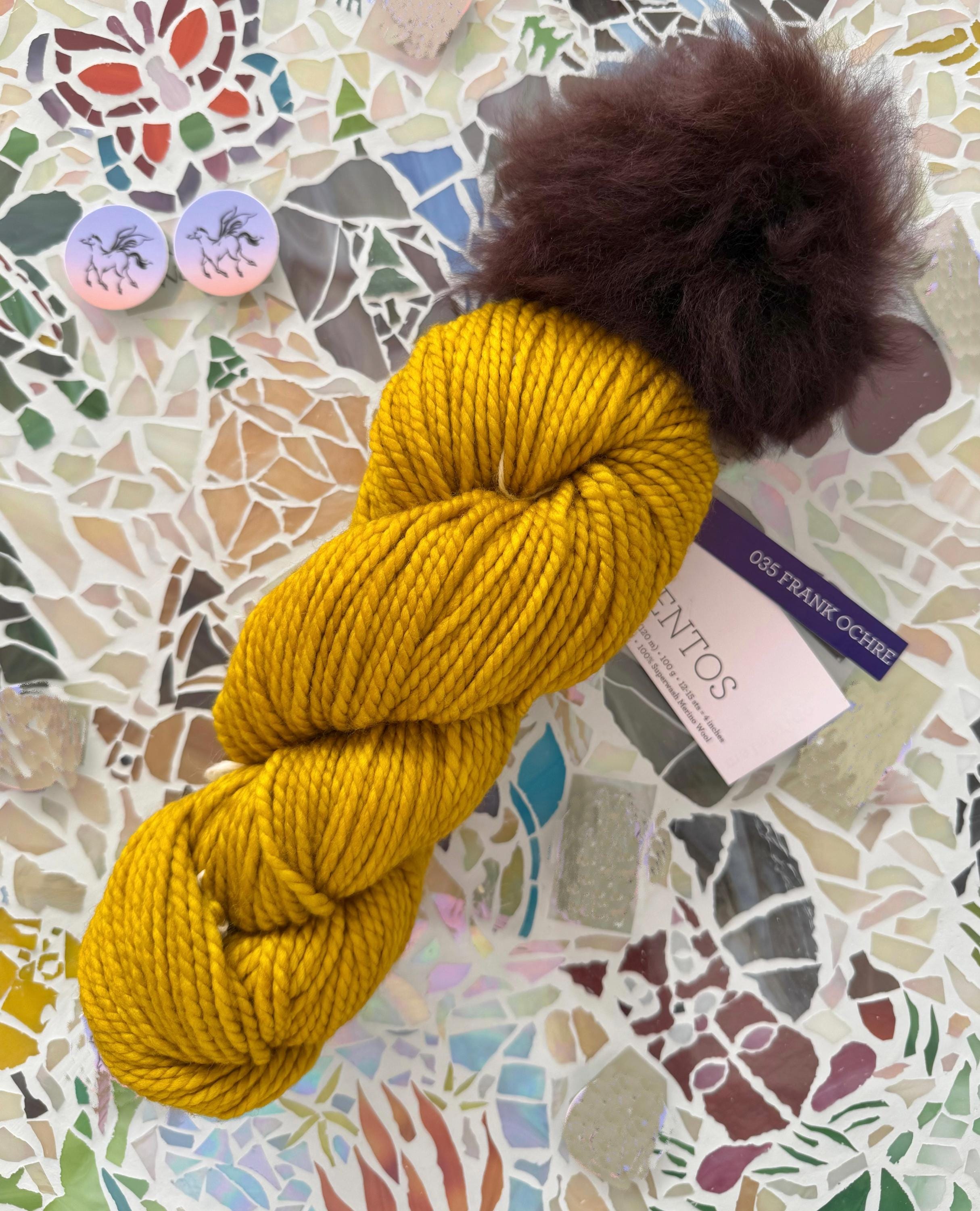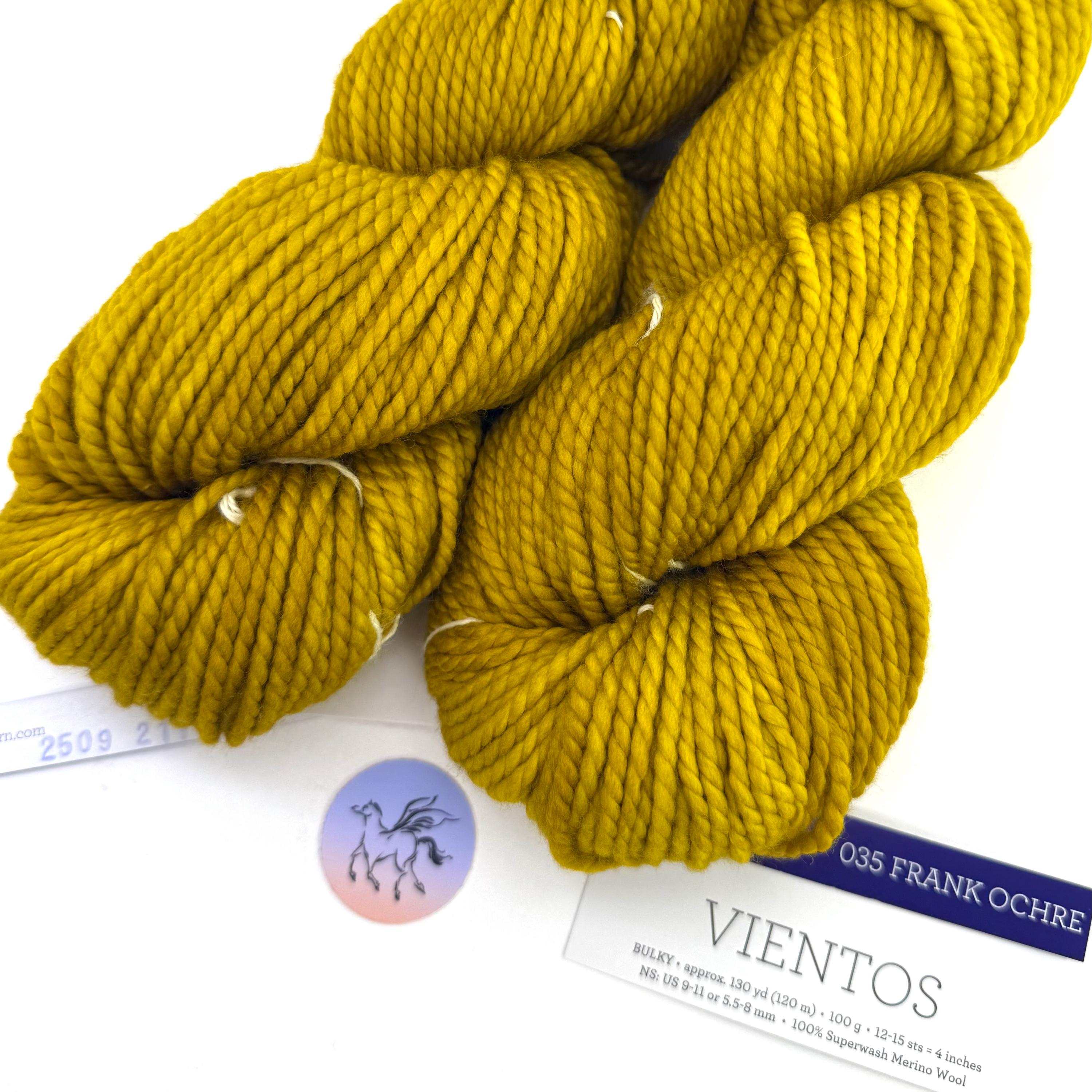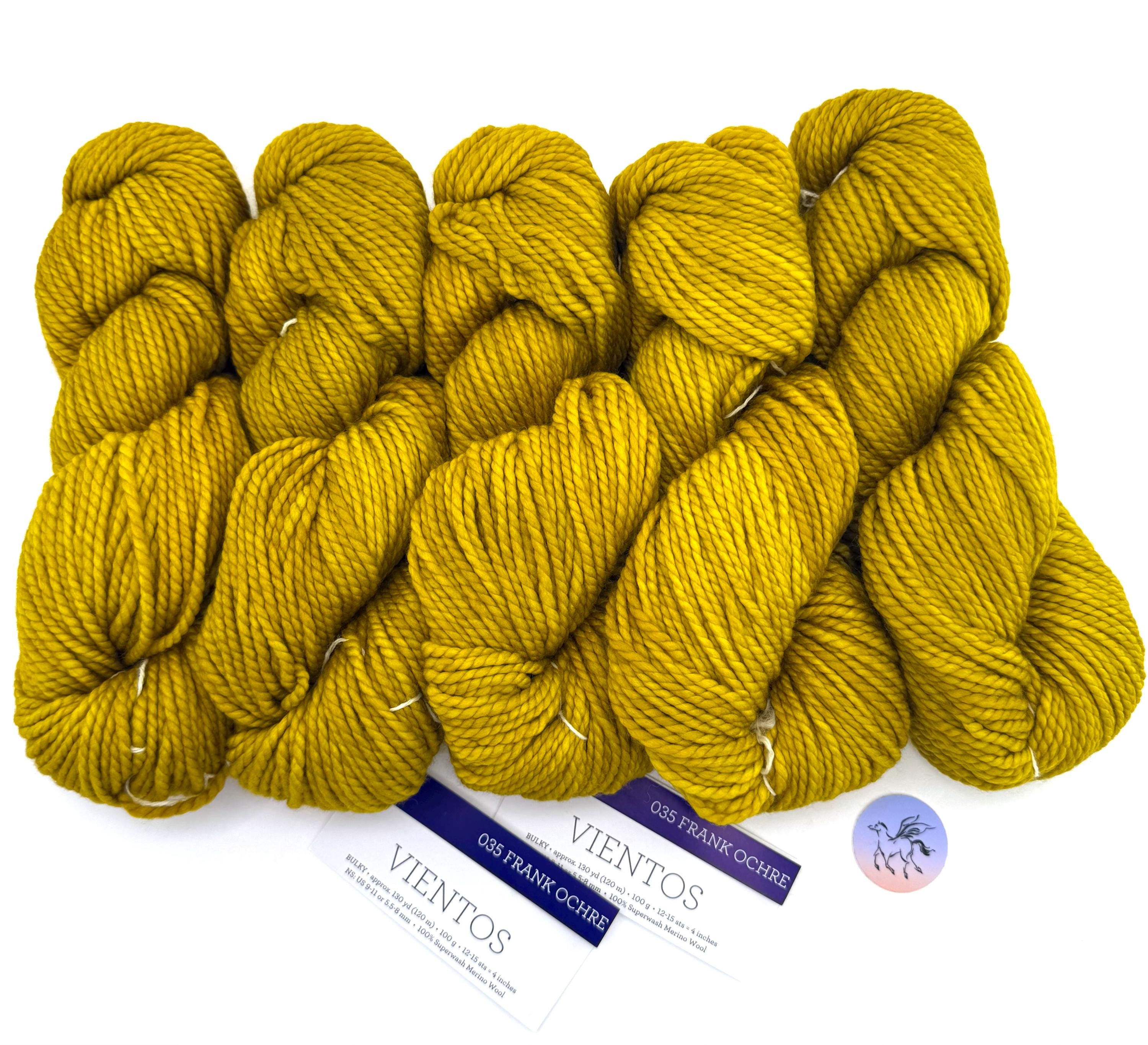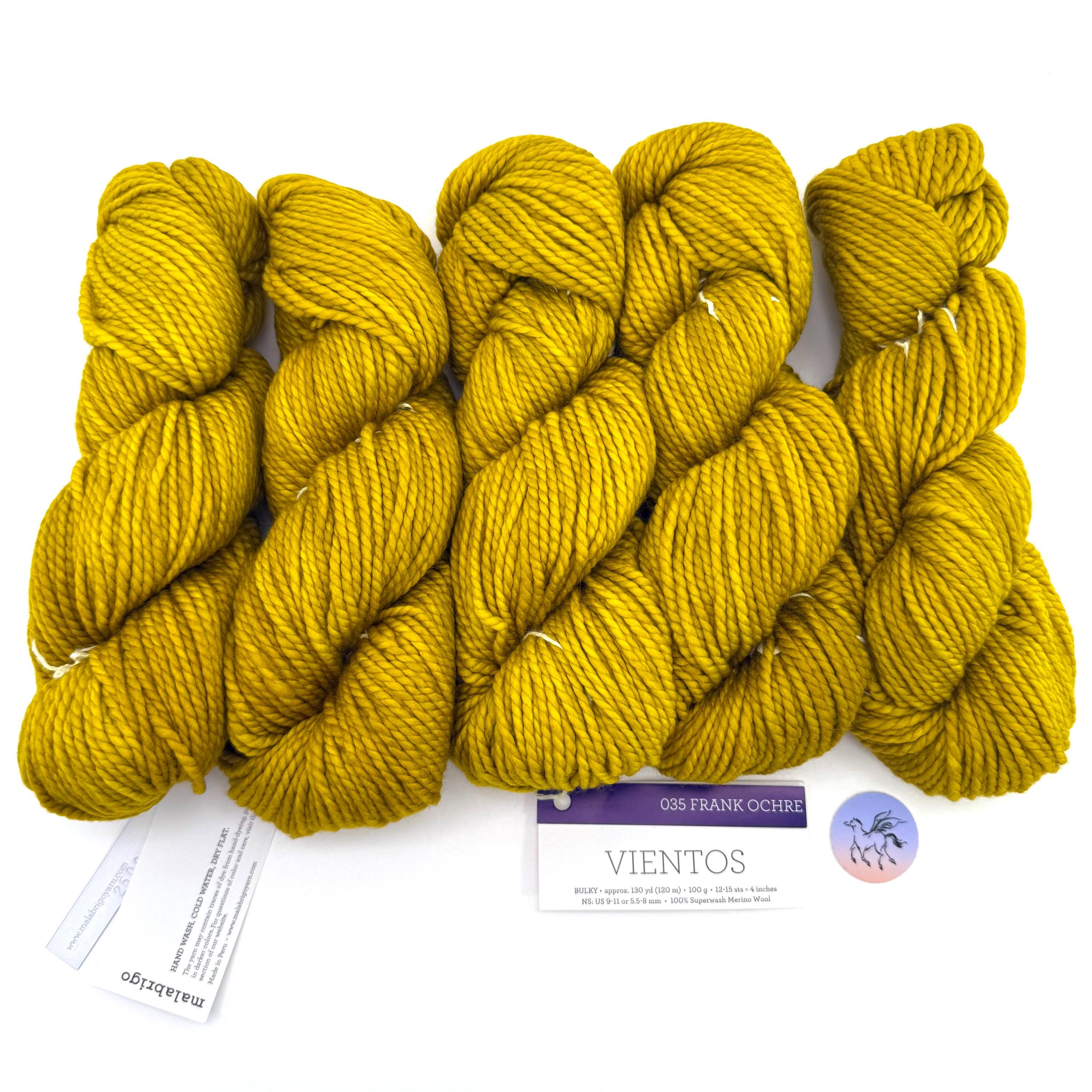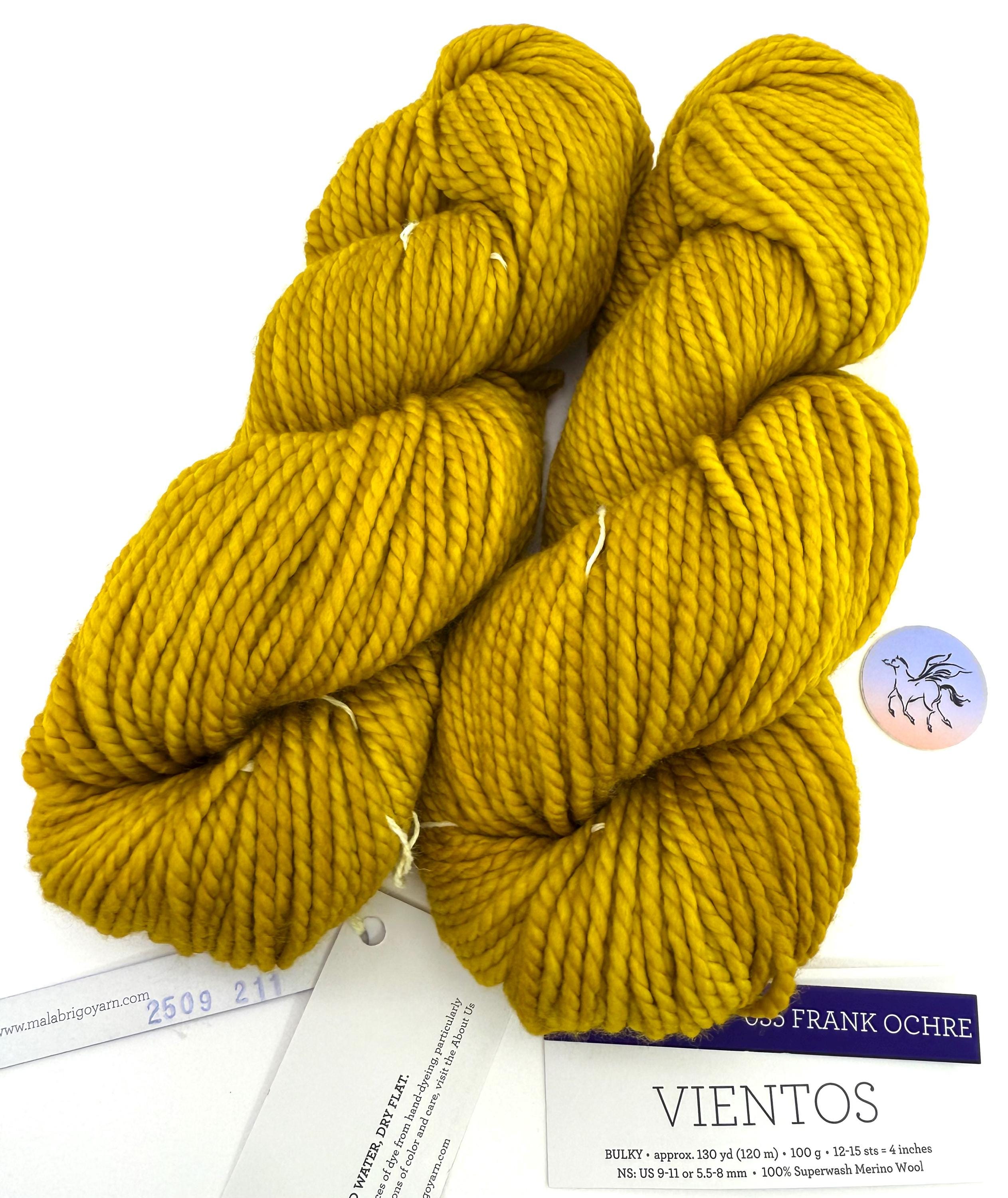 Malabrigo Vientos in kettle dyed color way, Frank Ochre, is made of 100% Superwash Merino wool. A bulky, two-ply yarn that’s incredibly soft! Vientos is a super wash merino yarn known for its exceptional softness and rich, saturated color. Its two-ply construction offers more durability and structure than single-ply yarns, while still maintaining a lofty, cozy feel. It’s the perfect choice for warm, quick-to-knit projects that won’t feel too heavy.