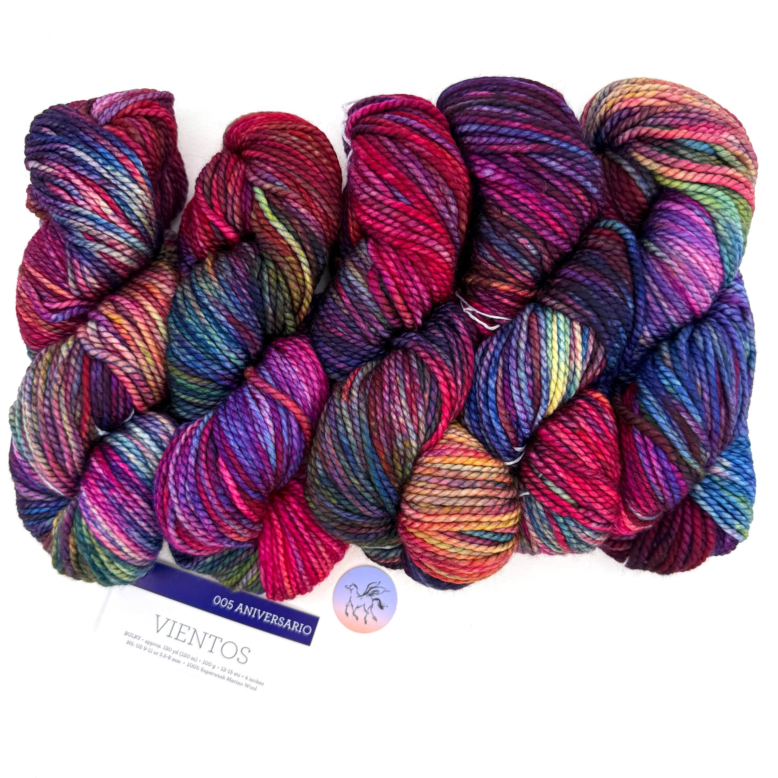 Malabrigo Vientos in kettle dyed color way, , is made of 100% Superwash Merino wool. A bulky, two-ply yarn that’s incredibly soft! Vientos is a super wash merino yarn known for its exceptional softness and rich, saturated color. Its two-ply construction offers more durability and structure than single-ply yarns, while still maintaining a lofty, cozy feel. It’s the perfect choice for warm, quick-to-knit projects that won’t feel too heavy.