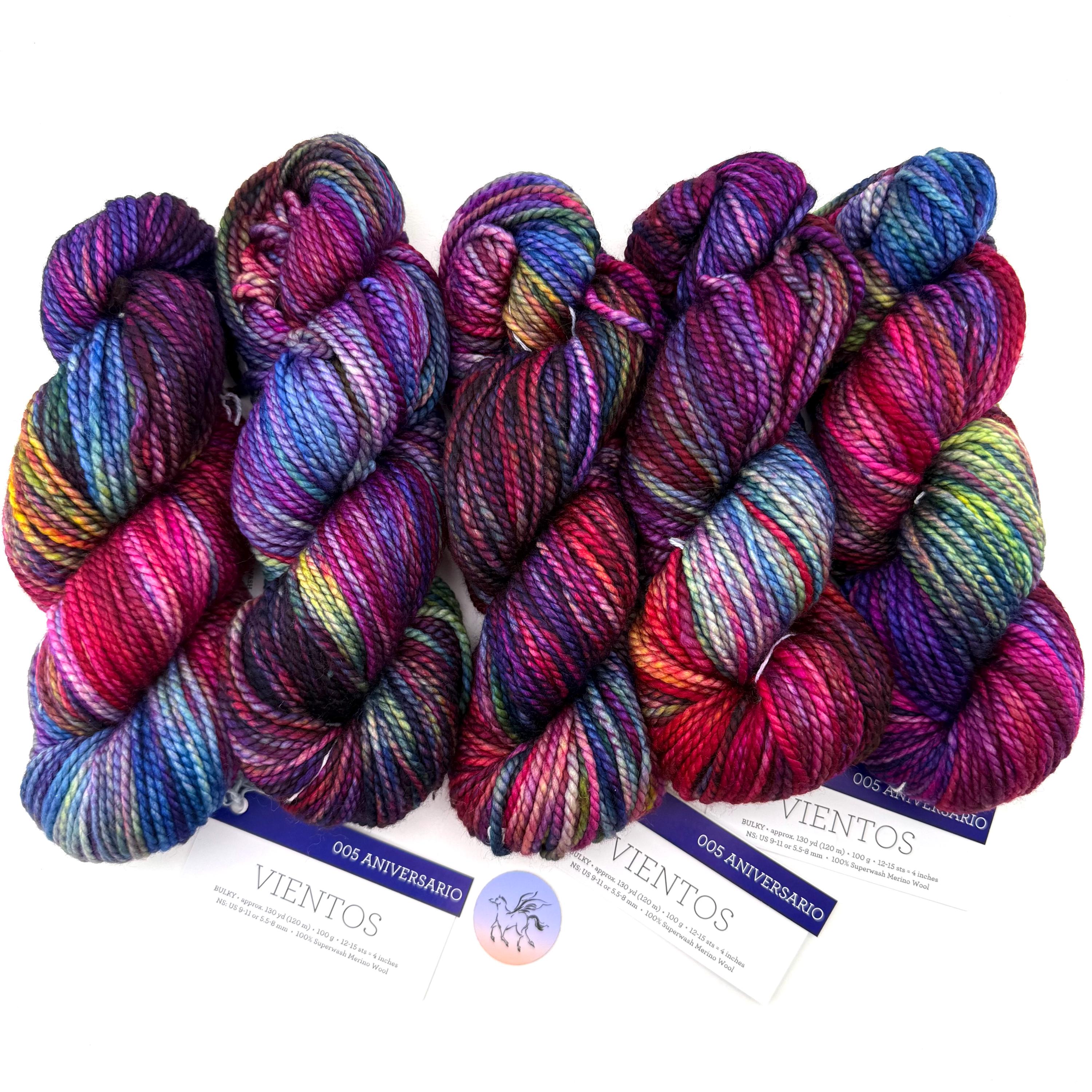 This listing of Aniversario has 10 hanks all from the same batch. Be sure to get enough yarn to complete your project since each bag is a different dye lot. Hanks may vary from one another even within the same bag. To ensure random color distribution, work from two balls of yarn at once, alternating a few rows from each ball. Priced per hank.