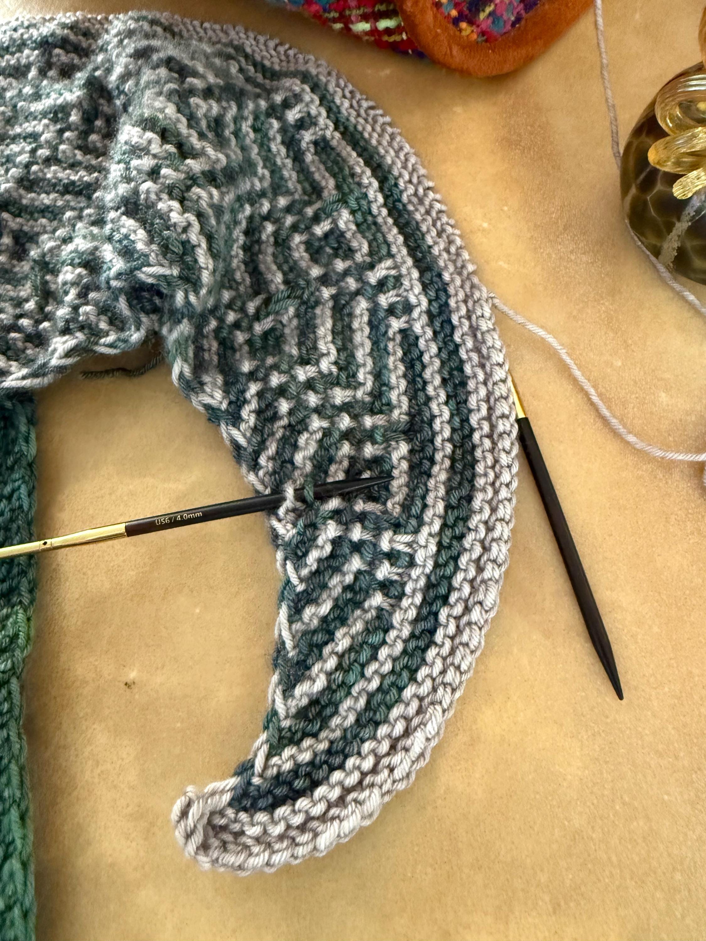 Malabrigo Seis Cabos September 2025 KAL kit in Wabi Sabi and Pearl to make the Barnstable Shawl. Pattern by Lisa Hannes is on Ravelry for purchase as the KAL ended.