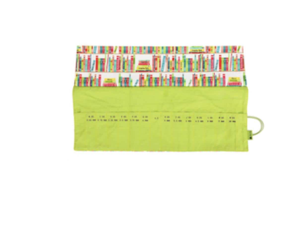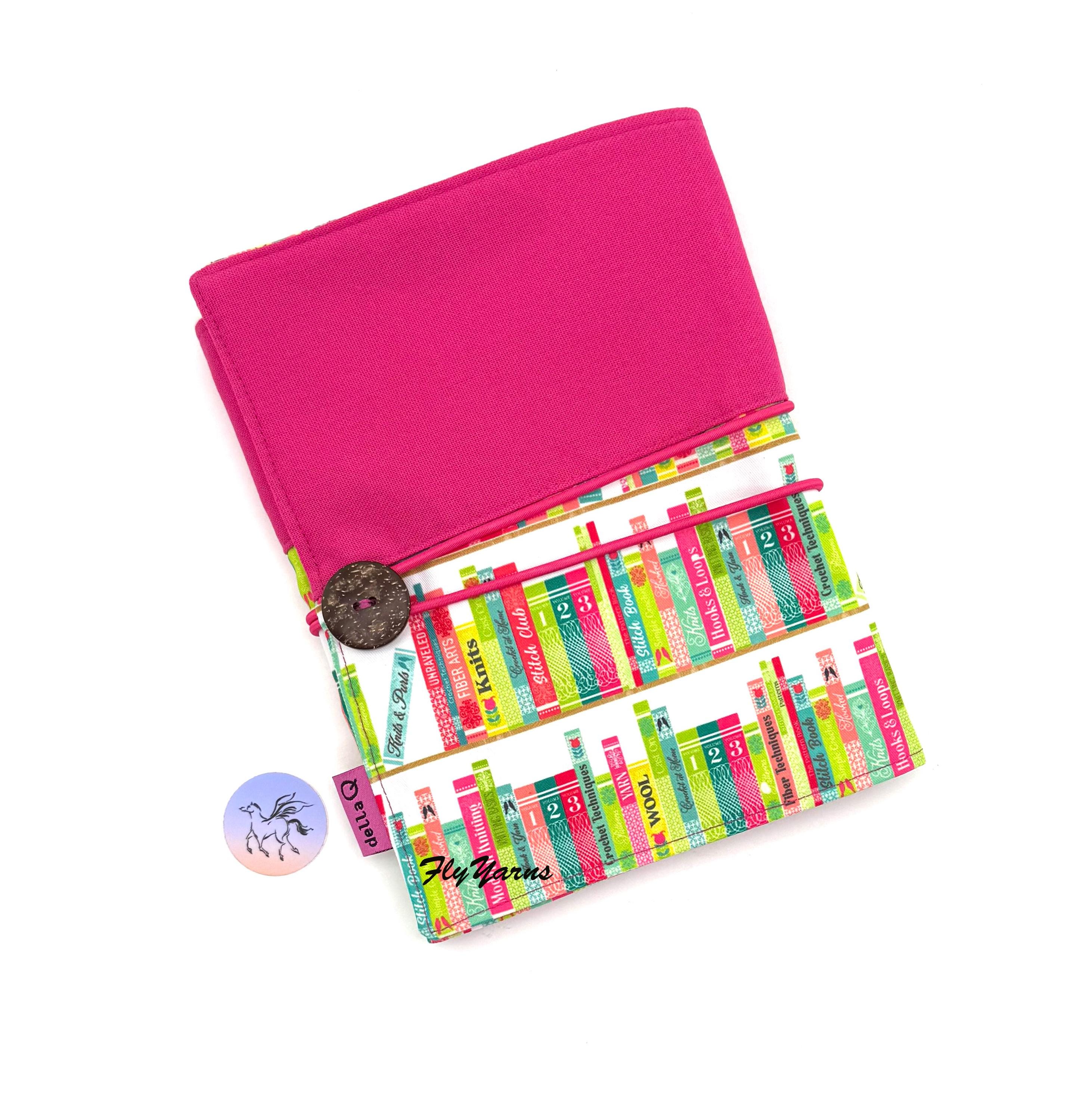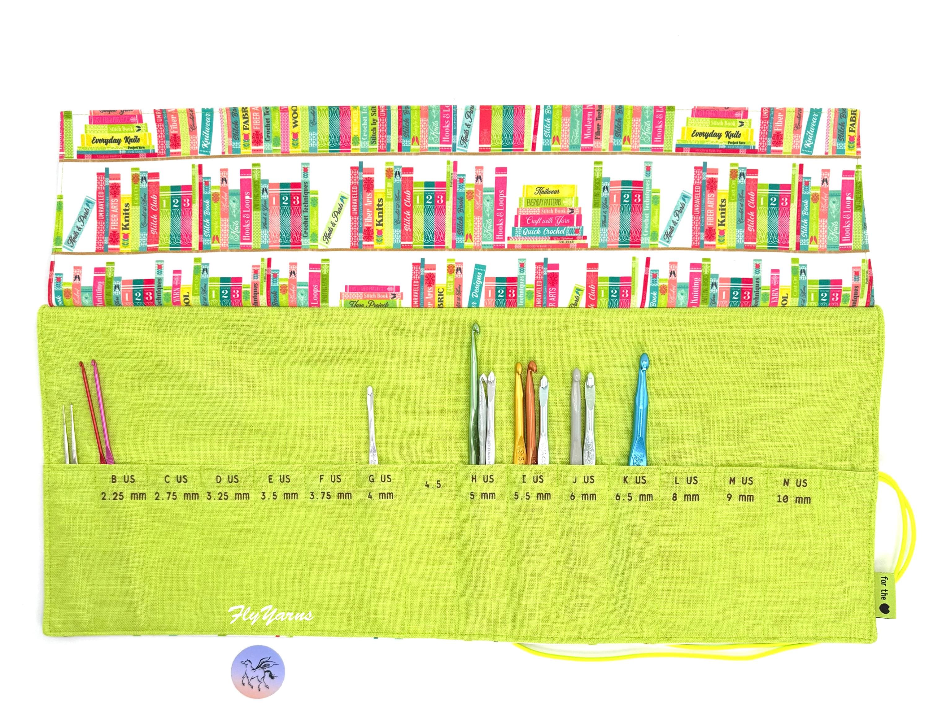 Della Q Crochet Hook Case: Library Print Linen Sky, Fuchsia, Lime Hook Roll