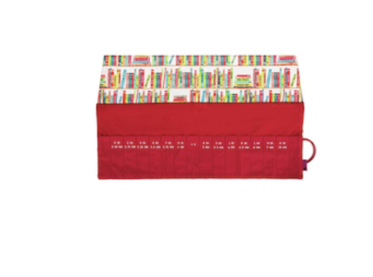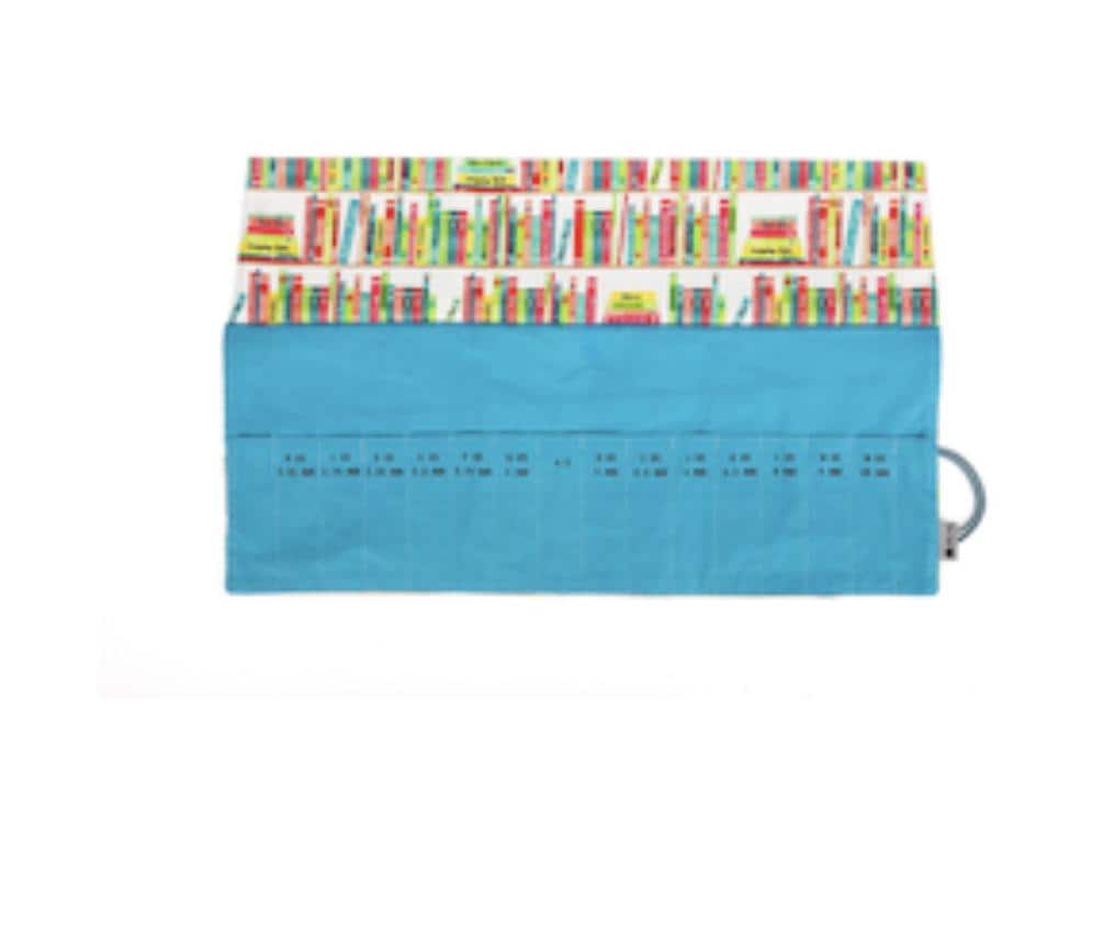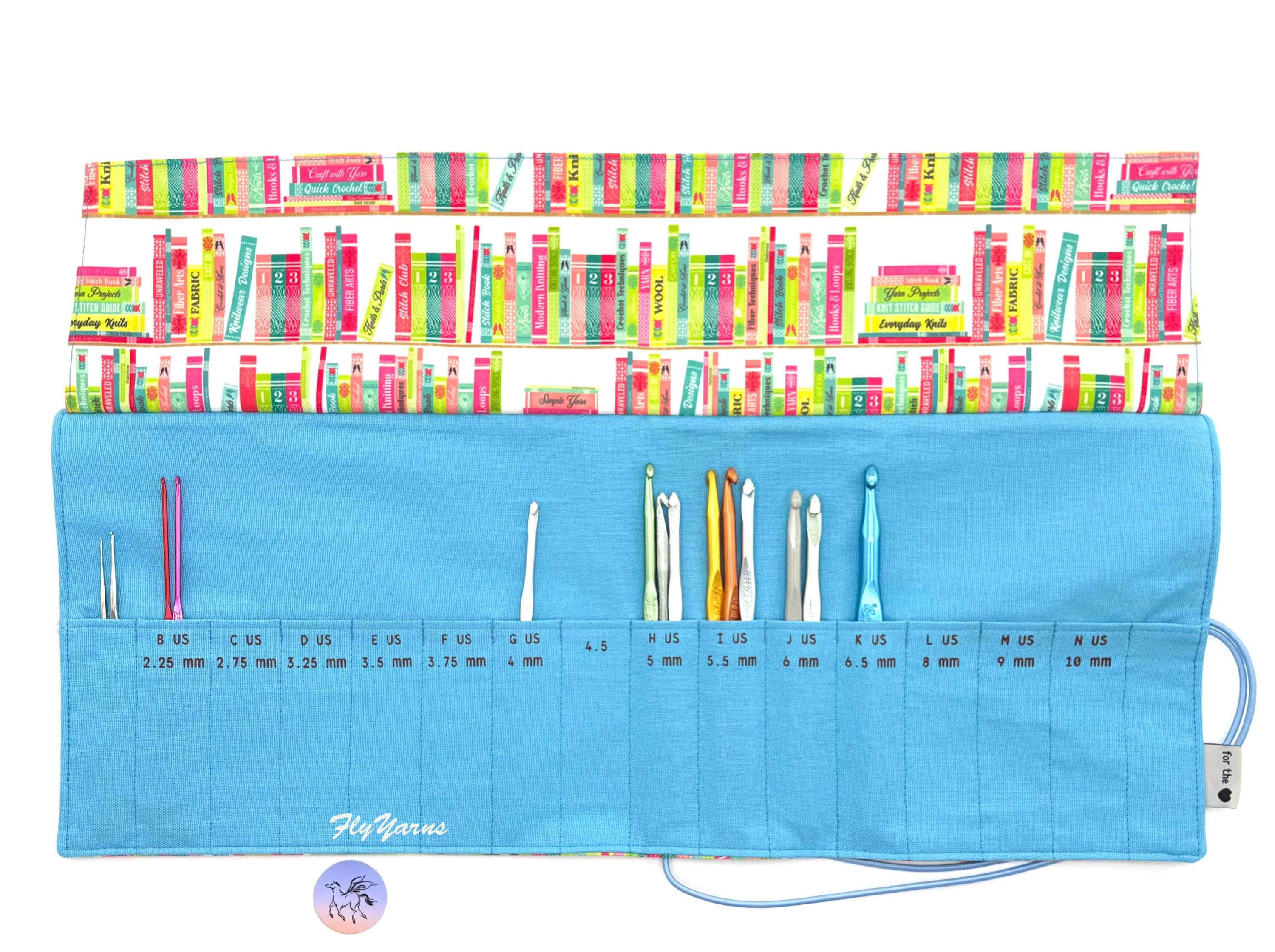 Della Q Roll in Library Print LINEN will wrangle in your crochet hook stash. A crochet case you'll want to own whether you are an avid crocheter or a knitter who has accumulated your grandmother's crochet hooks. The pockets are wide enough to hold the Clover Soft Touch or Addi Swing hooks. This crochet case for crochet hooks in beautiful Sky, Fuchsia and Lime is a luxury to handle and hold. Please note there is little consistency of US and Metric equivalents within the industry. Della Q labels rely on the Craft Yarn Council.