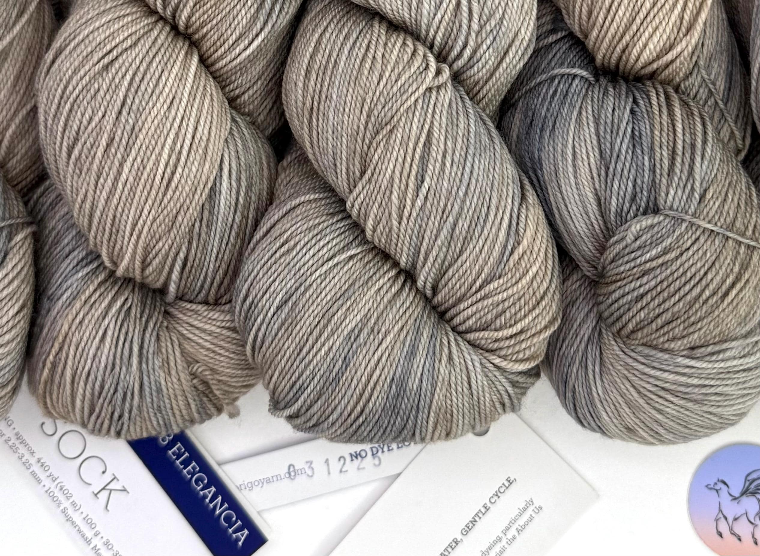 Malabrigo Sock Yarn, Elegancia , is 100% Merino wool. Spun from luxurious merino and treated to make it machine washable for easy care. Kettle-dyed beautifully soft yarn in a fingering weight "Sock" is an excellent yarn for hand knitters to create unique and exquisite socks, shawls and sweaters. This is a plied hand-dyed super wash yarn which makes it machine washable. This listing is for the color ELEGANCIA Beige & Gray Sock Yarn. Photos of the hanks in this listing. Dye Lot 03 12 24