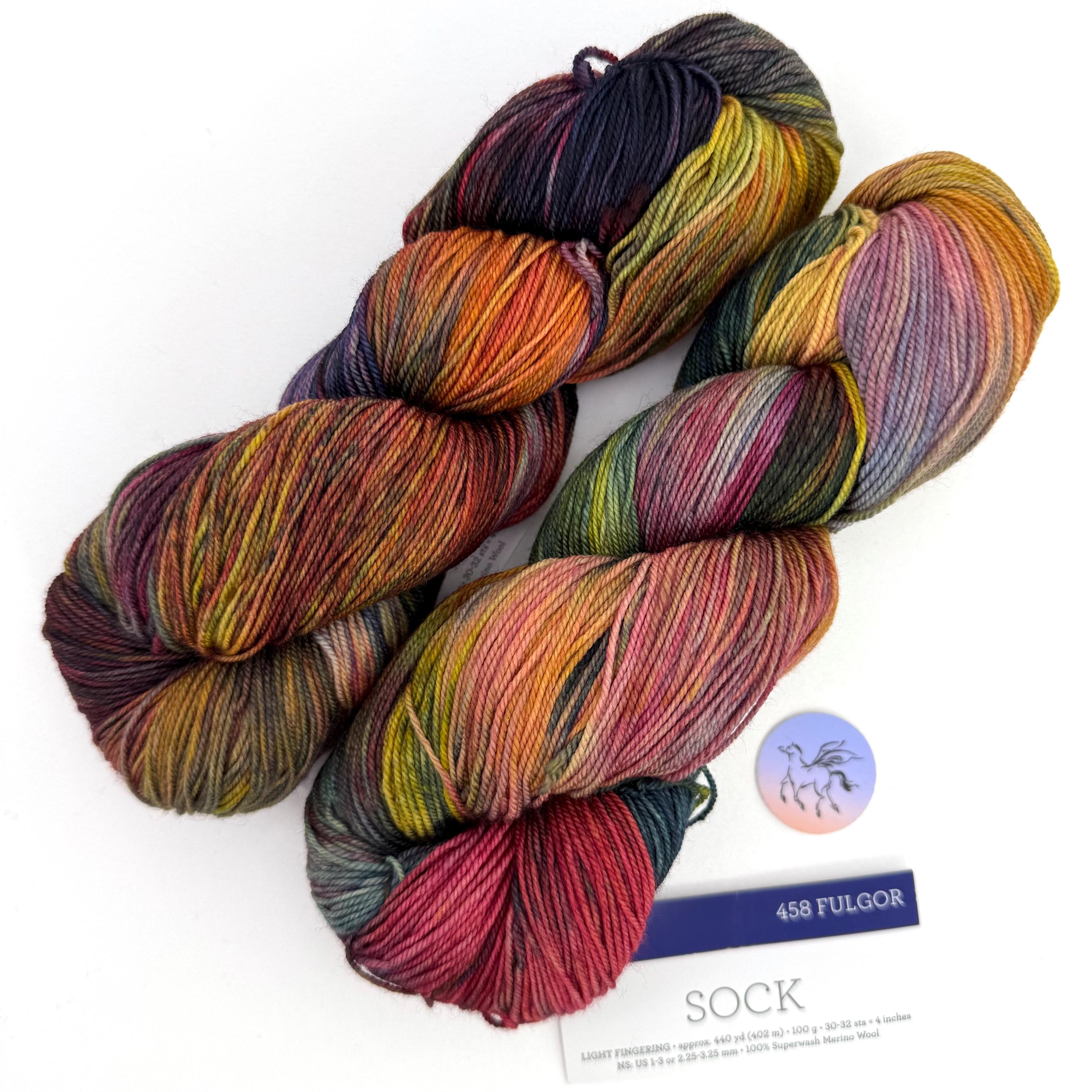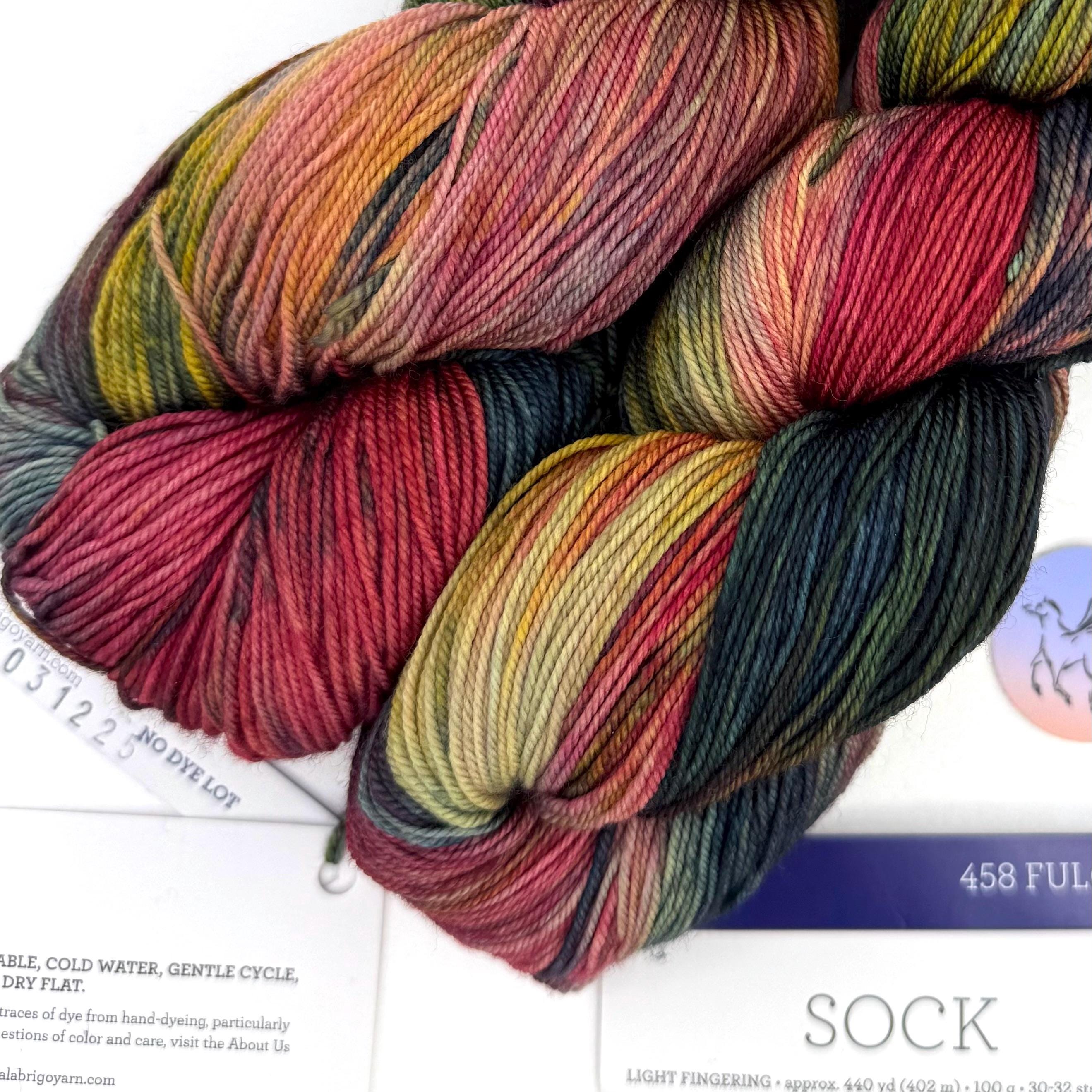 Malabrigo Sock Yarn, Fulgor 458, is 100% Merino wool. Spun from luxurious merino and treated to make it machine washable for easy care. Kettle-dyed beautifully soft yarn in a fingering weight "Sock" is an excellent yarn for hand knitters to create unique and exquisite socks, shawls and sweaters. This is a plied hand-dyed super wash yarn which makes it machine washable. This listing is for the color FULGOR 458 Orange, Green, Red & Gold Sock Yarn. Dye Lot 03 12 25