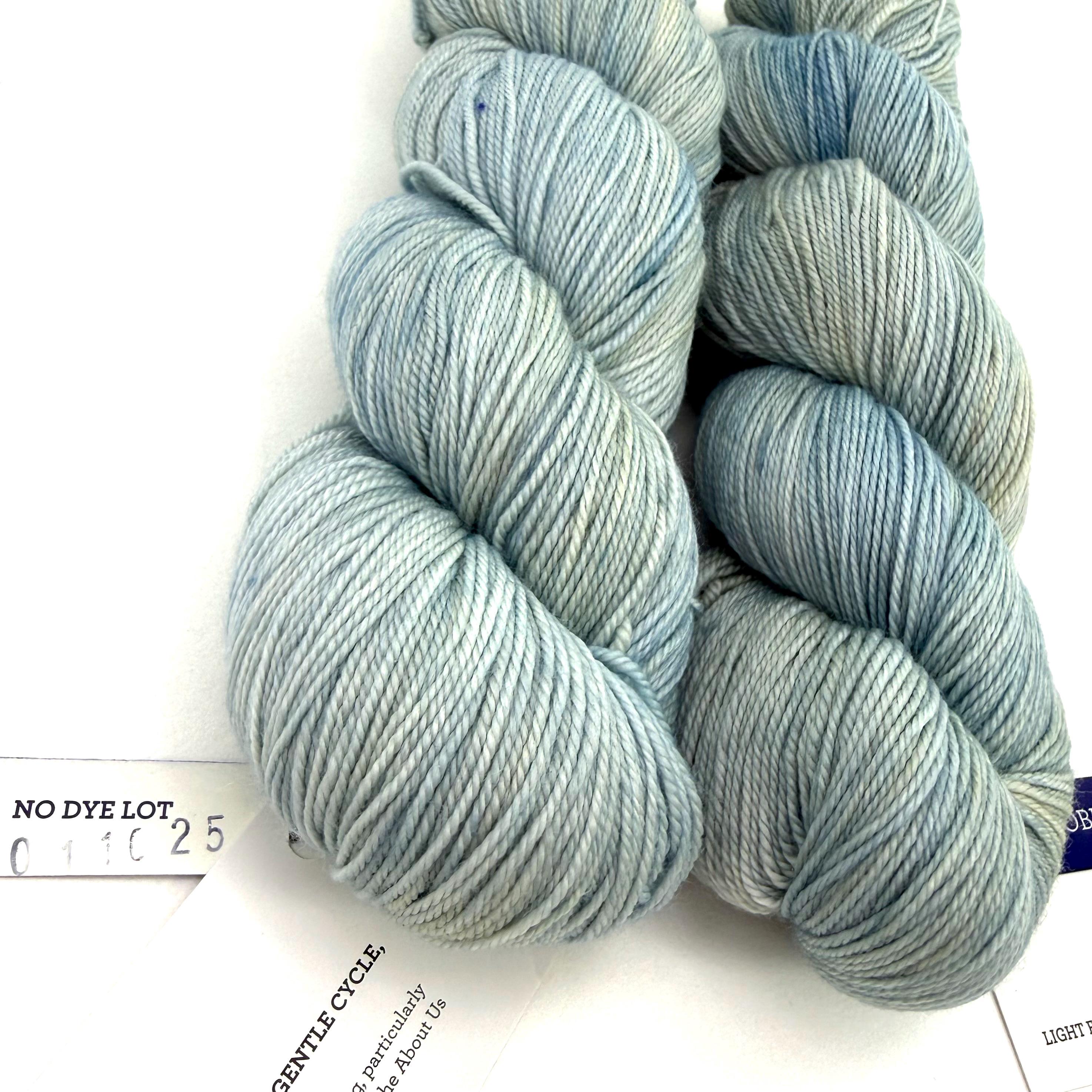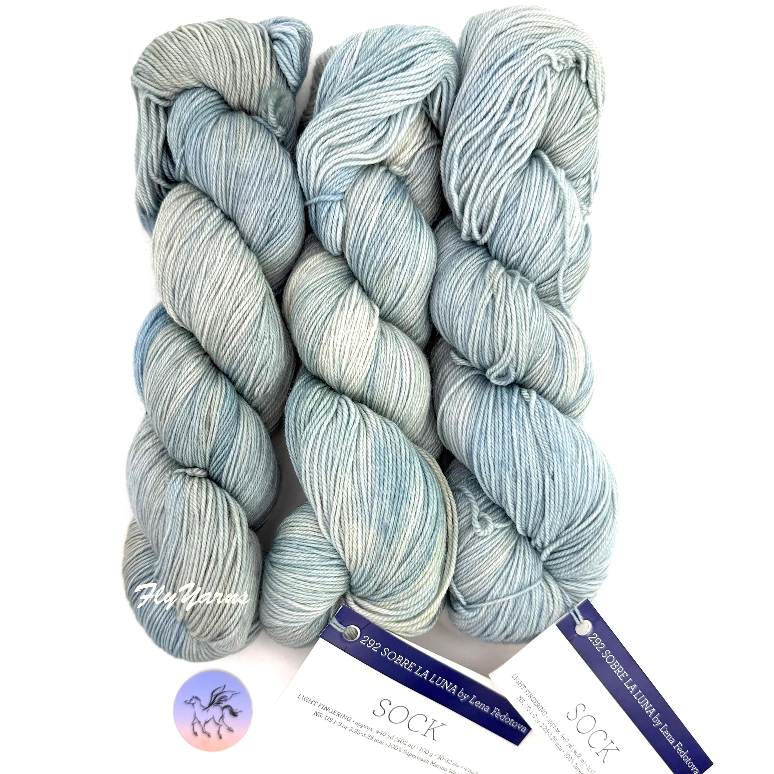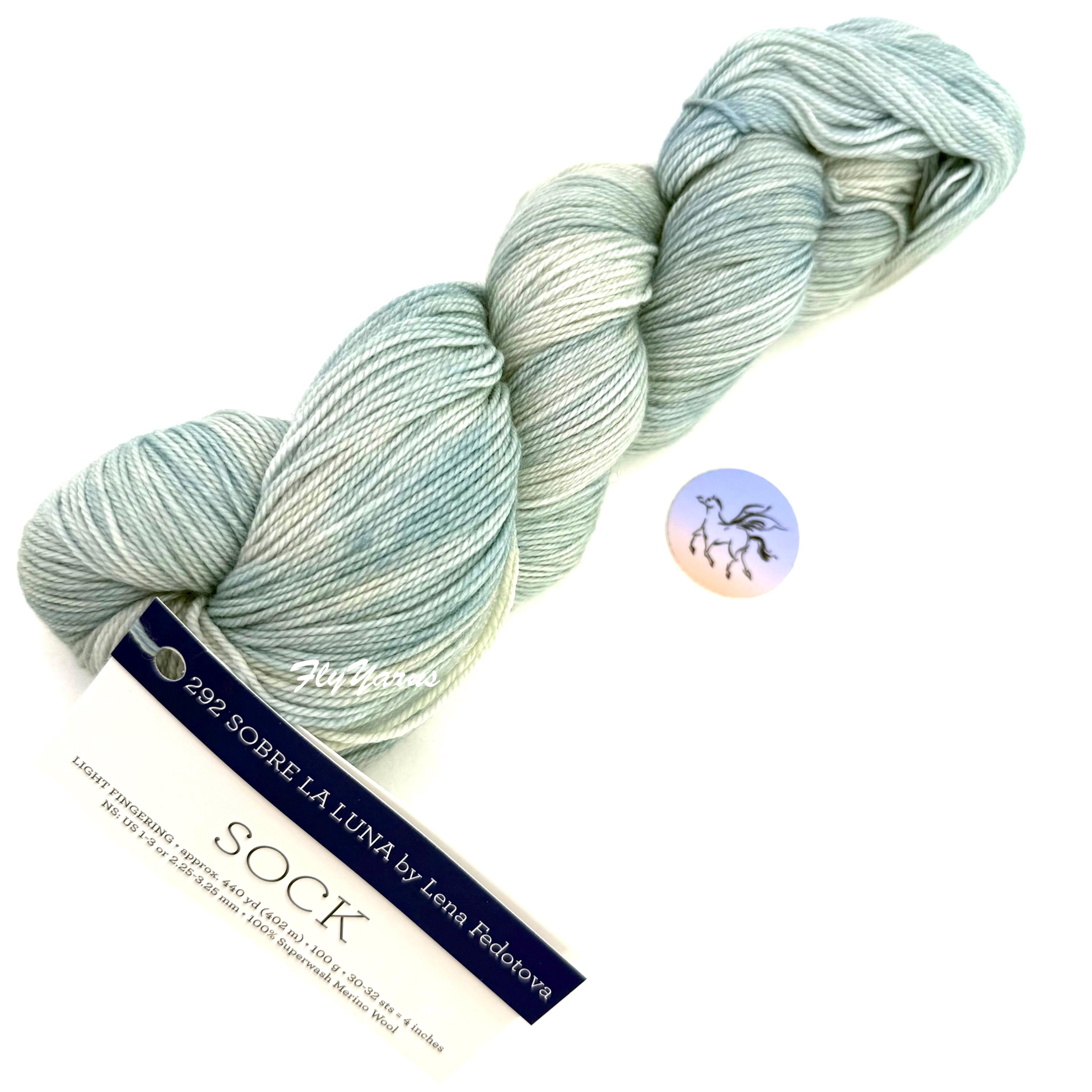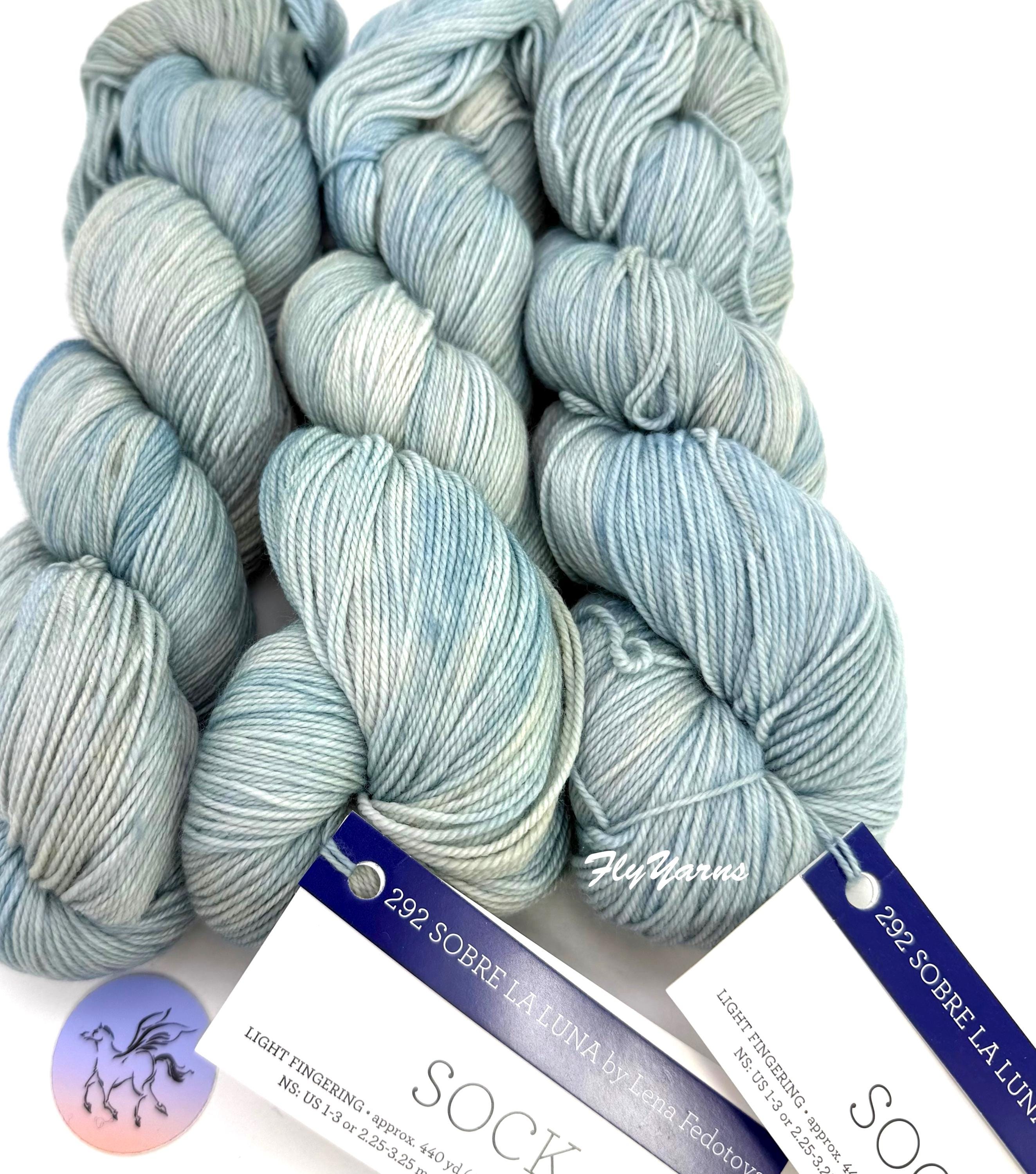 Malabrigo Sock Yarn, Sobre La Luna, is 100% Merino wool. Spun from luxurious merino and treated to make it machine washable for easy care. Kettle-dyed beautifully soft yarn in a fingering weight "Sock" is an excellent yarn for hand knitters to create unique and exquisite socks, shawls and sweaters. This is a plied hand-dyed super wash yarn which makes it machine washable. This listing is for the color Sobre La Luna Sock Yarn By Lean Fedotova in a light blue & ivory color. Dye Lot 01 10 25