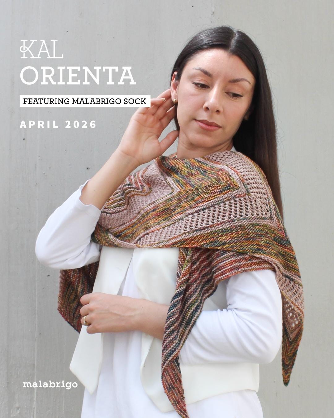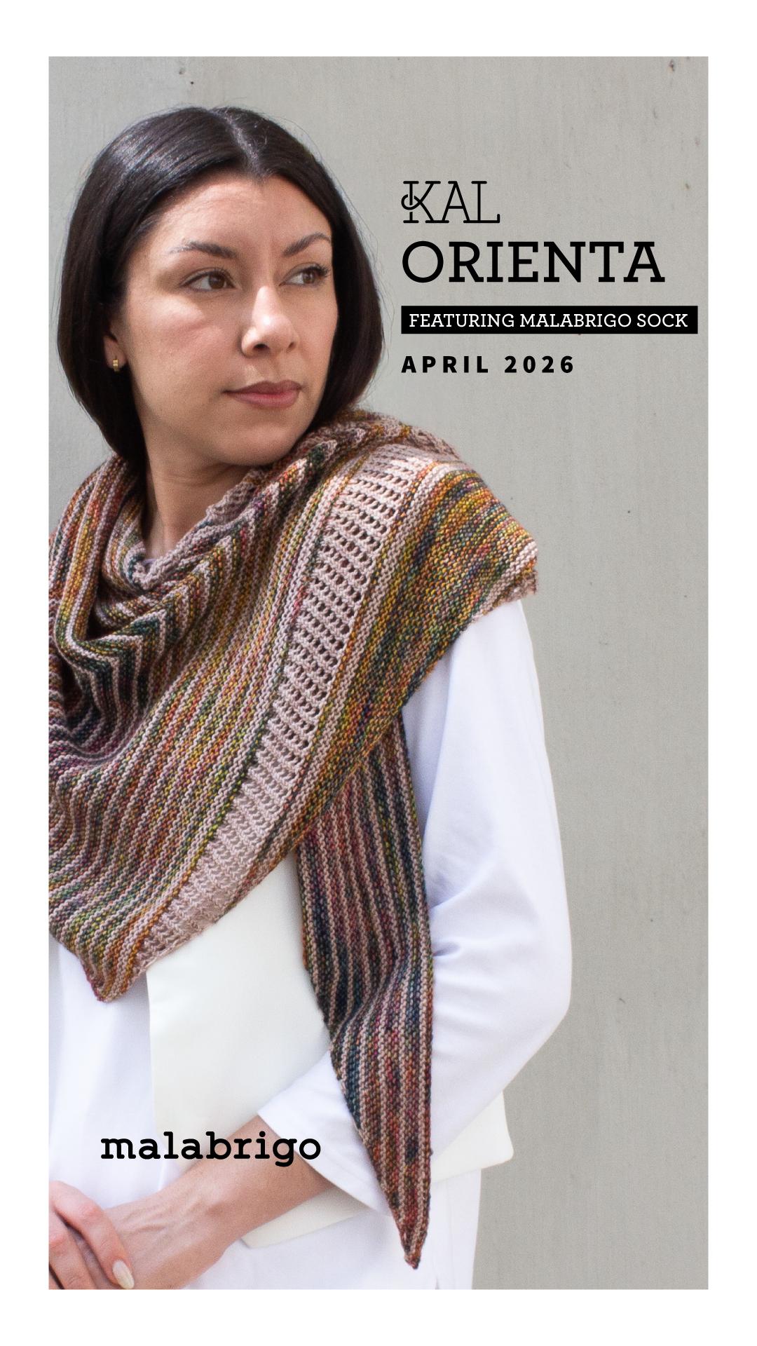 Orienta Shawl Kit in Fulgor and Three Little Pigs is for the Malabrigo April 2026 KAL. Sign up for the KAL: approximately two weeks before April 3. When you sign up for the KAL the pattern is free from Malabrigo. Orienta Shawl Pattern shown in Photo 3 is designed by Cory Boberg and knitted up in the combination of Fulgor and Three Little Pigs.