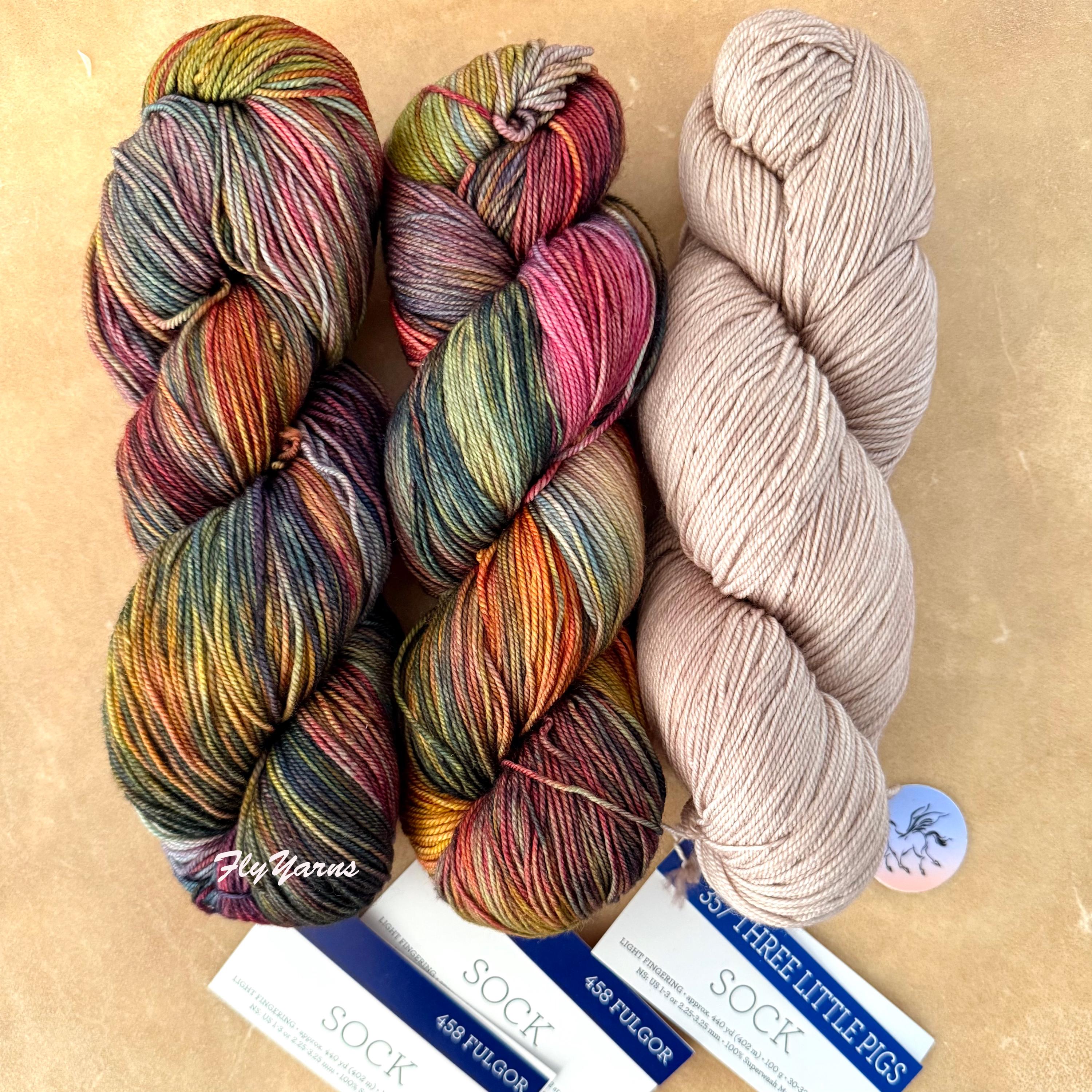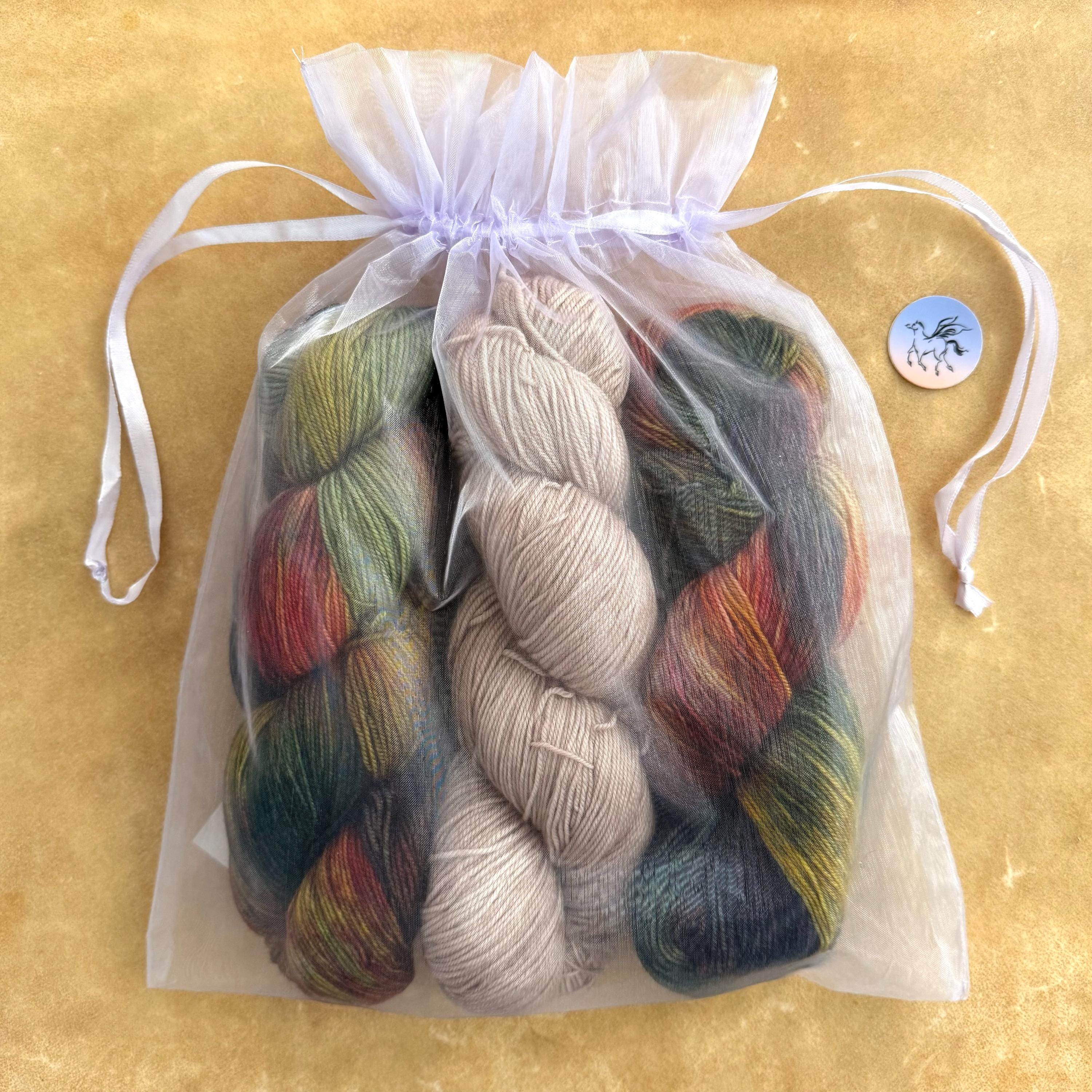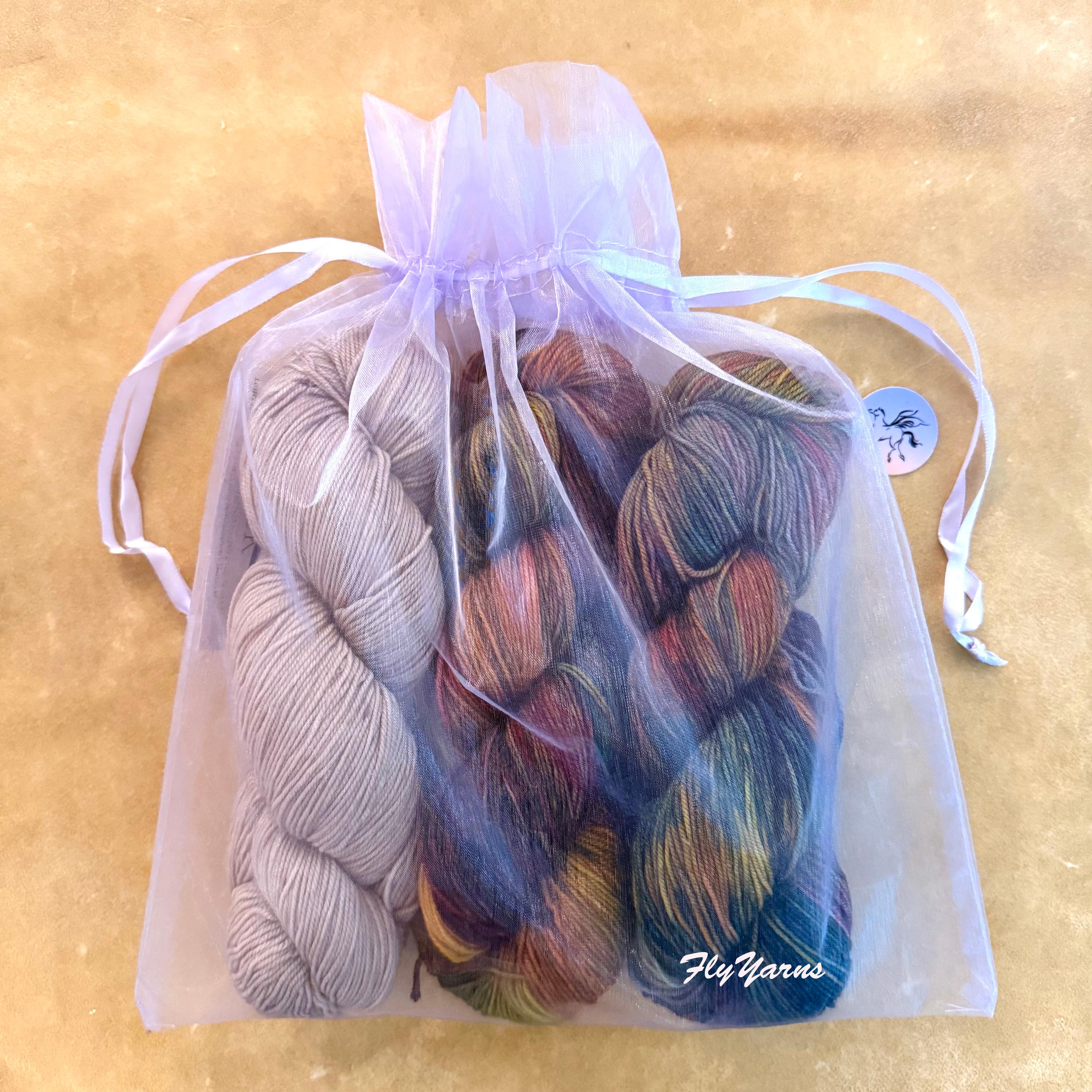 Kit contains 3 hanks of Sock Yarn that comes in a reusable, sheer organza bag and a Soak Single. (shown in photo 2.)