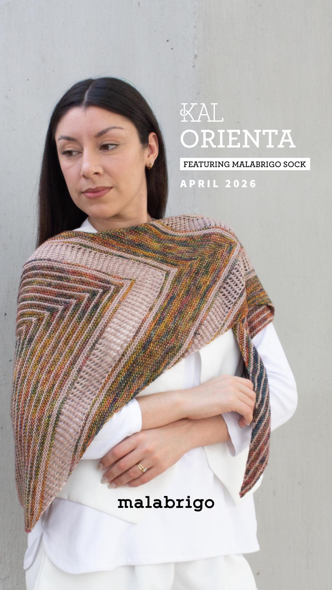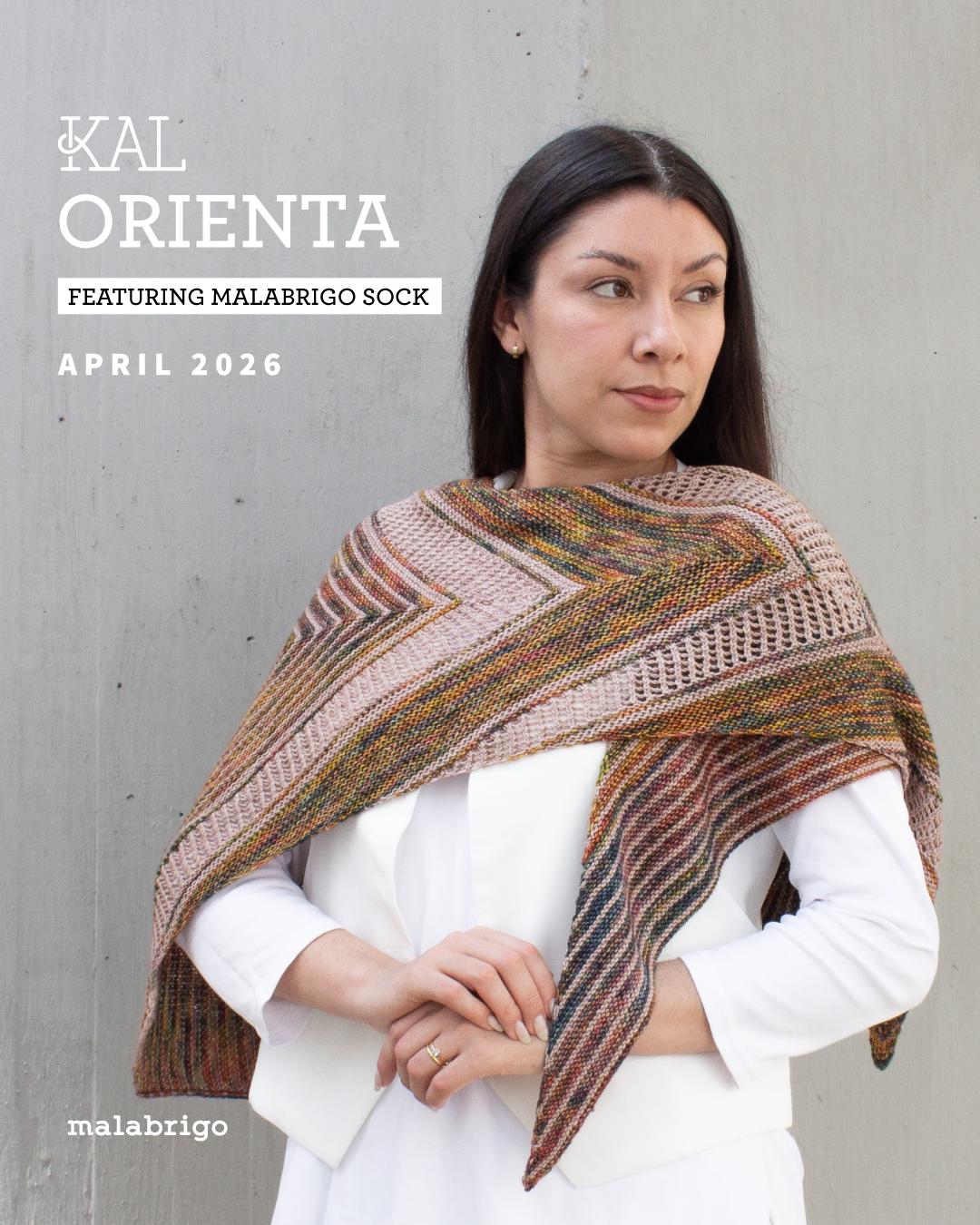 Orienta Shawl Kit in Misterio and Sand Bank is for the Malabrigo April 2026 KAL. Sign up for the KAL: approximately two weeks before April 3. When you sign up for the KAL the pattern is free from Malabrigo.