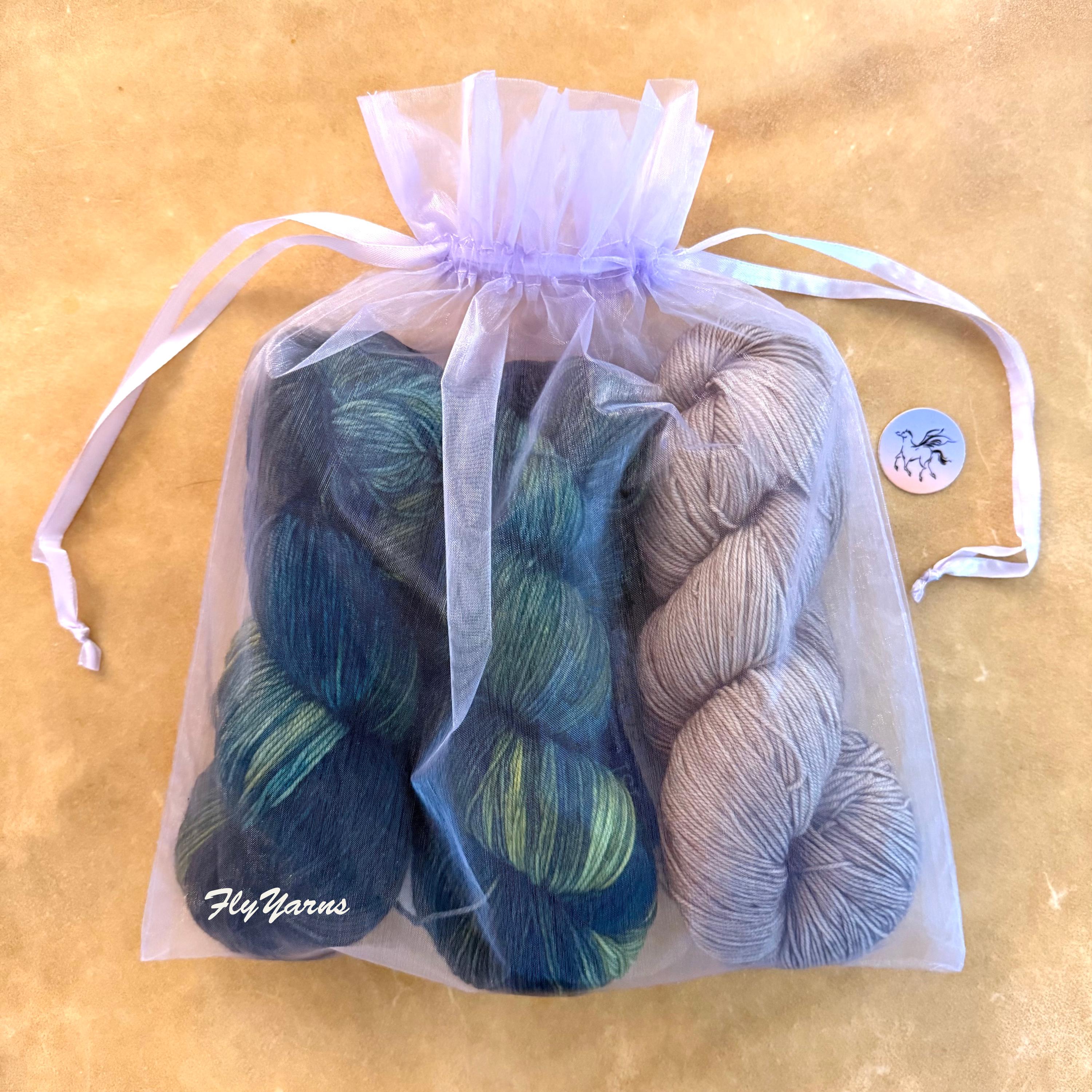 Kit contains 3 hanks of Sock Yarn that comes in a reusable, sheer organza bag and a Soak Single. (shown in photo 2.)