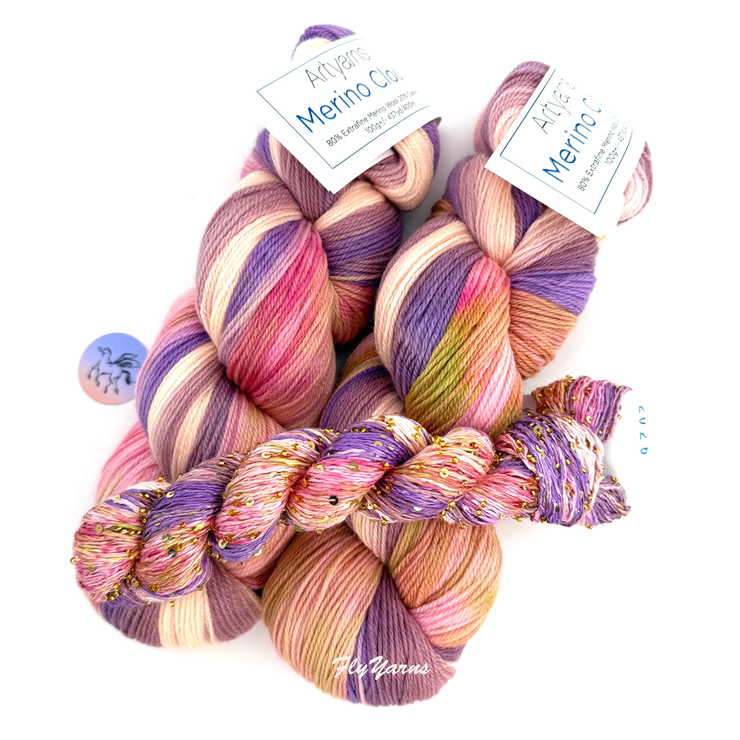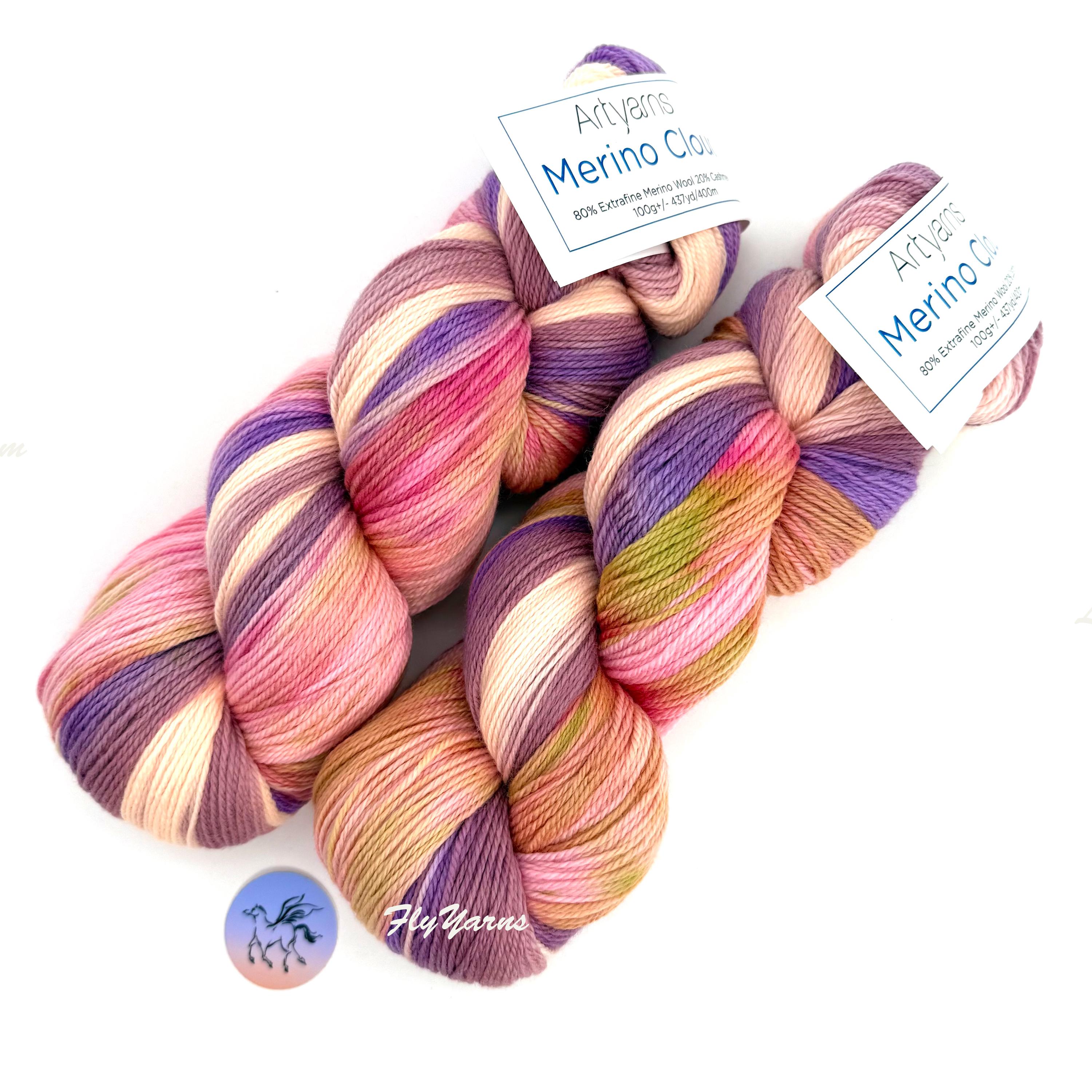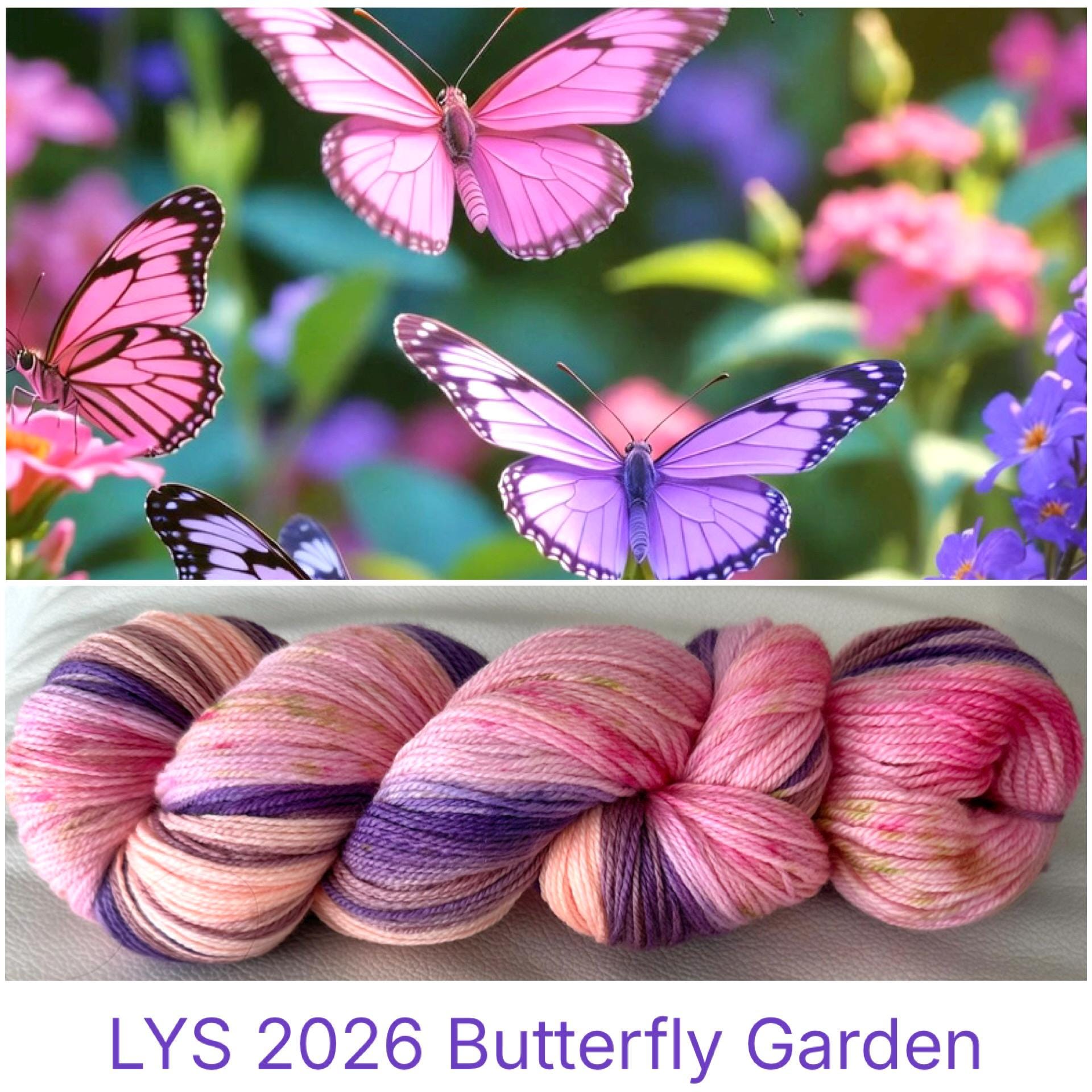 Artyarns LYS yarn for 2026 comes with an exclusive one hank lace shawl pattern using just 1 skein of Merino Cloud. This lively color with shades of pinks, purple and flecks of green with a reddish pink is based on the gorgeous butterfly garden. Local Yarn Store Day 2026 Shawl, a bottom-up knitted shawl with a unique design that results in a triangle shape, and little lace butterflies are incorporated throughout. The Butterfly Garden shawl just perfect for spring, This yarn is excellent for luxury shawls, scarves, sweaters, and is suitable for knitting, crocheting, or weaving.