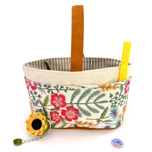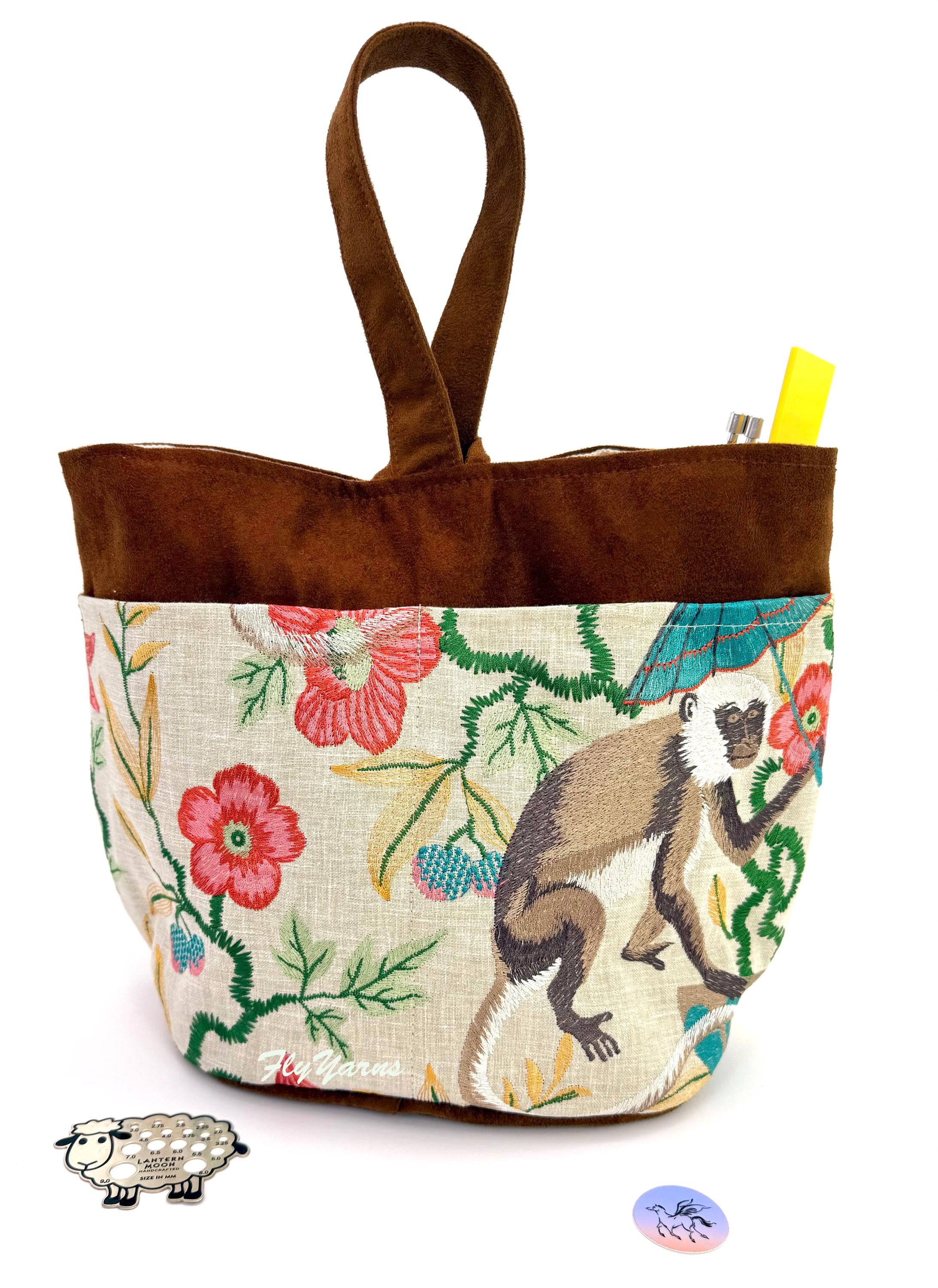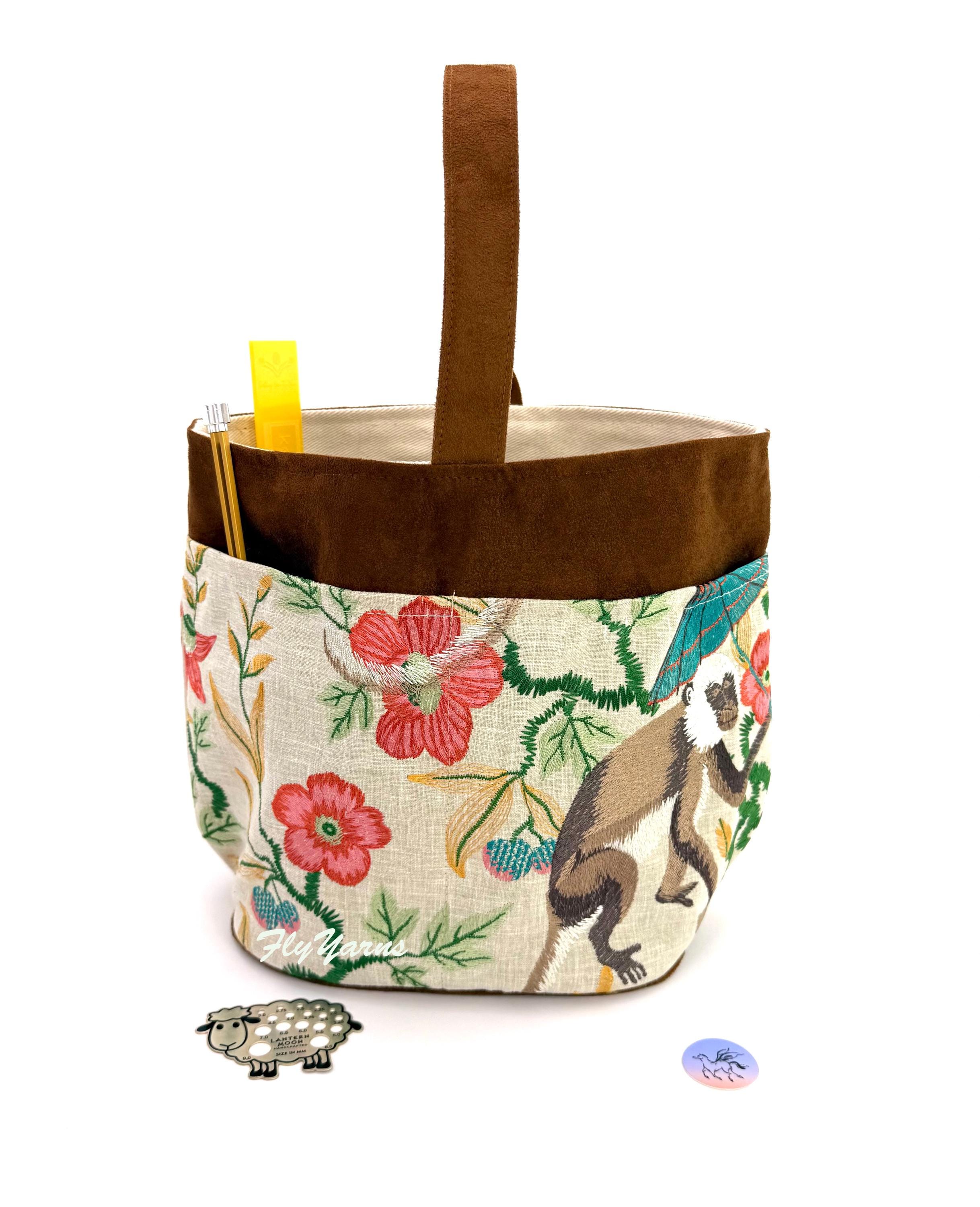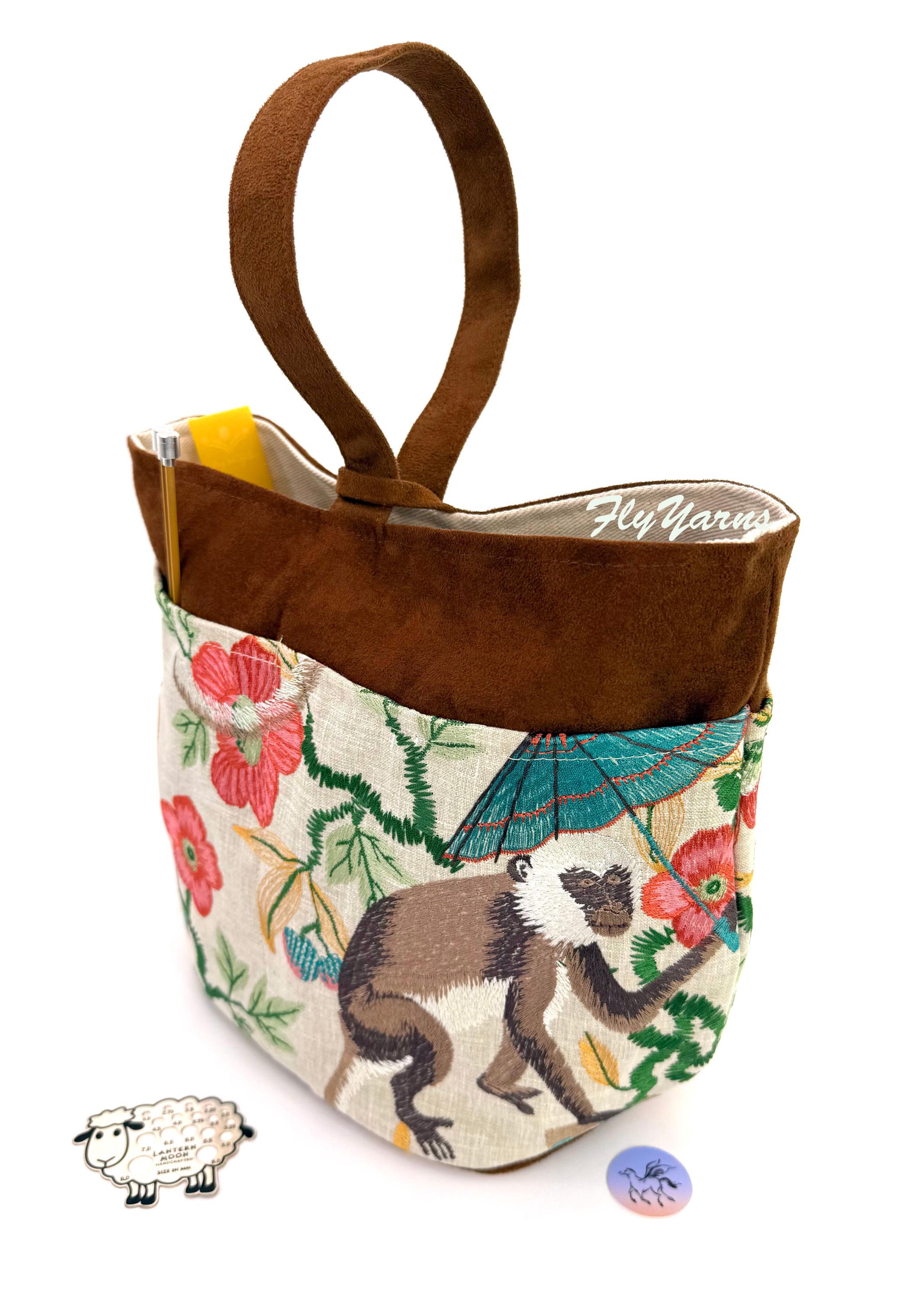 Atenti Tall Caddy in a embroidered floral design with a stunning Monkey which has 4 outer pockets and 4 inner pockets. Tall Caddy Monkey is a stand-alone, carry around organizer. It’s fully lined in water resistant taffeta with four inside pockets and plenty of interior room to hold your knitting, gadget bag or Ipad. Thread the brown ultra suede handle through the closure loop to secure and carry. This exquisite, embroidered caddy has 8 pockets - so perfect to store all your tools and notions. Monkey tall caddy is an excellent gift for knitters and crafters.