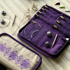 Khadi Silk Zip Case - The case is made with Khadi silk, a historically significant Indian material. The exterior features lovely floral motif embroidery. Inside there is room for multiple interchangeable needle tips and cords. The zippered case keeps all contents safely stored and organized. These needle sets are designed by artisans for generations of use by skilled knitters.