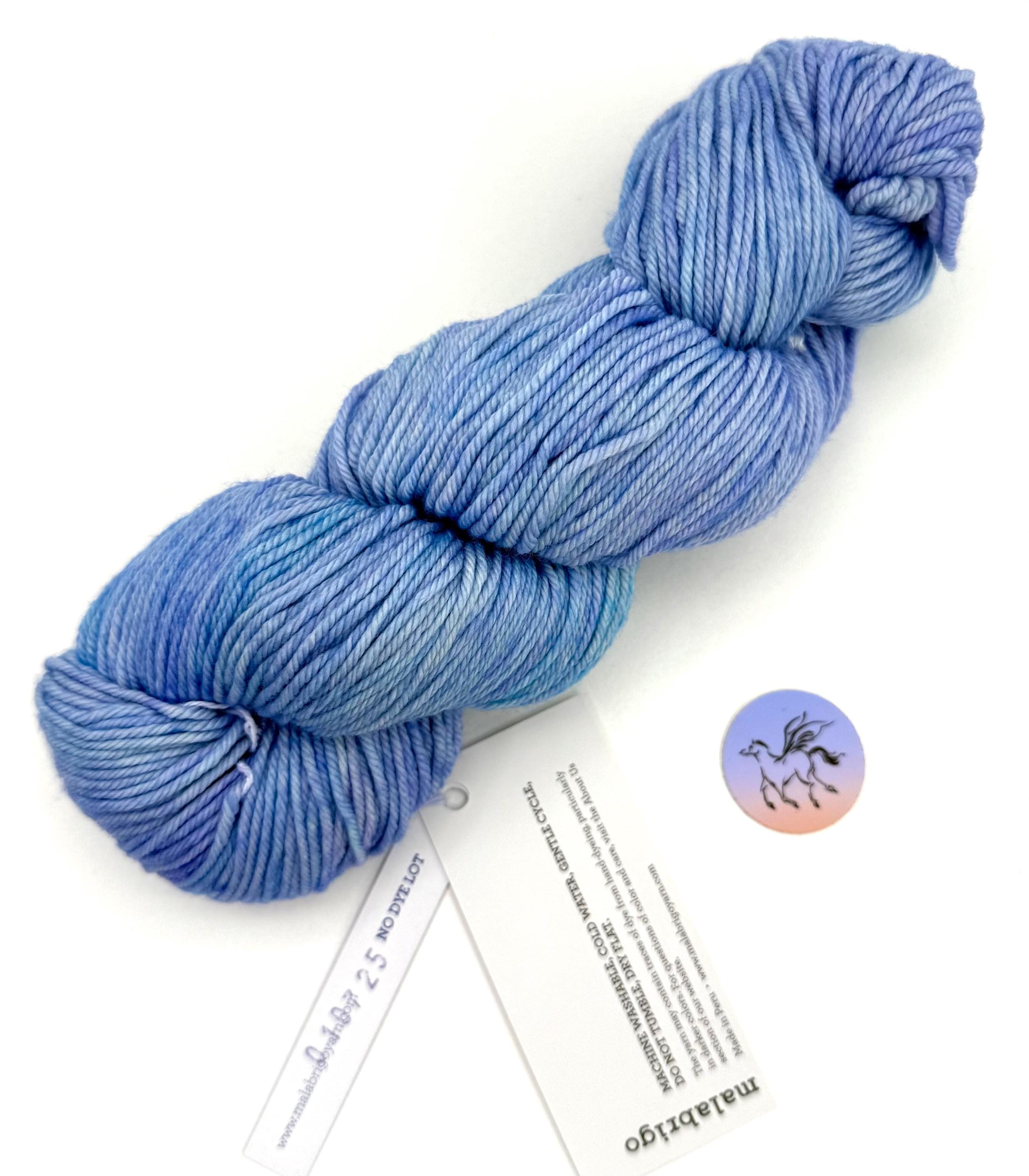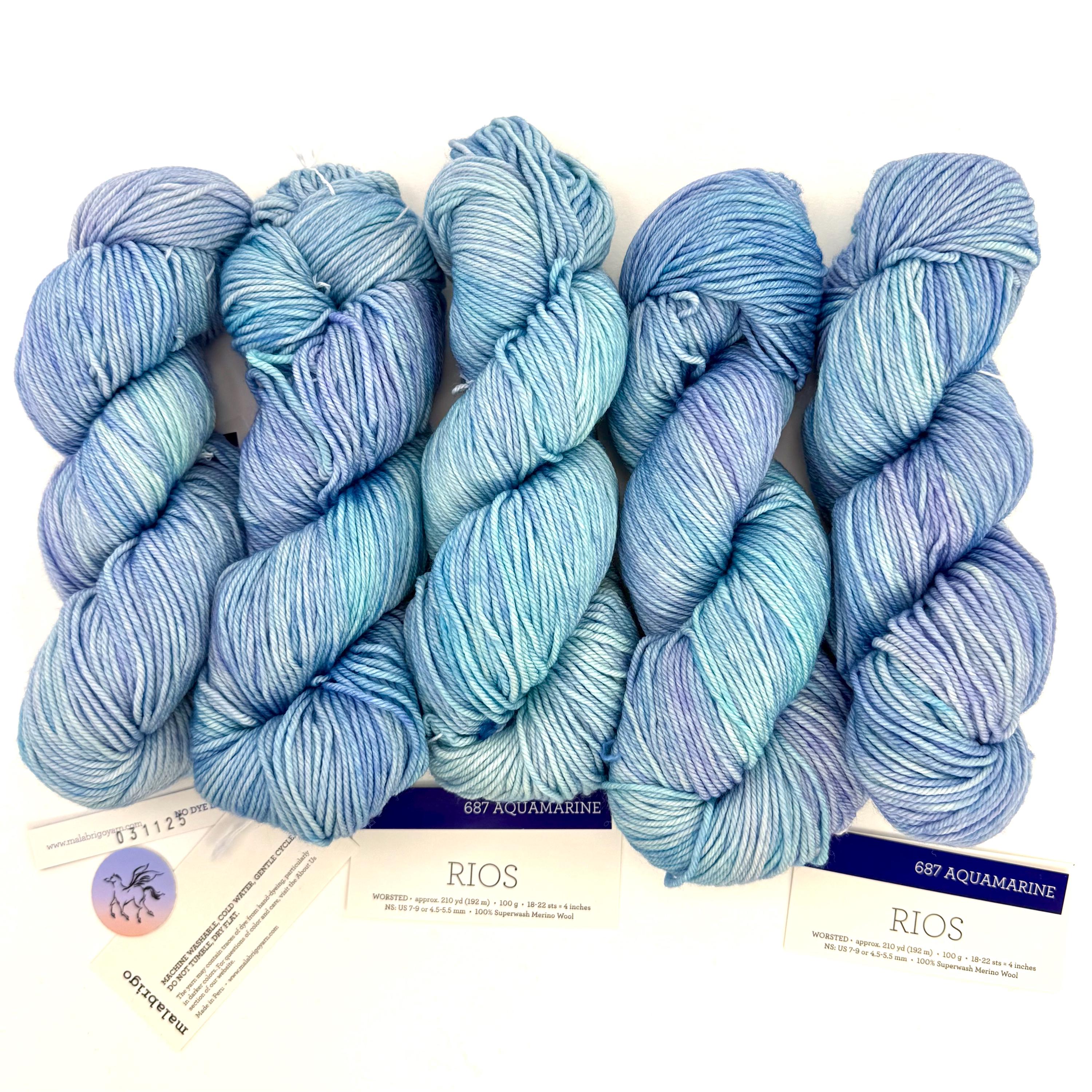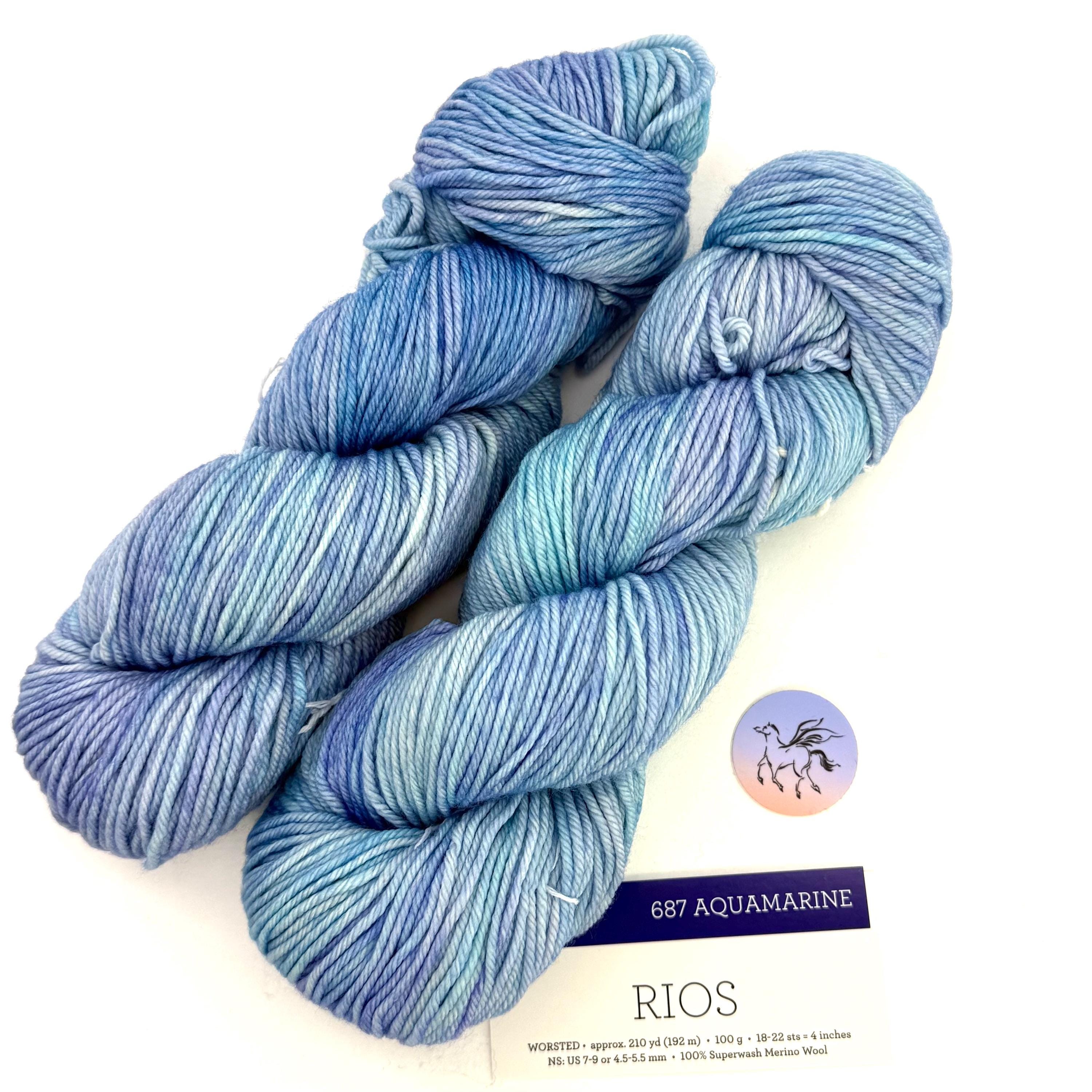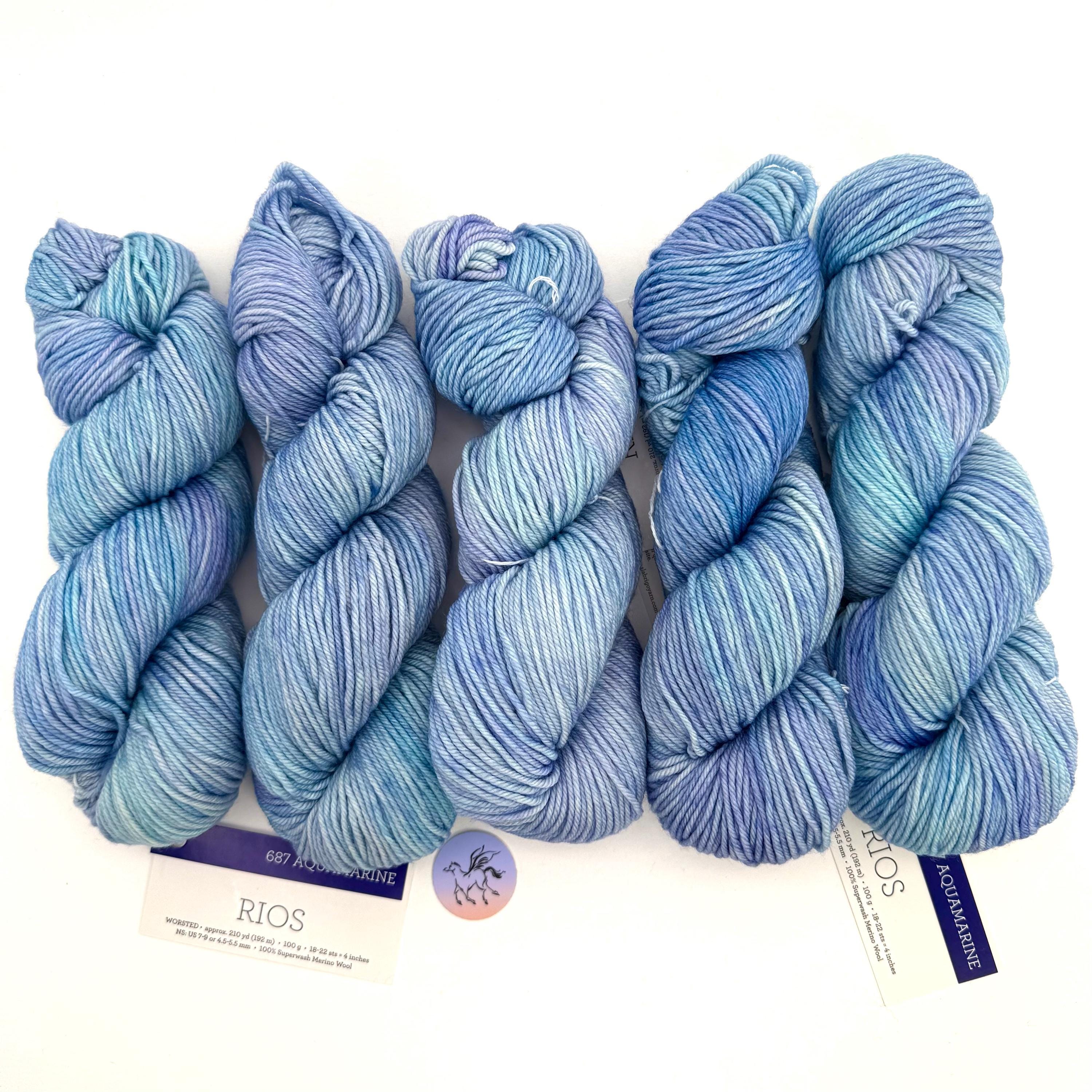 Malabrigo Rios Yarn is plied 100% pure Merino Superwash wool which is kettle dyed. This listing for the color "Aquamarine" Rios, a Blue hand dyed worsted weight yarn, is a 10 ply wool. Malabrigo creates 10 hanks in a dye lot and all of these beautiful Rios Aquamarine . A gorgeous kettle dyed Merino Wool in a blues and a touch of lavender is Malabrigo's Aquamarine.