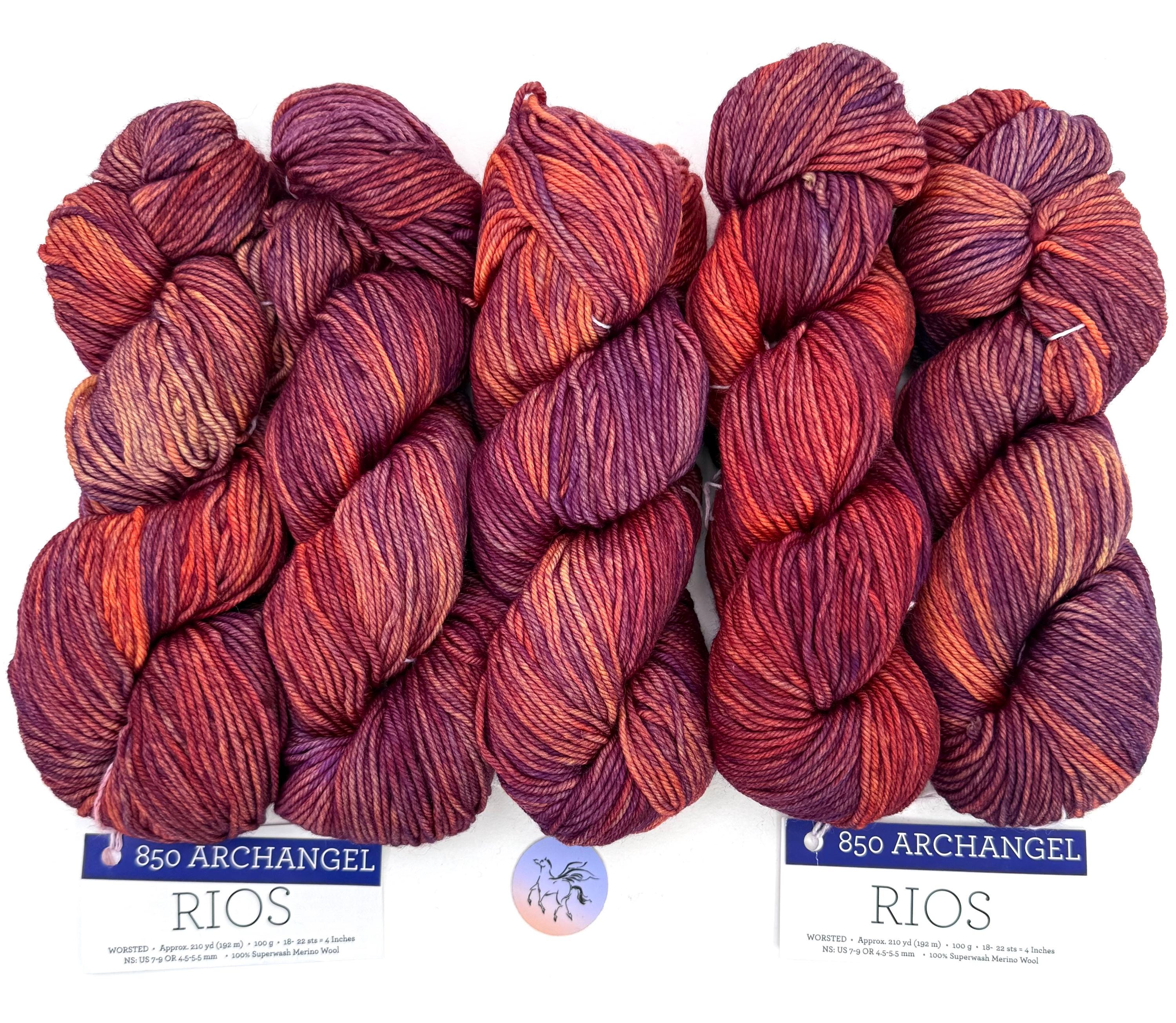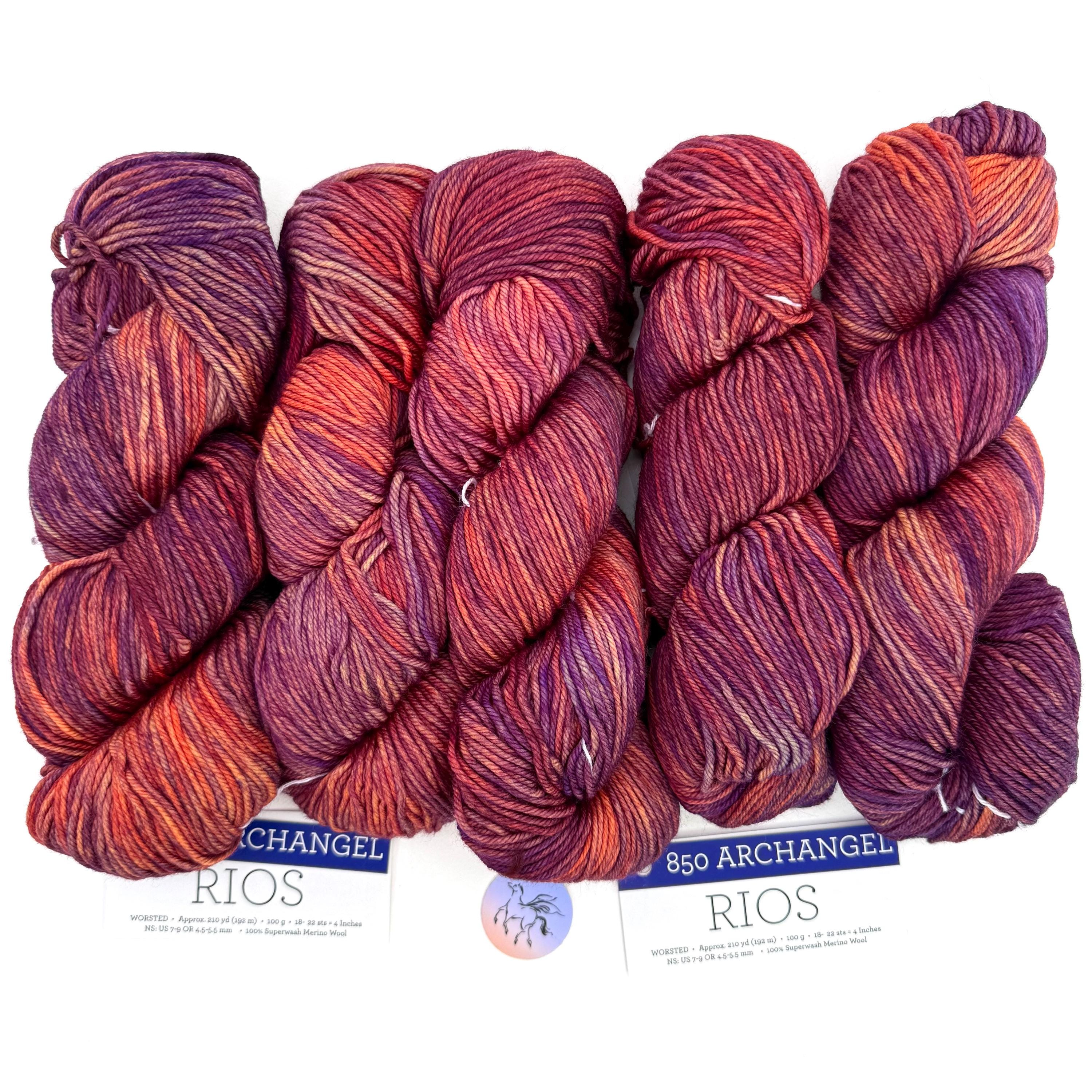 Malabrigo Rios Yarn is plied 100% pure Merino Superwash wool which is hand-dyed. This listing for the color ARCHANGEL Rios 850, is a mulit-colored, worsted weight yarn, 10 ply wool. Malabrigo creates 10 hanks in a dye lot and all of these beautiful Rios Archangel yarn hanks are the same dye lot. A gorgeous hand-dyed Merino wool in a reds, oranges, gold and purple is Malabrigo's unique Archangel. Priced per hank. No dye lot.
