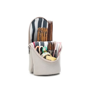 Della Q Double Point Needle Roll in Linen will wrangle in your needle stash. "The" knitting needle case for double point needles choose a linen, luxury case in Slate, Wine, Pebble, & Dark Gray. If you LOVE double point needles and you own two in every size from 0 to 10.5 US, it's time to organize them in something other than those plastic sleeves or "ahem" your special needle drawer. With two rows of fourteen numbered pockets, and two unnumbered pockets this roll accommodates: